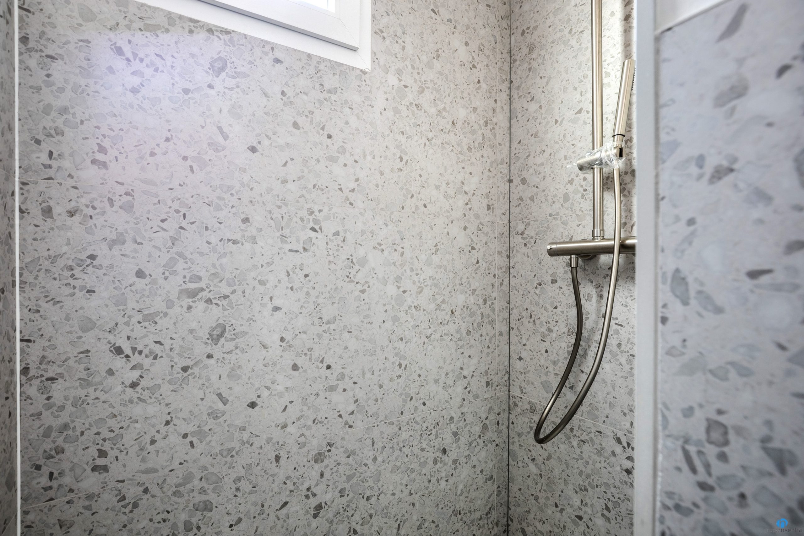 La vivenda compta amb dos banys totalment renovats. Cada bany inclou lavabo amb moble d’emmagatzematge, vàter i plat de dutxa amb mampara. Un dels banys destaca pels tons negres i grisos, creant un disseny elegant i amb caràcter.