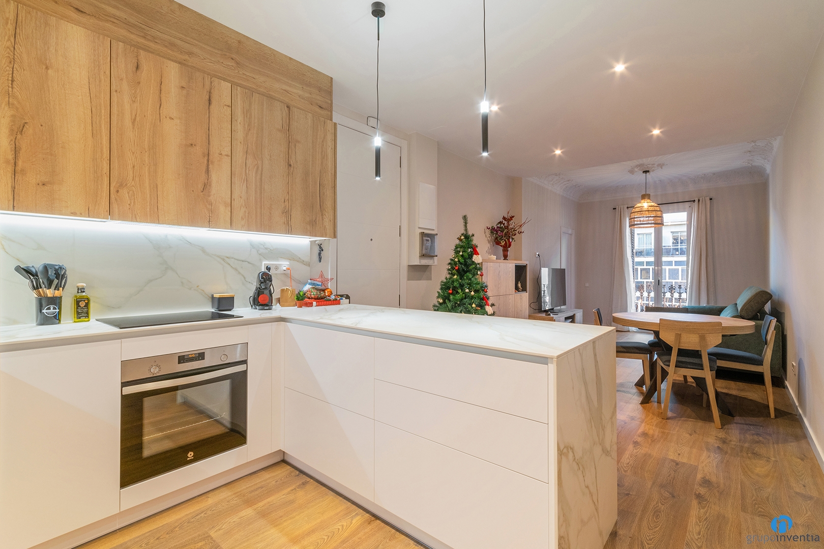 La cuina es troba just a la dreta de l’entrada del pis. Es tracta d’una reforma de cuina oberta i amb distribució en forma d’U. A més d’un disseny de cuina integrat a la resta del pis, està completament equipada.