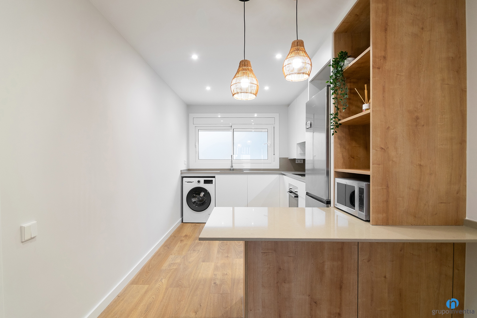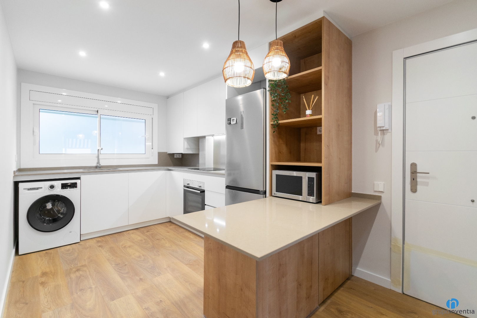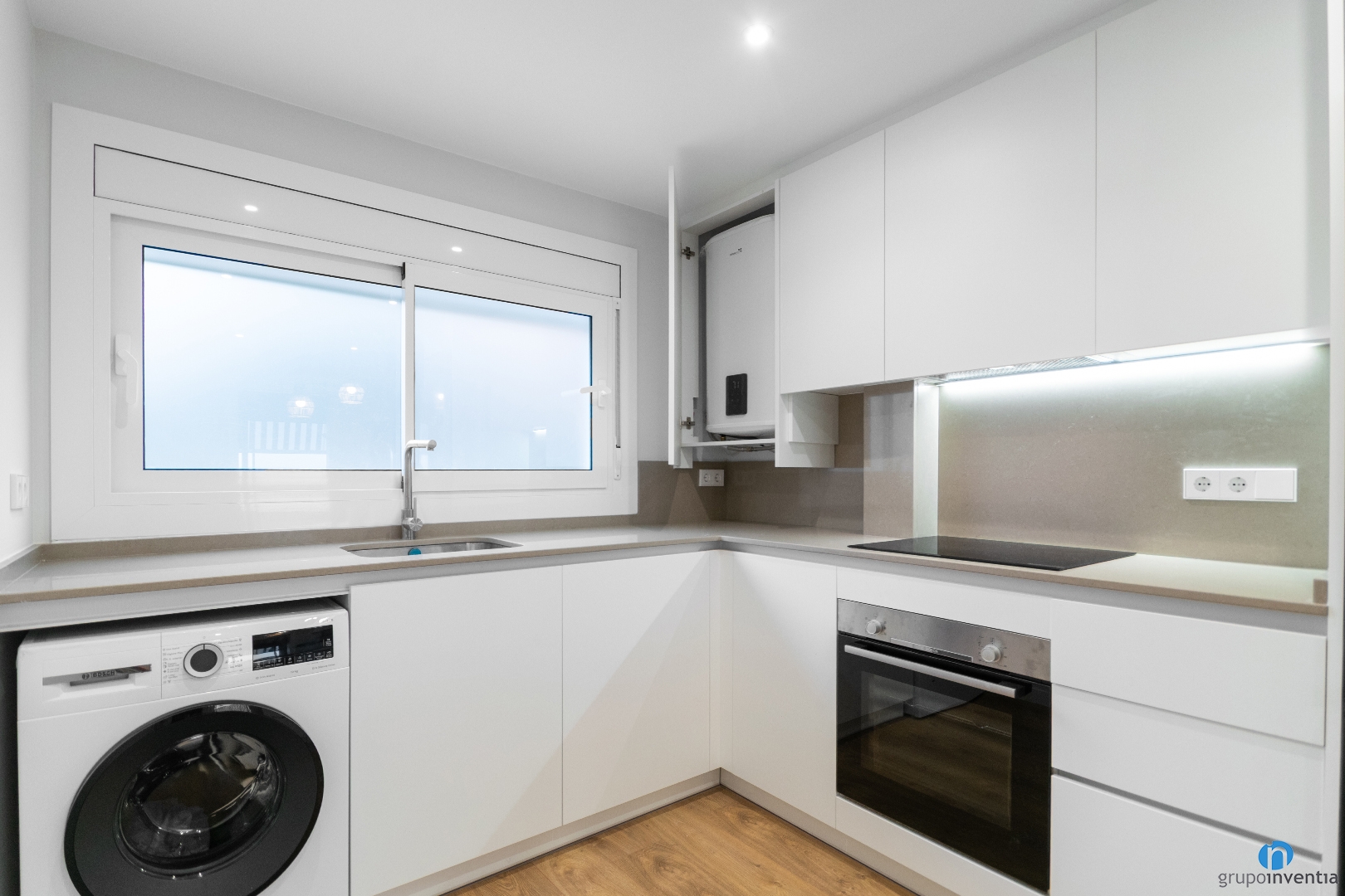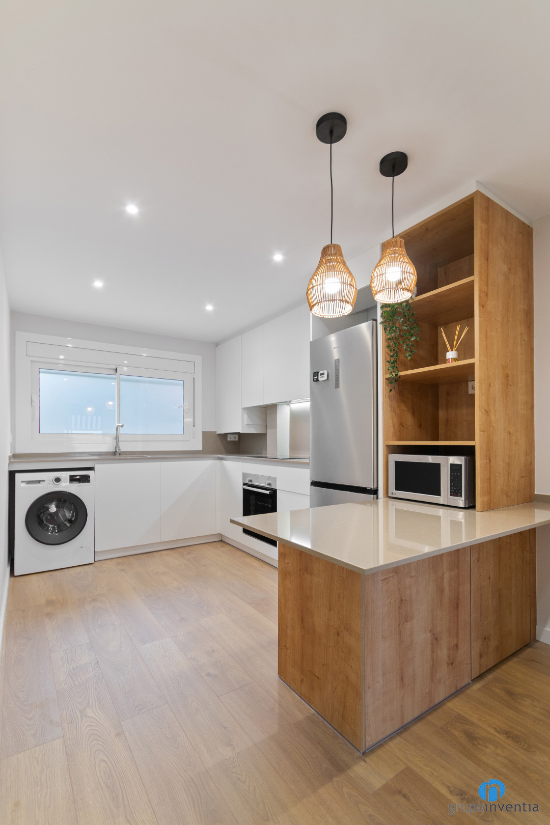 L’encimera principal té forma de L i ofereix una àmplia superfície de suport i treball. Sobre ella s’hi han instal·lat la pica i la placa de cocció, ubicades estratègicament. A la part inferior del moble de cuina s’hi han integrat la rentadora i el forn, mantenint una imatge ordenada.