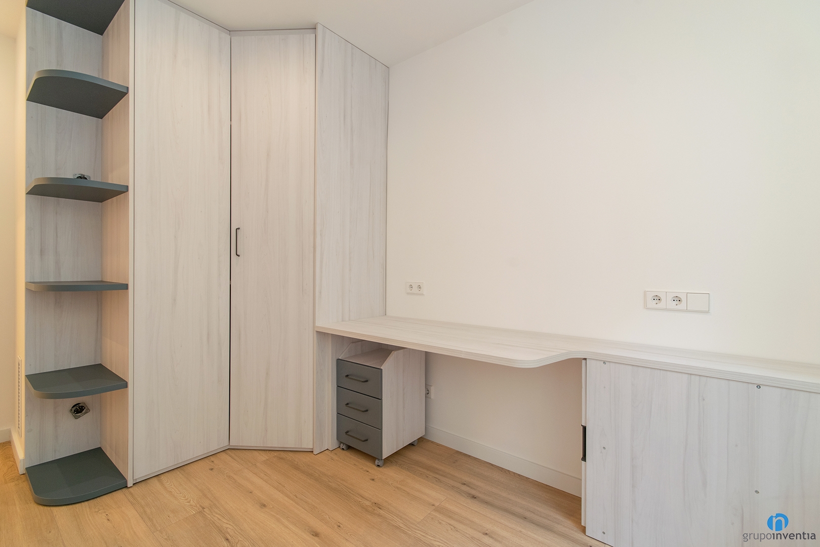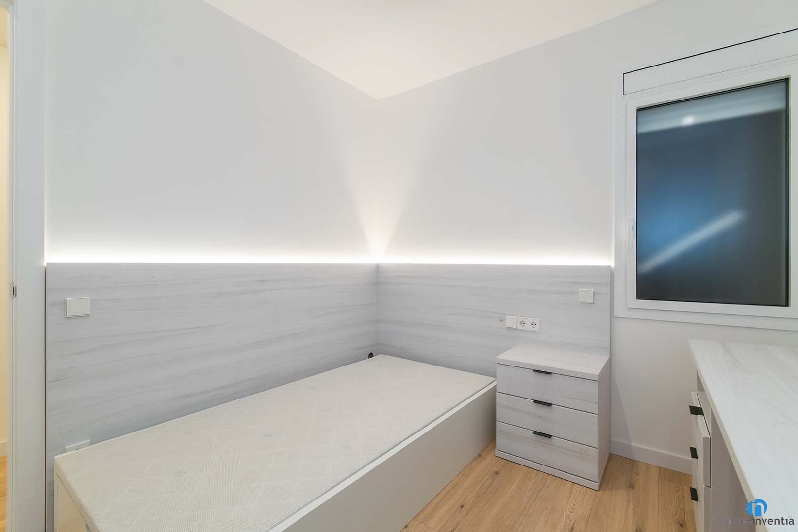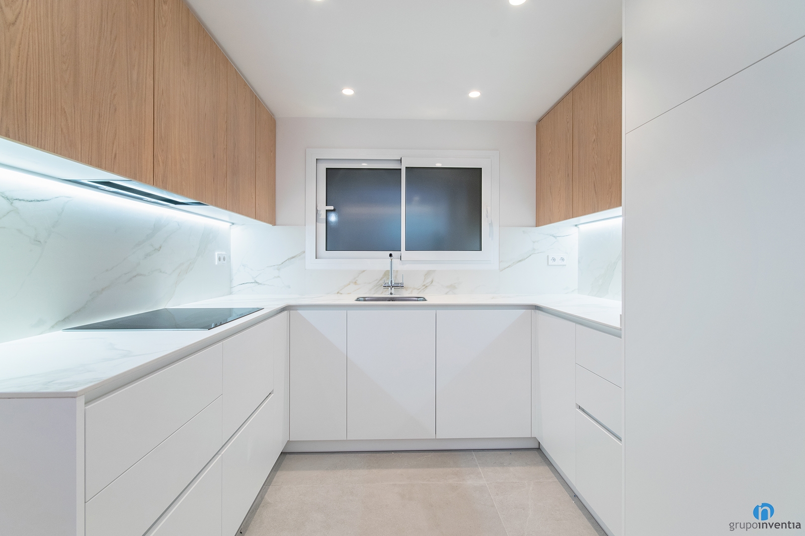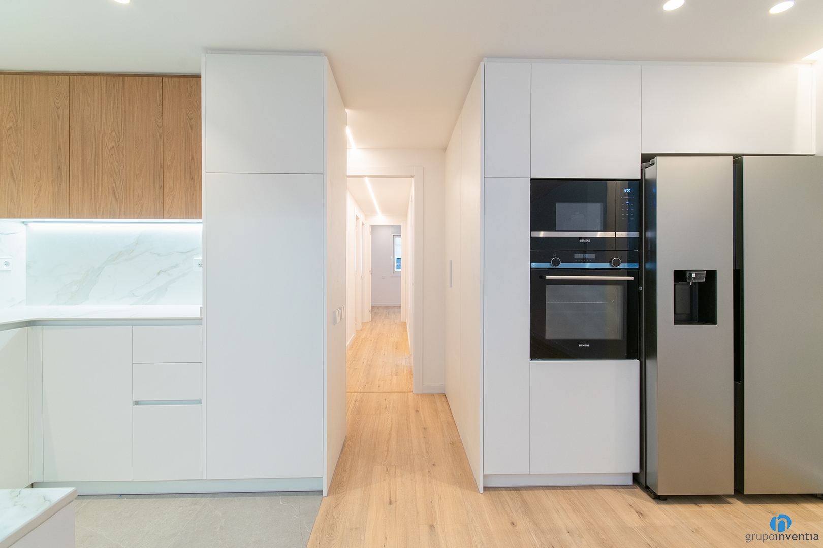 Per al disseny de cuina, s’ha mantingut la línia general de tot l’habitatge. Colors neutres que permeten potenciar la lluminositat i l’amplitud de cada espai. És una opció encertada, ja que és un disseny atemporal i que pot combinar amb molts estils decoratius. Tot això acompanyat d’un terra de parquet en tons clars de fusta.