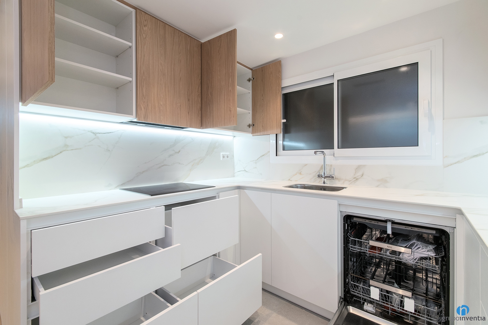 La cuina és de concepte obert i compta amb un equipament complet. A més, disposa d’una gran capacitat d’emmagatzematge, amb diversos armaris i calaixos. Al costat dret de la cuina trobem un taulell en forma d’U. Garanteix una gran superfície de suport i de treball i està equipada amb una pica i una placa d’inducció.