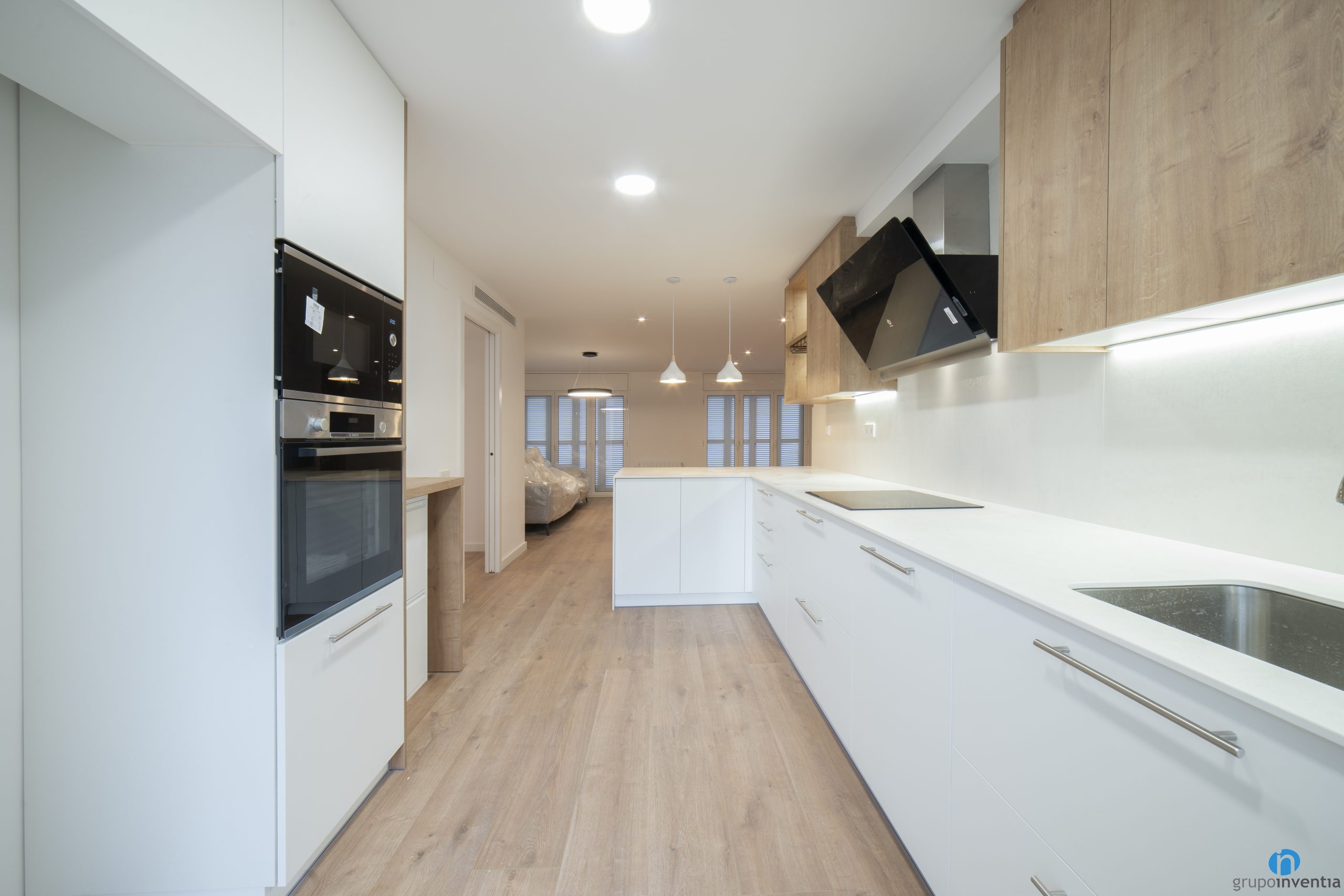 La cuina és oberta i està distribuïda a dos fronts. Està ubicada en una zona àmplia que permet una mobilitat excel·lent. A la banda dreta hem col·locat una barra de cuina i seguidament nous electrodomèstics. Hem col·locat un moble de cuina amb buits a mida per col·locar un forn, un microones i la nevera.
