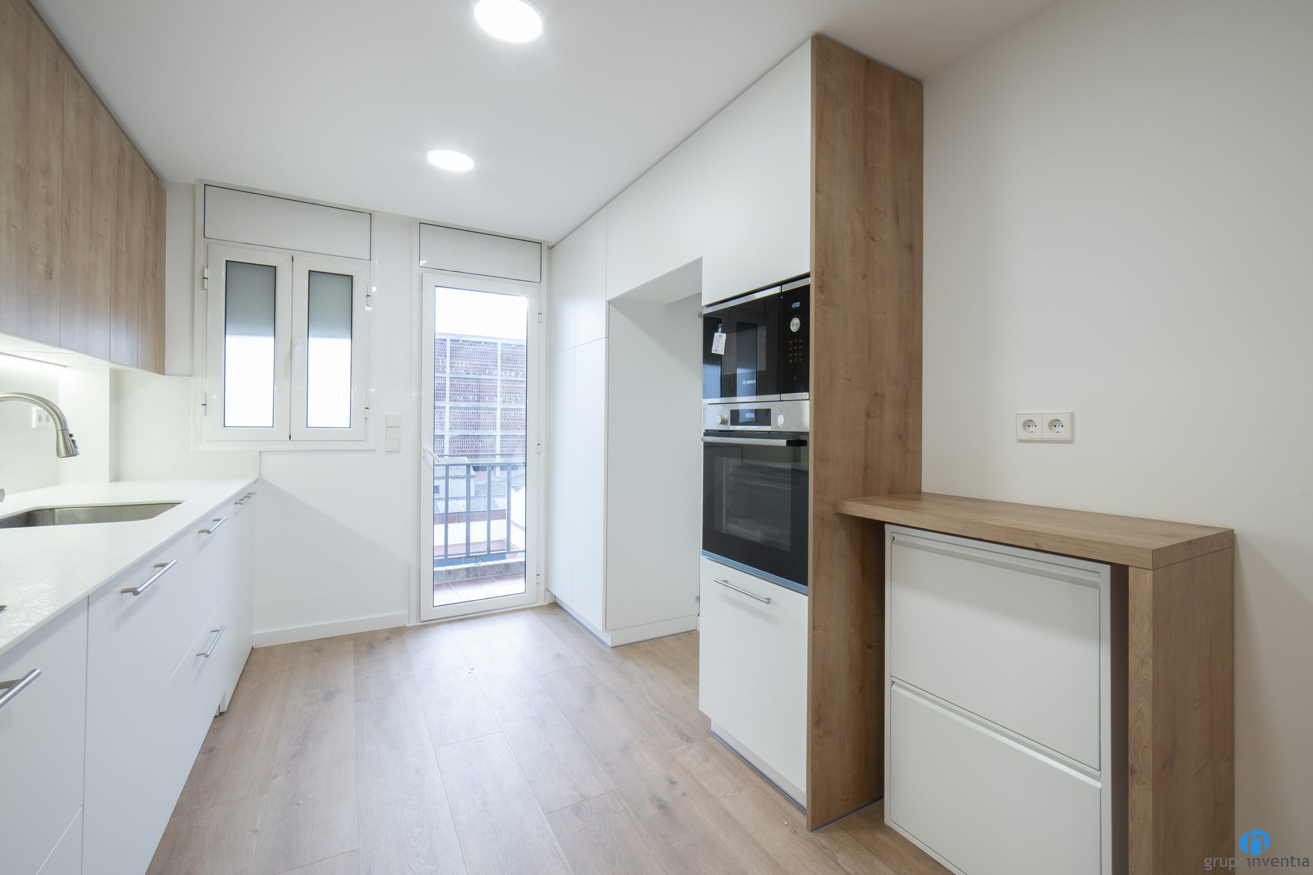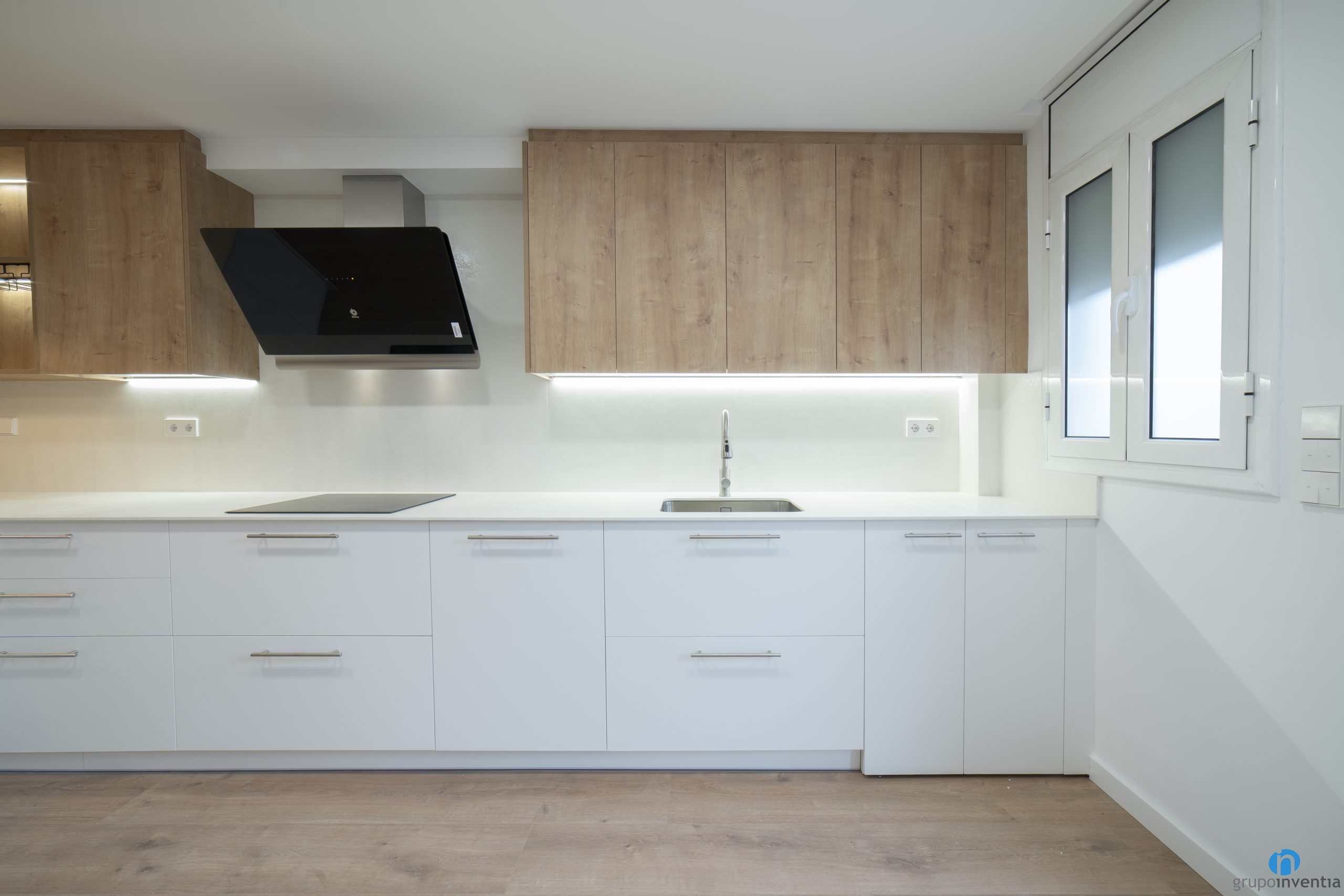 Una altra millora en aquesta cuina de Sant Adrià del Besòs és que hem ampliat la capacitat d’emmagatzematge. Compta amb calaixos i armaris de color blanc a la part inferior del taulell. A la part superior hem ancorat diversos armaris amb un acabat de fusta. És una combinació que està en tendència en les reformes de cuines.