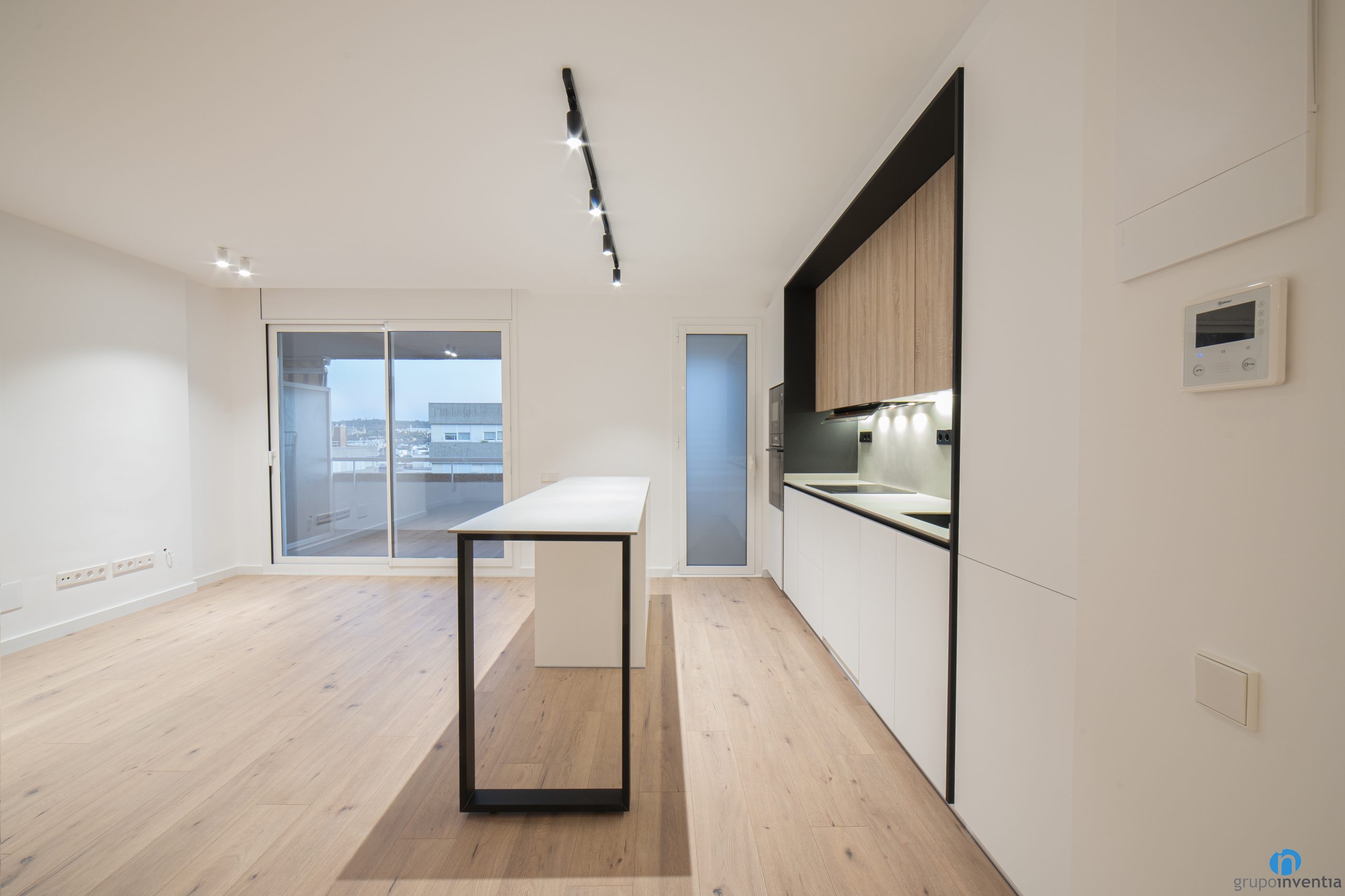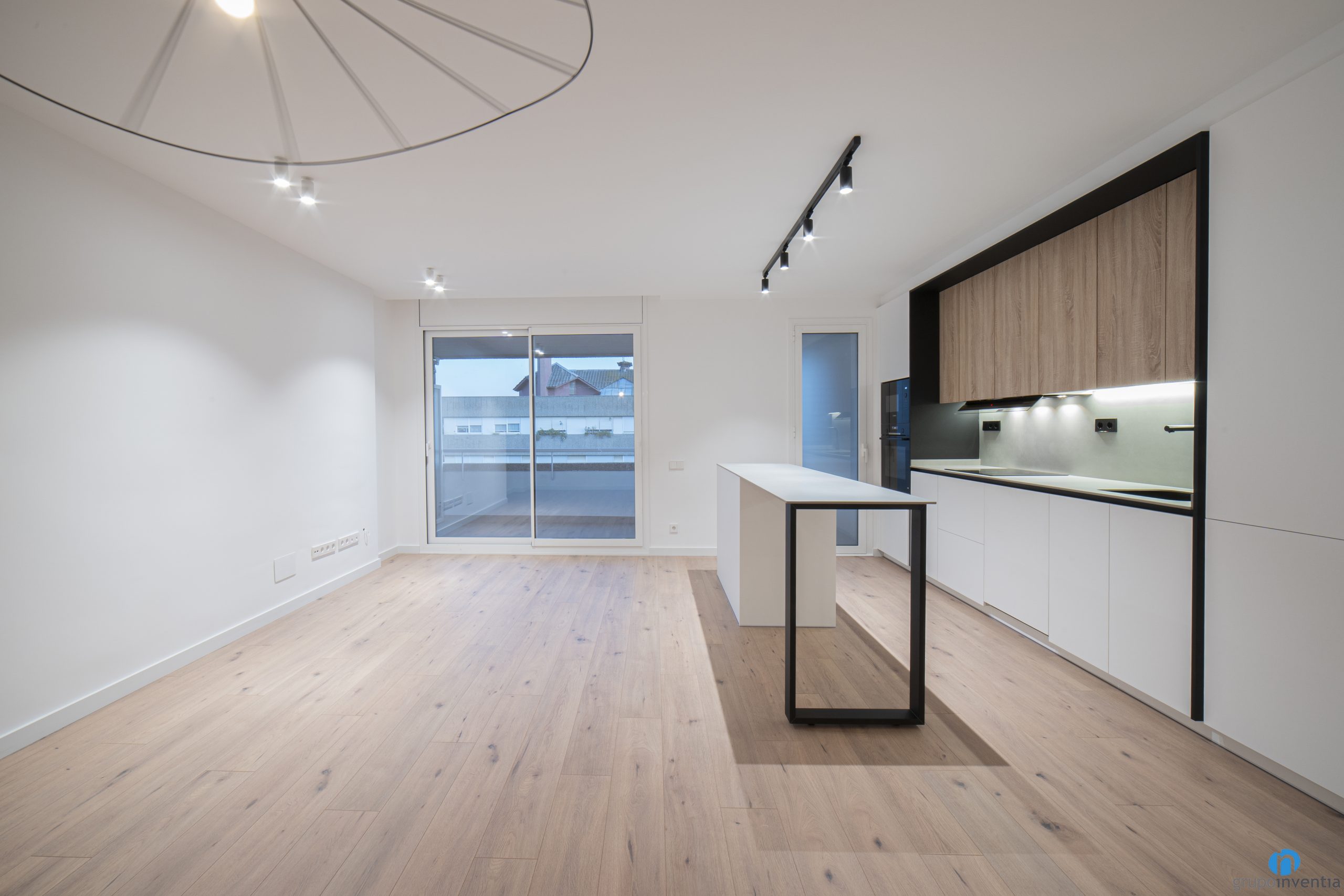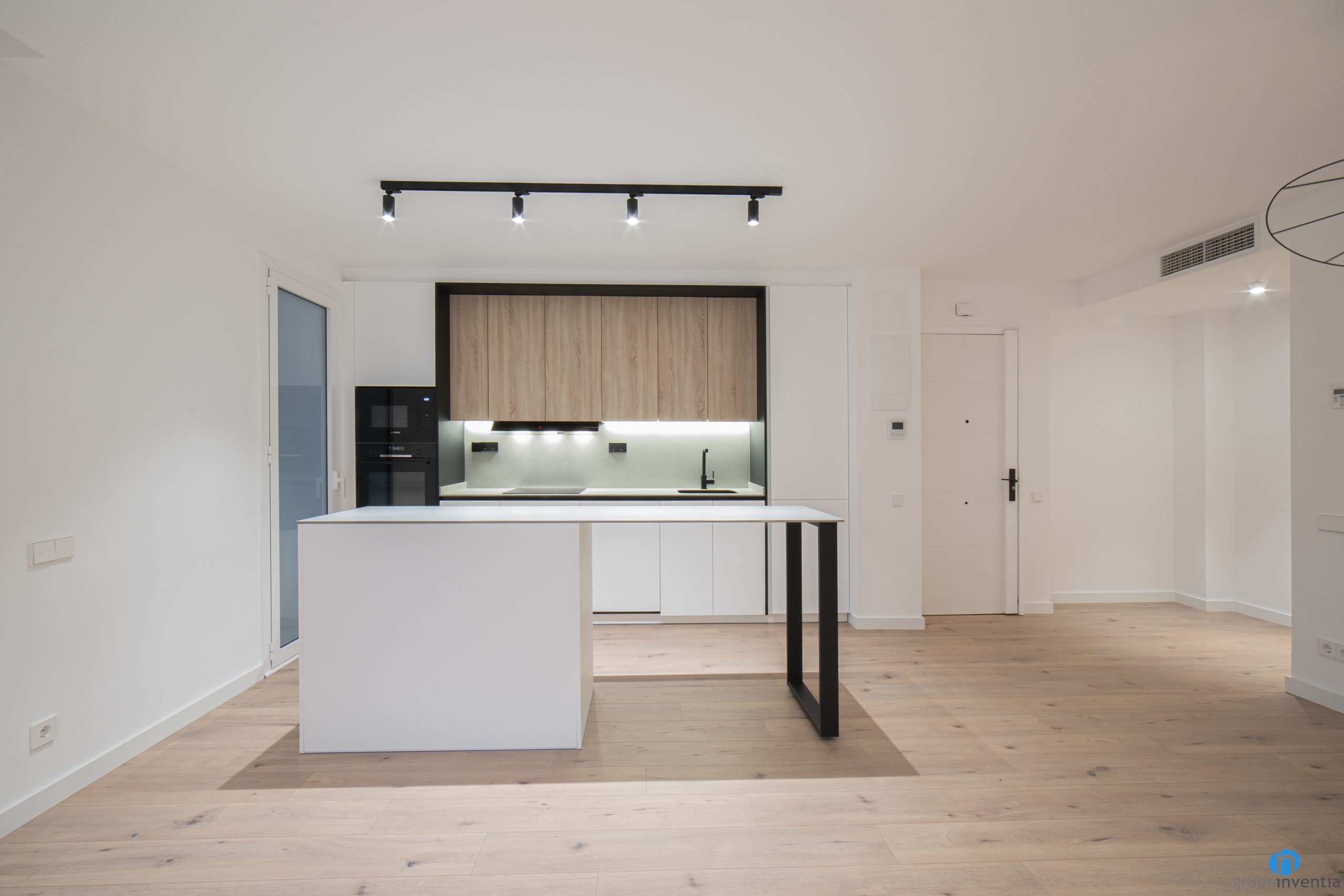 Una reforma de cuina funcional amb un disseny modern. Combina els acabats en blanc i negre amb alguns detalls de fusta. Aquests últims els veiem als armaris superiors i també al terra de parquet.