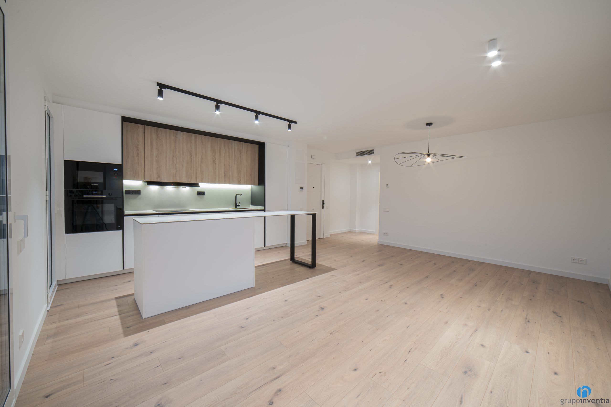 El moble de cuina lineal té un taulell equipat amb una placa de cocció i una pica d’un sol si. Tant a la part inferior com a superior compta amb calaixos i armaris que amplien l’emmagatzematge de cuina. Als extrems hem integrat els nous electrodomèstics. A l’esquerra hi ha el forn i el microones, tots dos amb acabat negre, ia la dreta hi ha la nevera. Al moble de cuina inferior també hem integrat un rentaplats.
