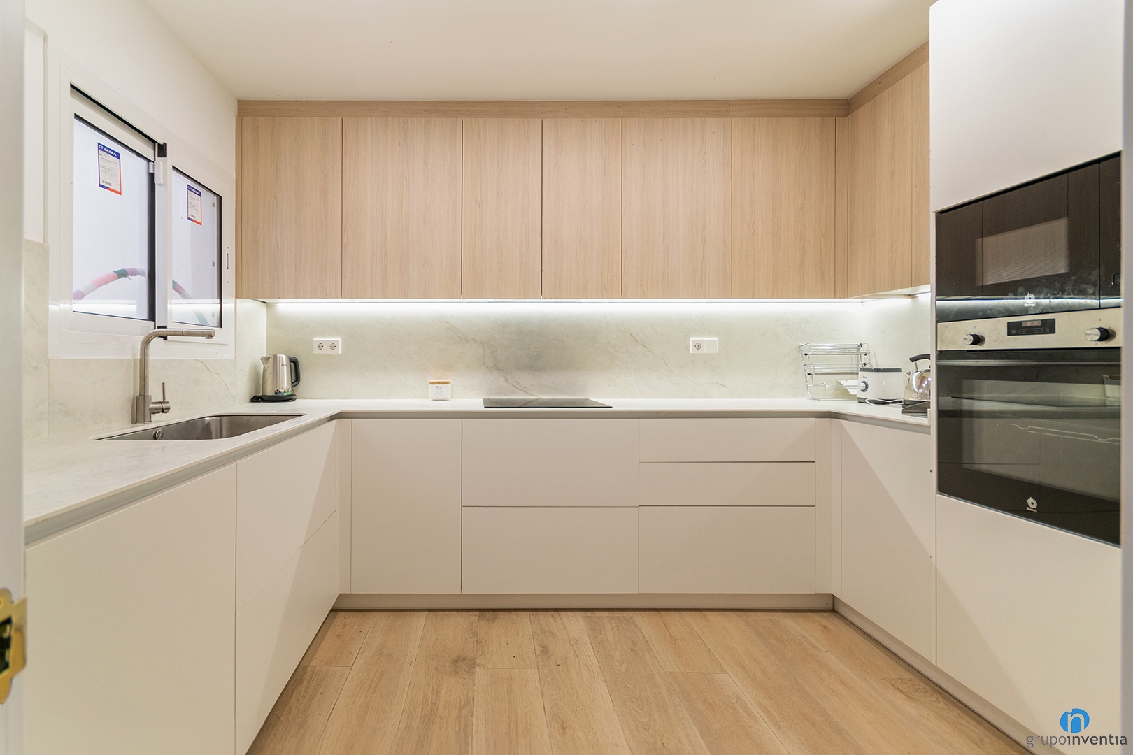 La cuina se situa en una estança pròpia i compta amb una distribució en forma de U. És una distribució molt pràctica per a pisos amb espai tancat. Permet aprofitar al màxim la superfície disponible. Les encimeres són àmplies i creen molta zona d’ús i treball. És ideal per cuinar i col·locar petits electrodomèstics. Aquesta reforma de cuina també incorpora molta capacitat d’emmagatzematge. Hi ha calaixos i armaris tant a la part inferior com a la superior.