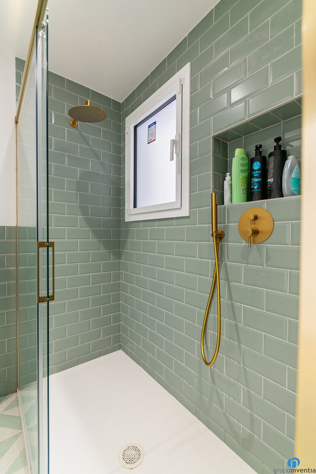 El bany també s’ha renovat completament. La nova imatge és fresca i relaxant. Les parets s’han revestit amb rajoles bisellades en to verd suau. La resta de parets s’ha pintat en blanc. Aquest contrast aporta equilibri i lluminositat. El terra és hidràulic i manté les mateixes tonalitats.