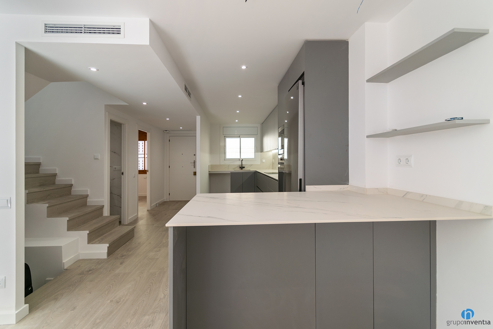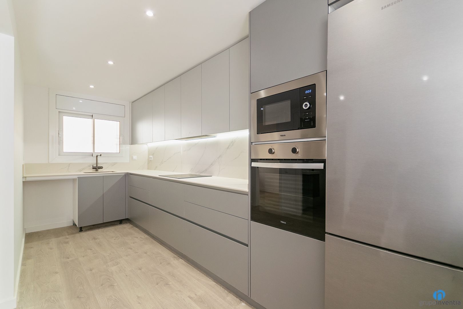 El moble és de to gris i les encimeres imiten marbre blanc. És un conjunt elegant que encaixa molt bé amb aquesta reforma integral a Vilassar de Mar.