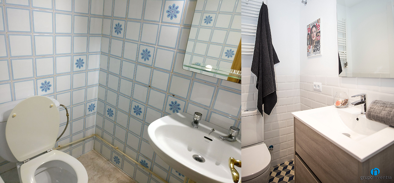 Els dos banys es van renovar per complet. Ara les estances llueixen una imatge més acollidora i lluminosa gràcies a l’enrajolat a mitja alçada amb rajoles de color blanc i un paviment d’estil hidràulic.