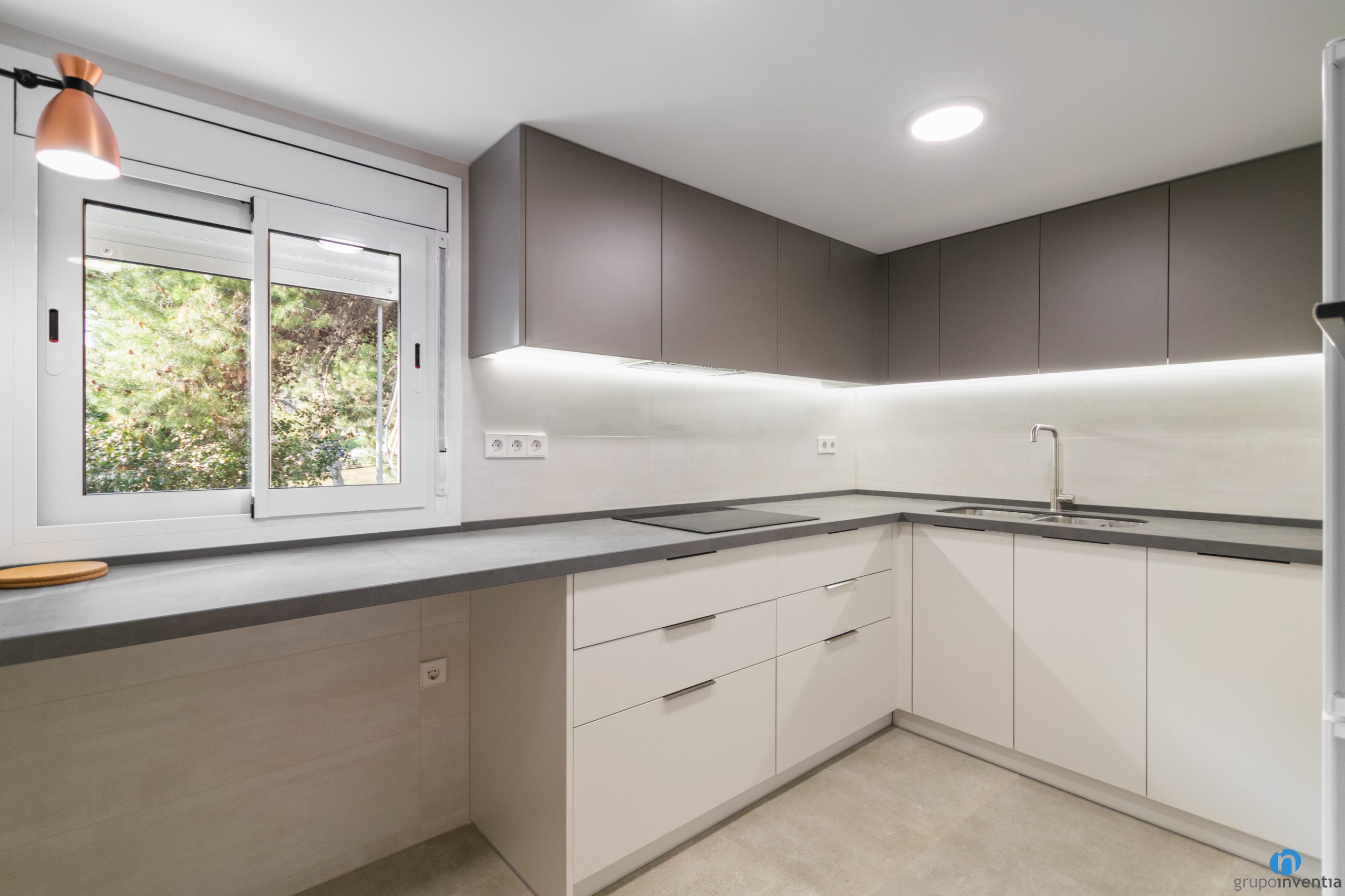 Per a la nova imatge d’aquesta reforma de cuina hem optat per una imatge moderna amb tons neutres. El moble inferior de cuina és de color blanc i els armaris superiors són de color gris i combinen amb el taulell.