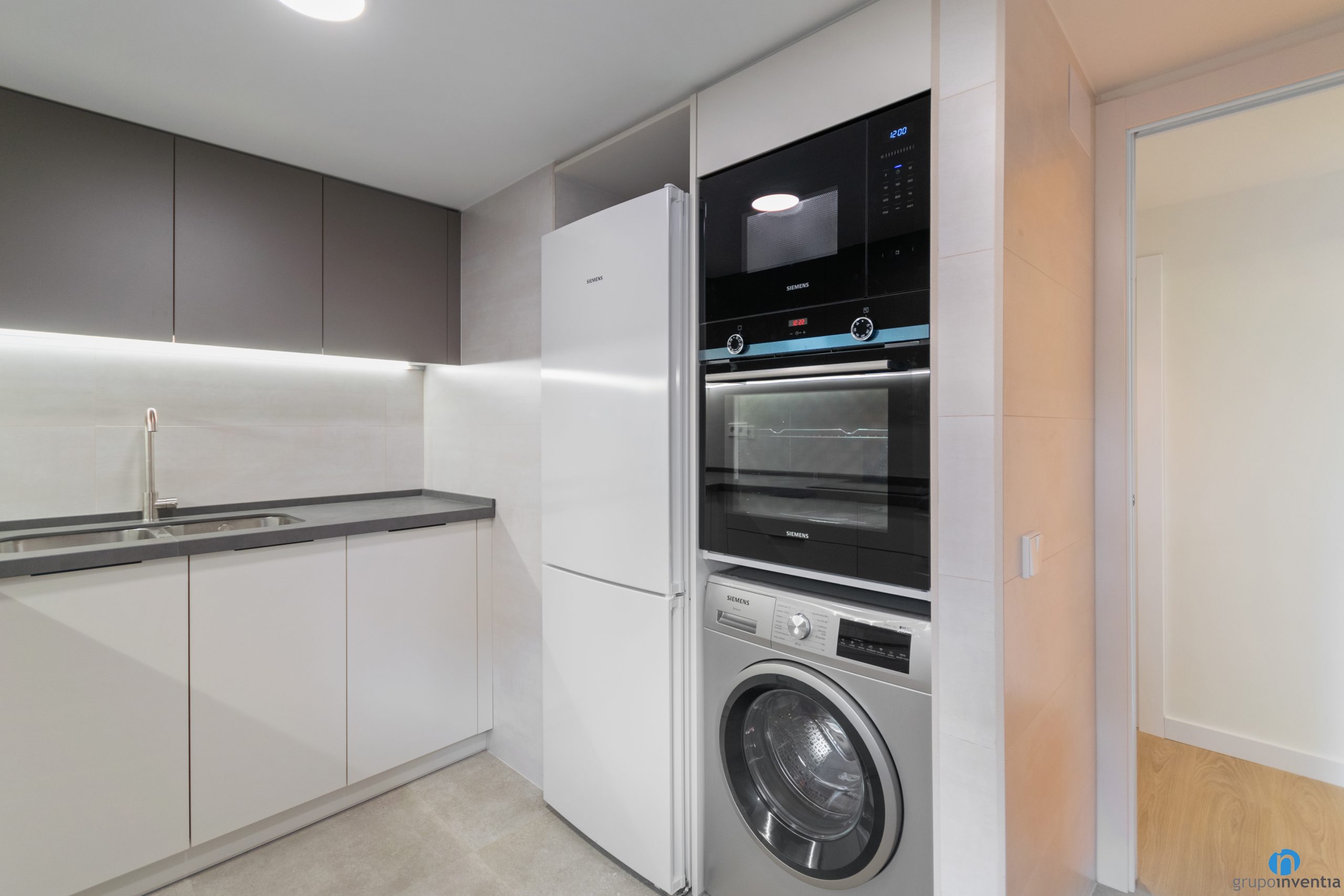 La cuina s’ubica en una estança pròpia i té una distribució en forma d’U. D’aquesta manera, cada nou element de la cuina s’ubica al lloc indicat. El costat esquerre ho hem destinat als electrodomèstics. Hi ha buits a mida per a la rentadora, el forn, el microones i també la nevera.