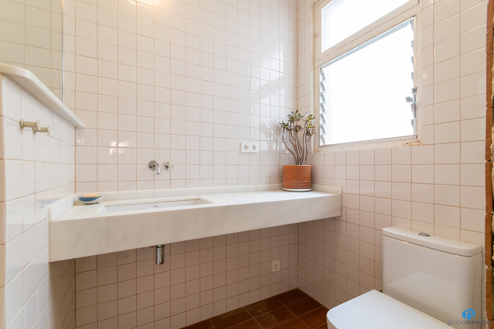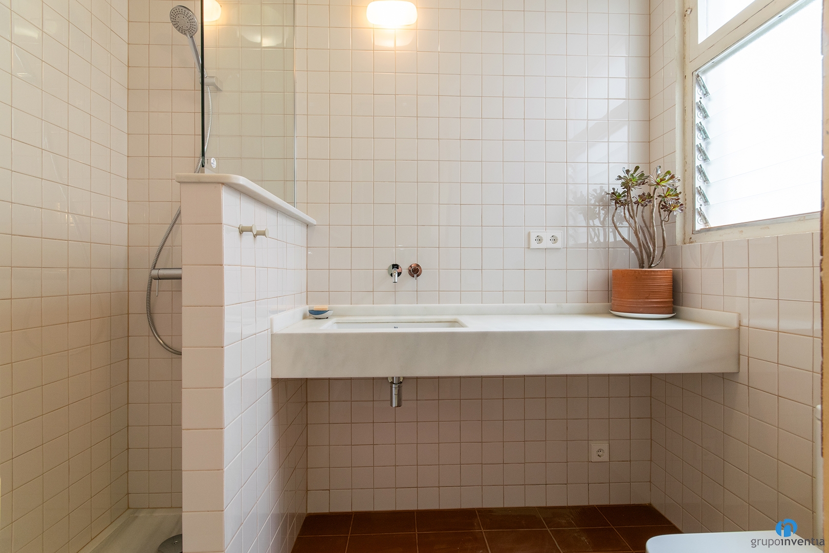 A més de la imatge, també hem renovat l’equipament sanitari. Ara compta amb un vàter, un lavabo de si gran i un plat de dutxa. Aquest darrer és obra i queda separat per un mur a mitja alçada.