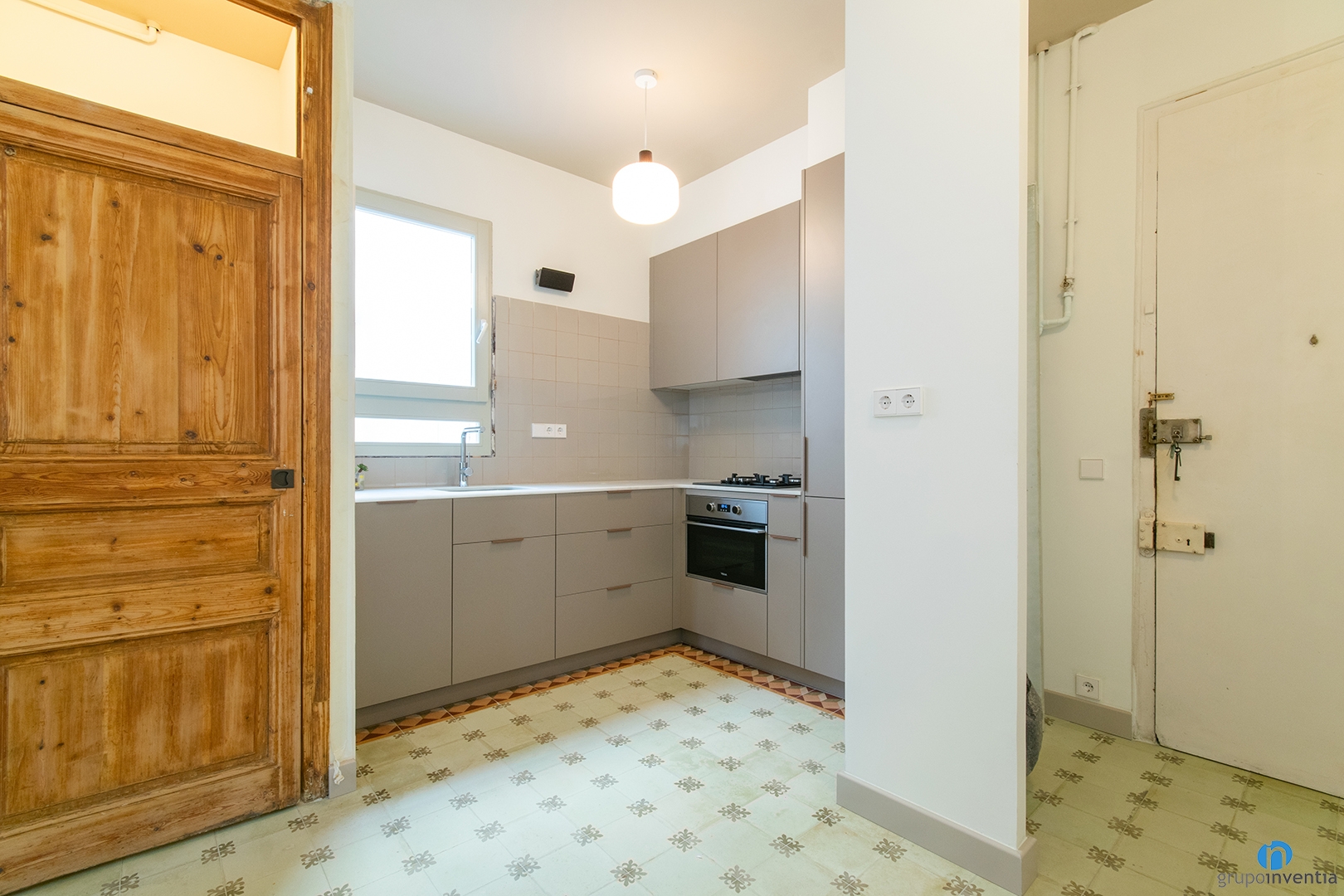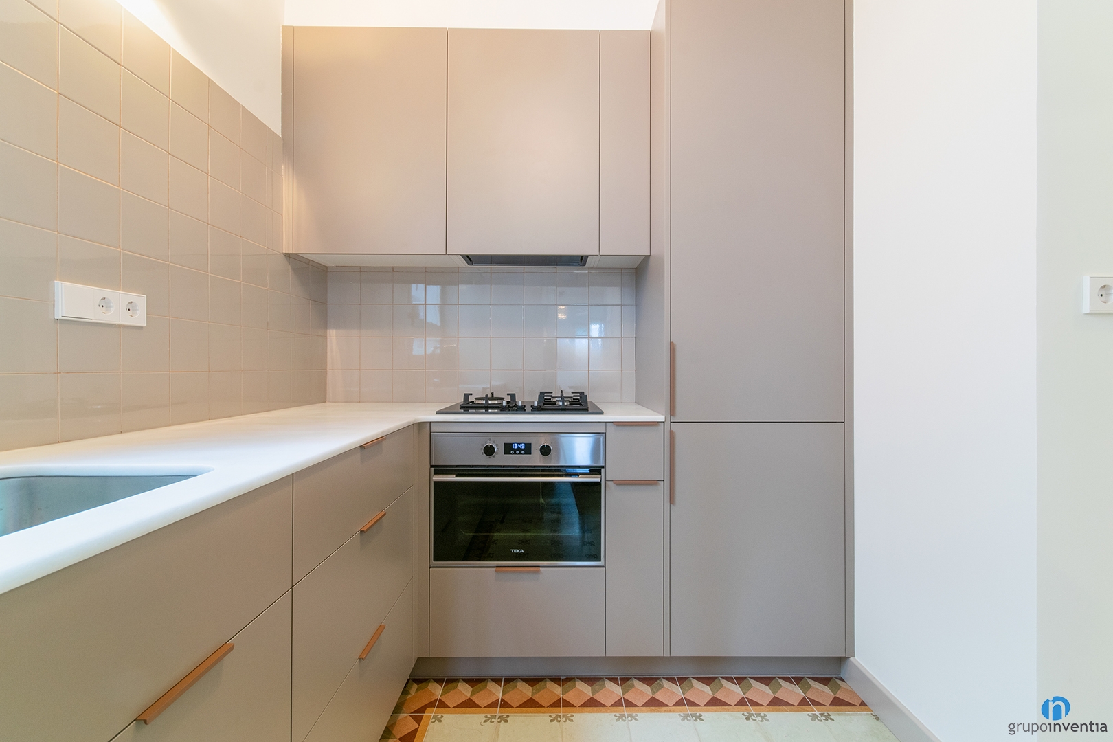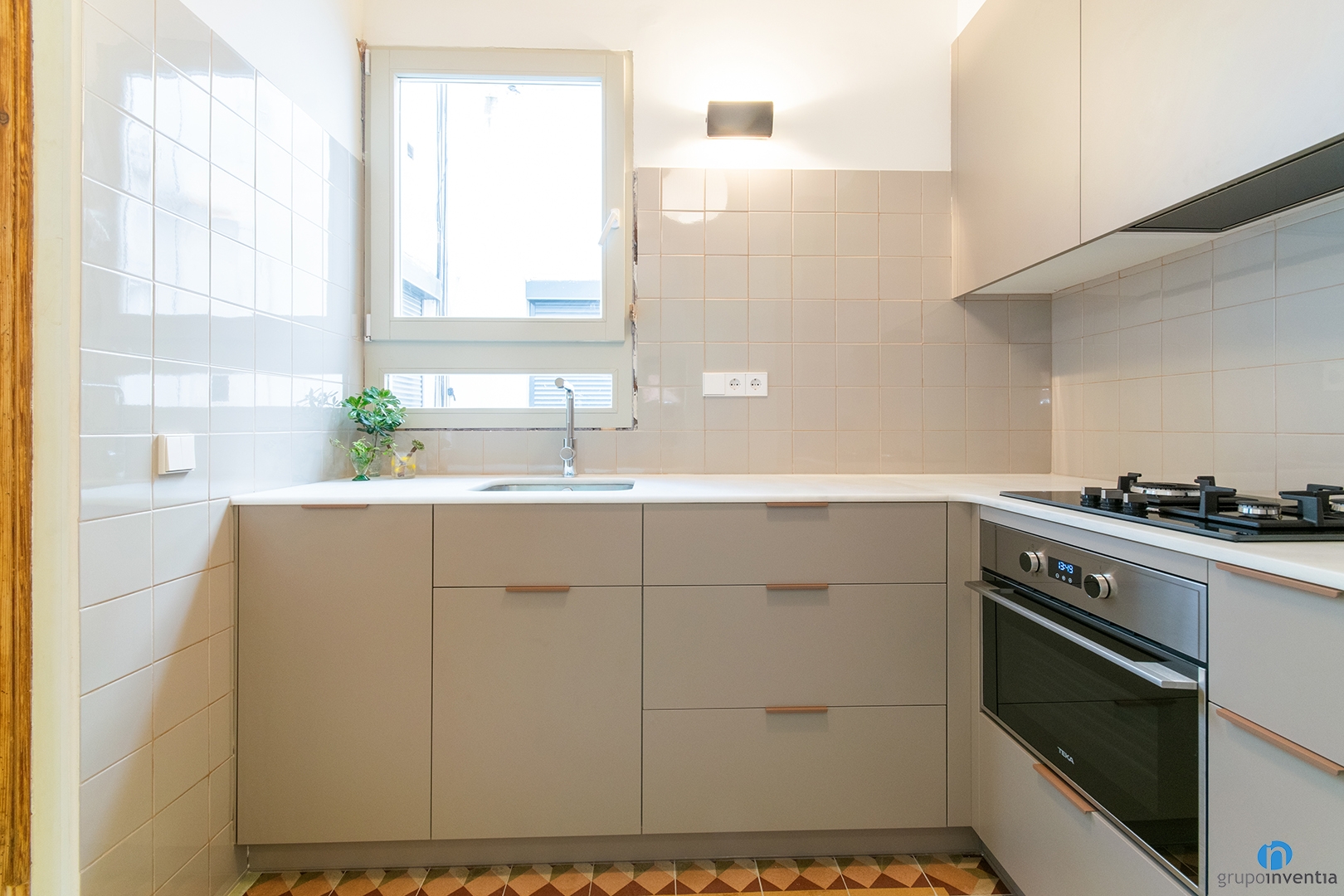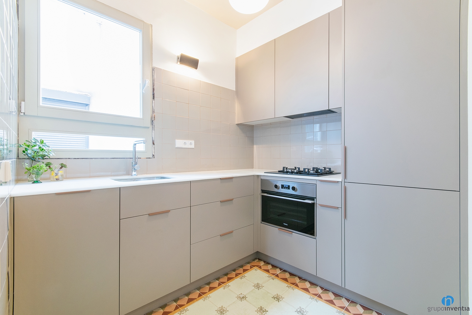 Dins del nou disseny de cuina hem mantingut el terra hidràulic original, mantenint continuïtat amb la resta del paviment de l’habitatge.