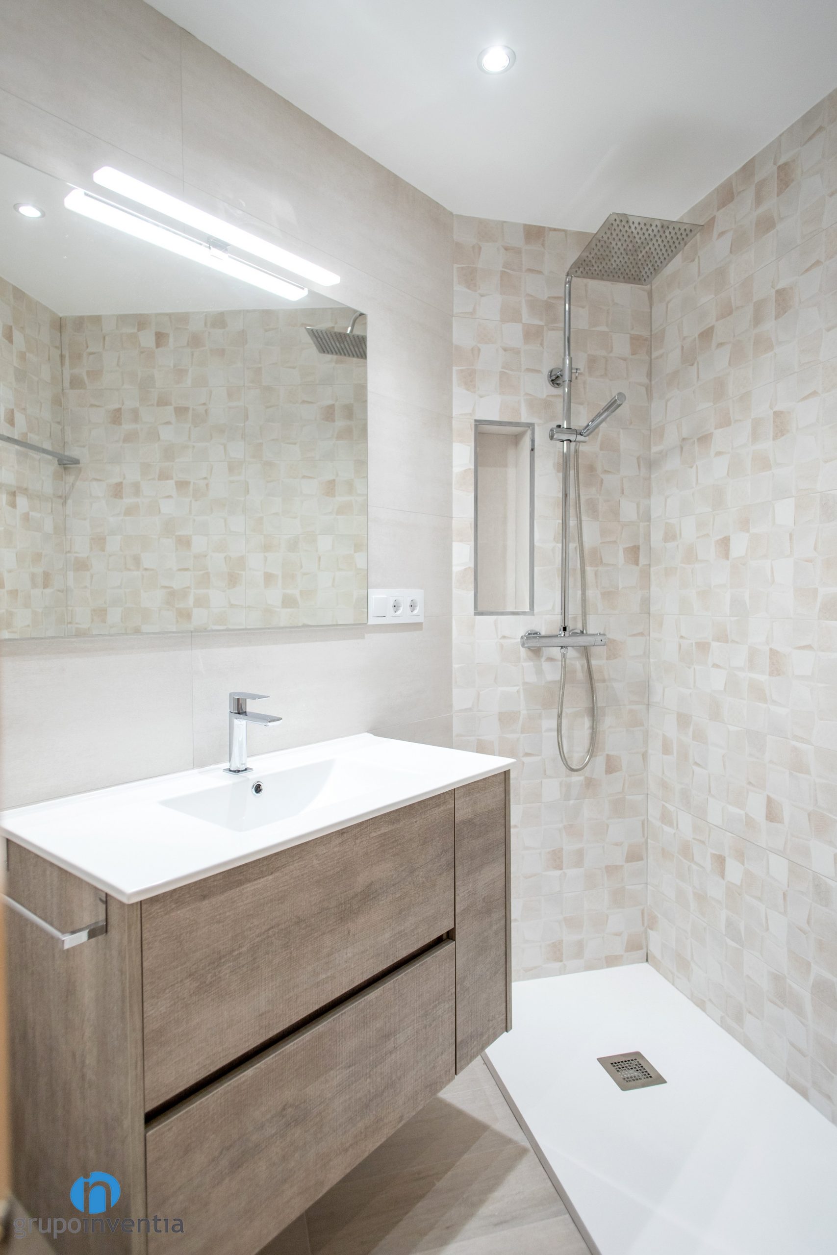 A l’igual que la imatge general d’aquesta reforma integral a Barcelona, el disseny interior de la cambra de bany també s’ha millorat. Les parets del lavabo i de l’inodor s’han enrajolat amb rajoles ceràmiques de color beige. La paret de la dutxa també llueix aquest color neutre però s’ha enrajolat amb unes rajoles tipus mosaic. Pel que fa al paviment aquest bany compta amb un terra ceràmic imitació fusta.