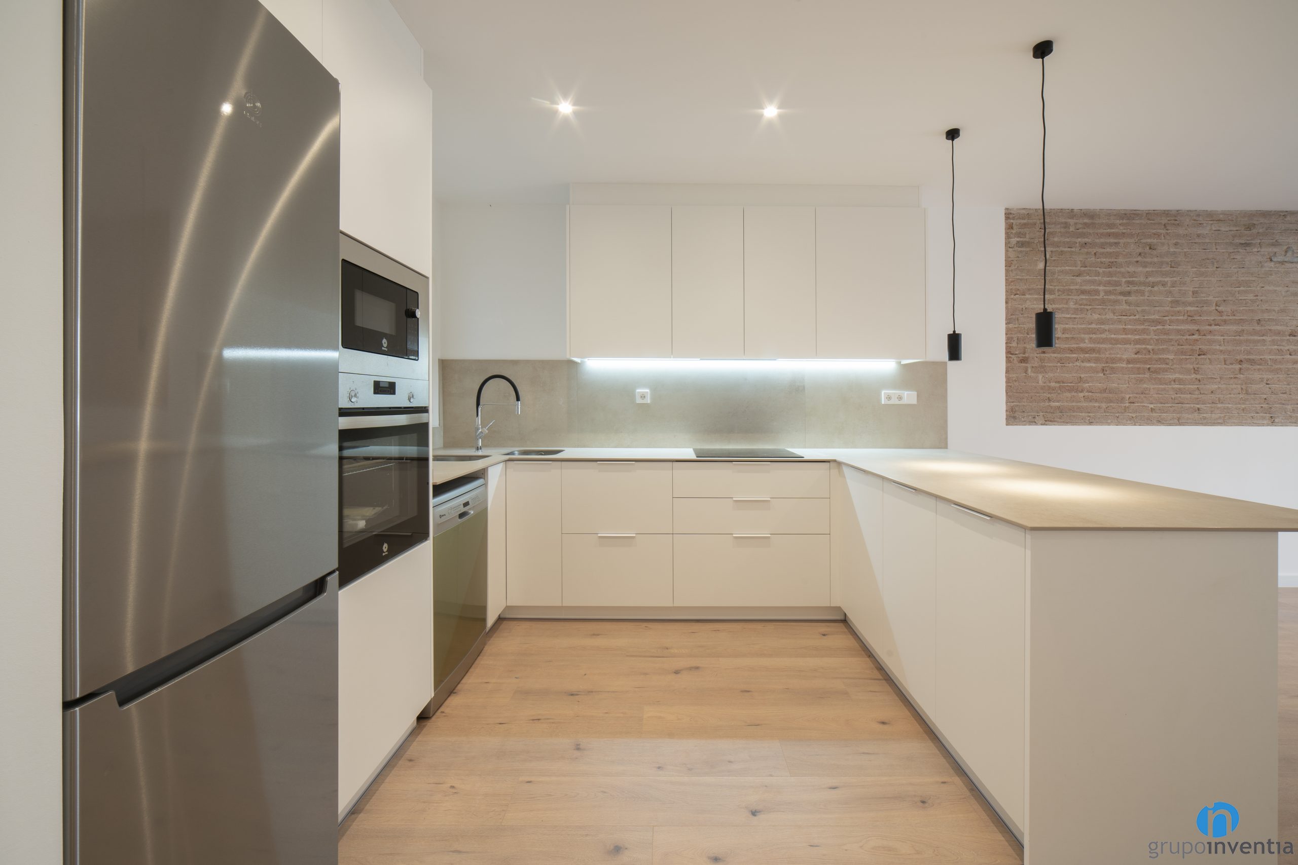 A l’extrem de l’esquerra hem integrat els nous electrodomèstics al moble de cuina. Concretament hi ha espai per a una nevera, un forn i un microones. Tot seguit neix un tram de taulell equipat amb una pica doble i que ofereix superfície de treball. A la part inferior hi ha un buit a mida on hem col·locat el rentaplats.