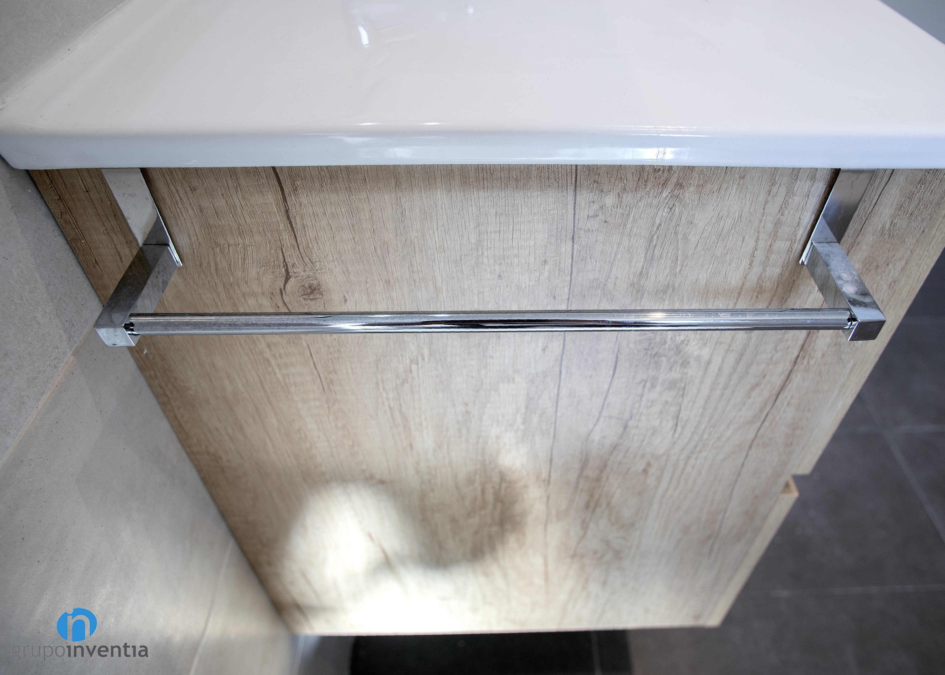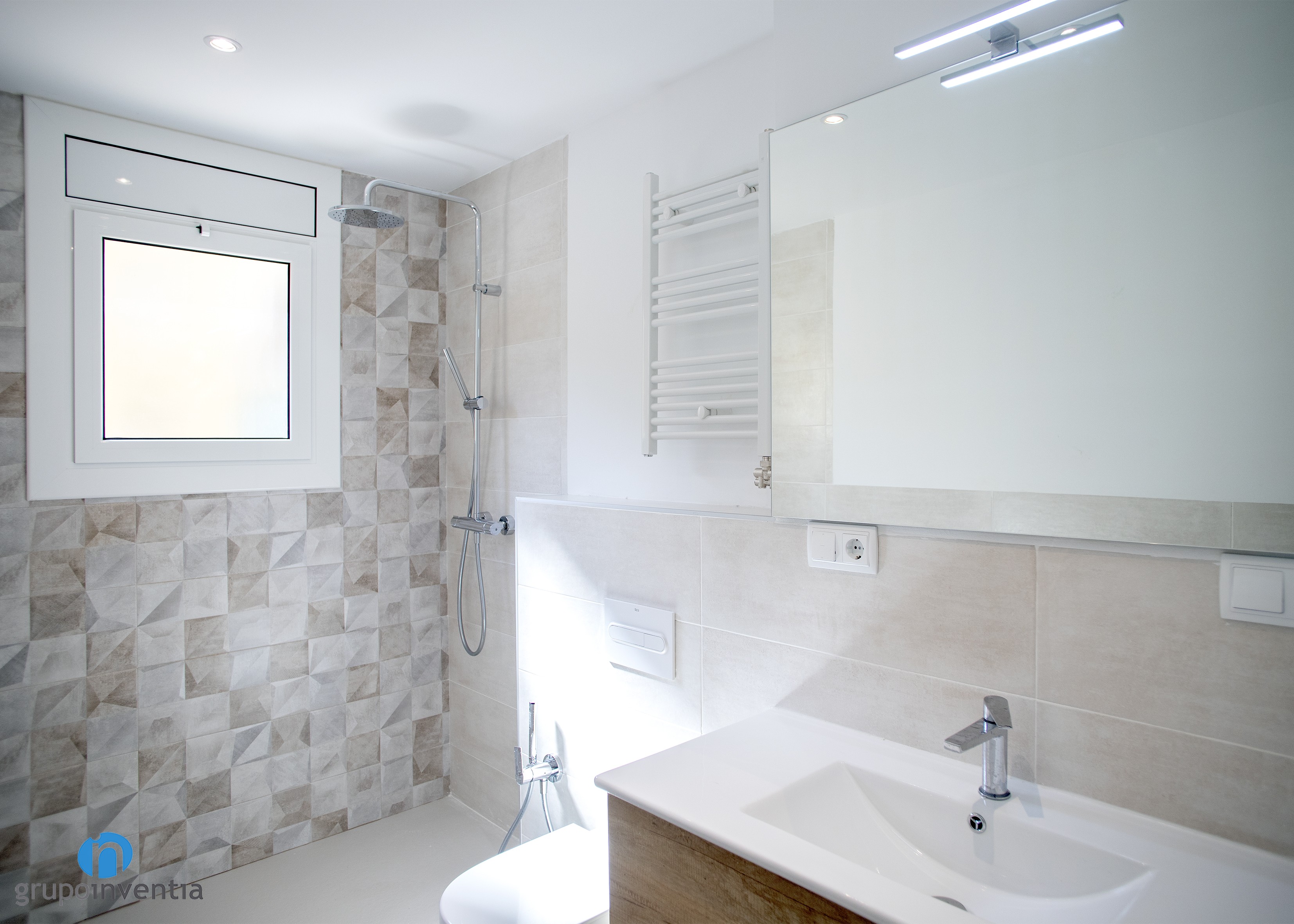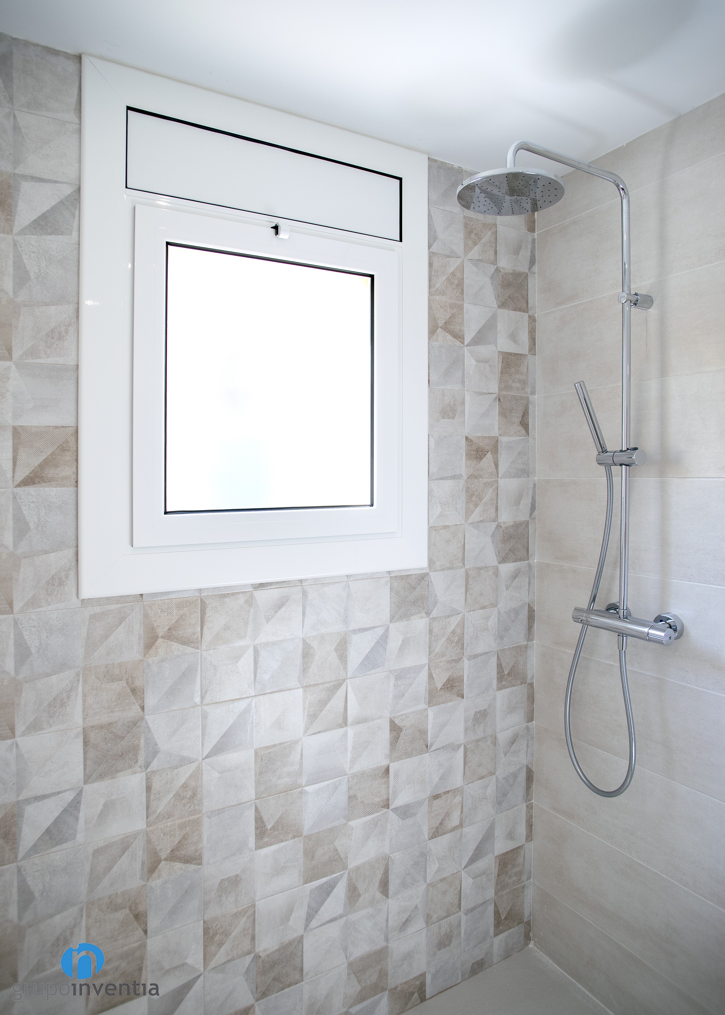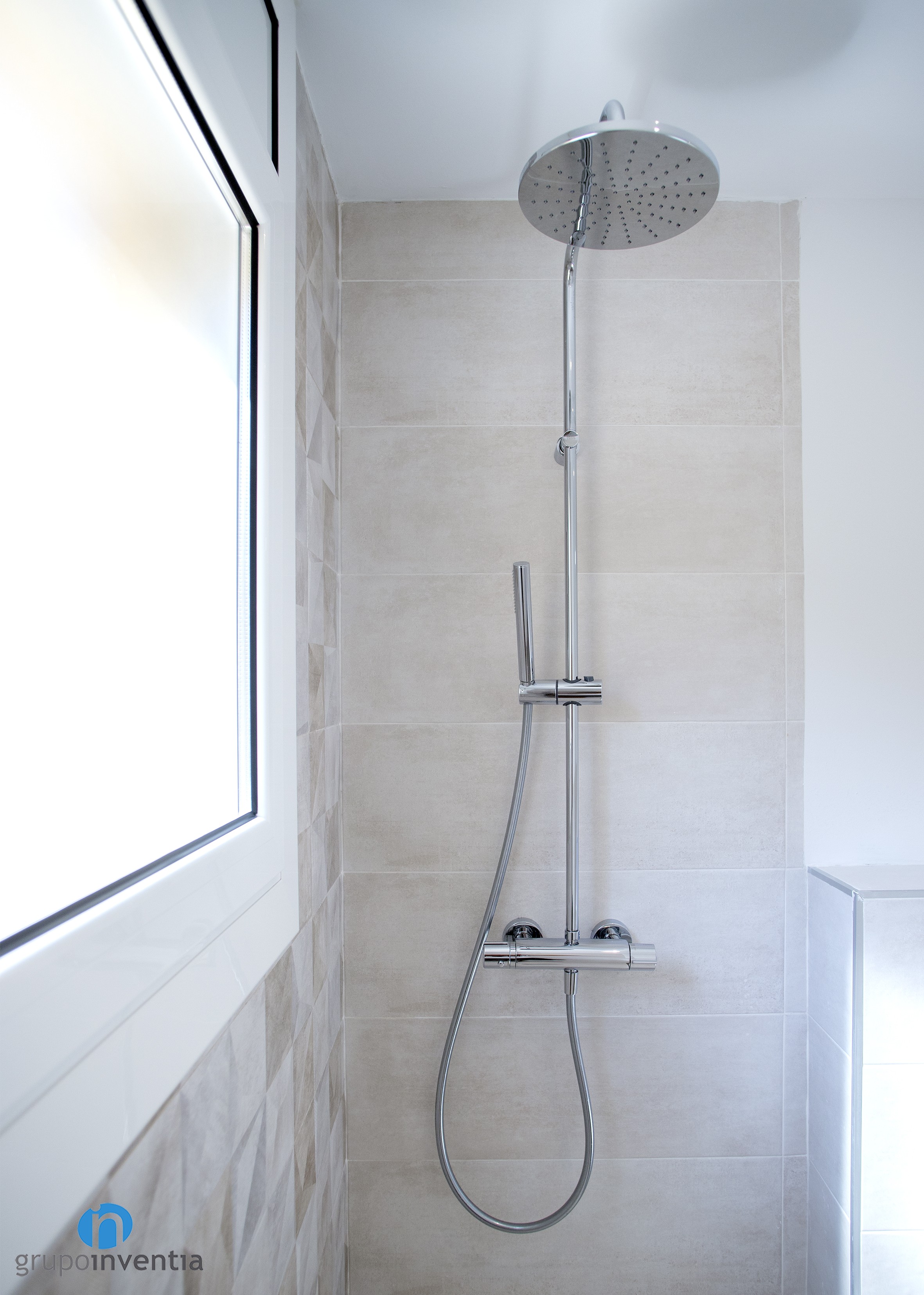 Per a la nova imatge de la cambra de bany es va apostar pels tons neutres, amb l’objectiu de generar un ambient agradable i fresc. Així, les parets es van enrajolar a mitja alçada amb rajoles de color beige i es va pintar de blanc la resta fins a arribar al sostre. Pel que fa al disseny, destaca la paret de la dutxa, enrajolada amb rajoles beige que generen un agradable efecte òptic.