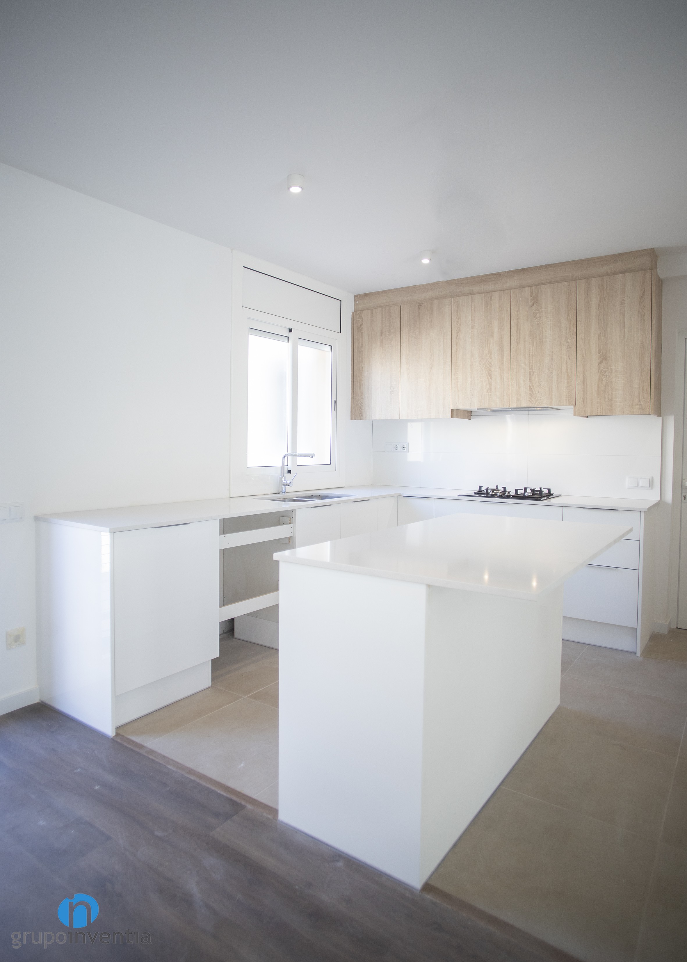 Com hem esmentat, el centre l’ocupa una illa de cuina que àmplia la superfície de suport i que pot utilitzar-se com barra de cuina, aconseguint un espai perfecte tant per a realitzar les ingestes diàries com per passar moments distesos amb les visites.