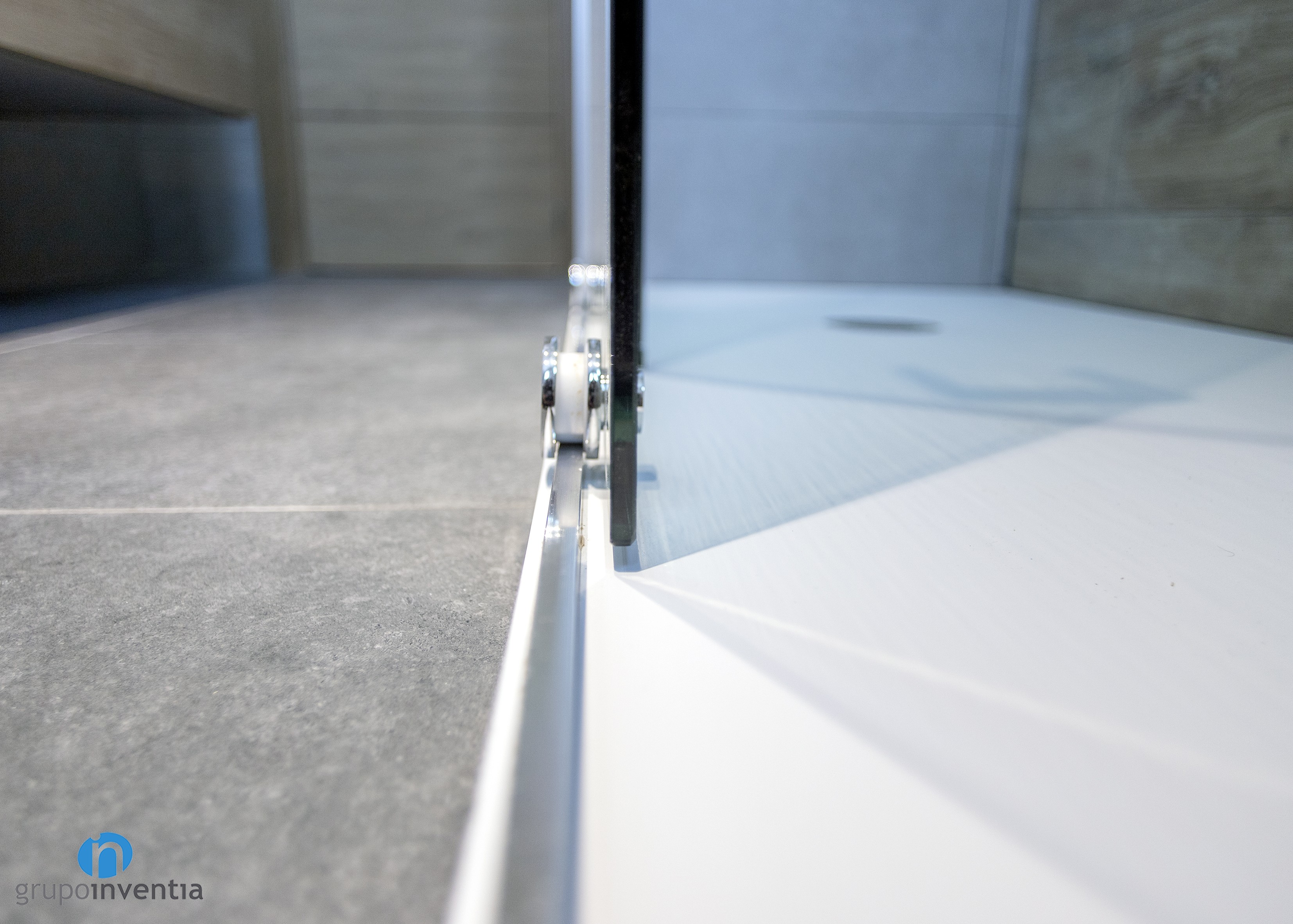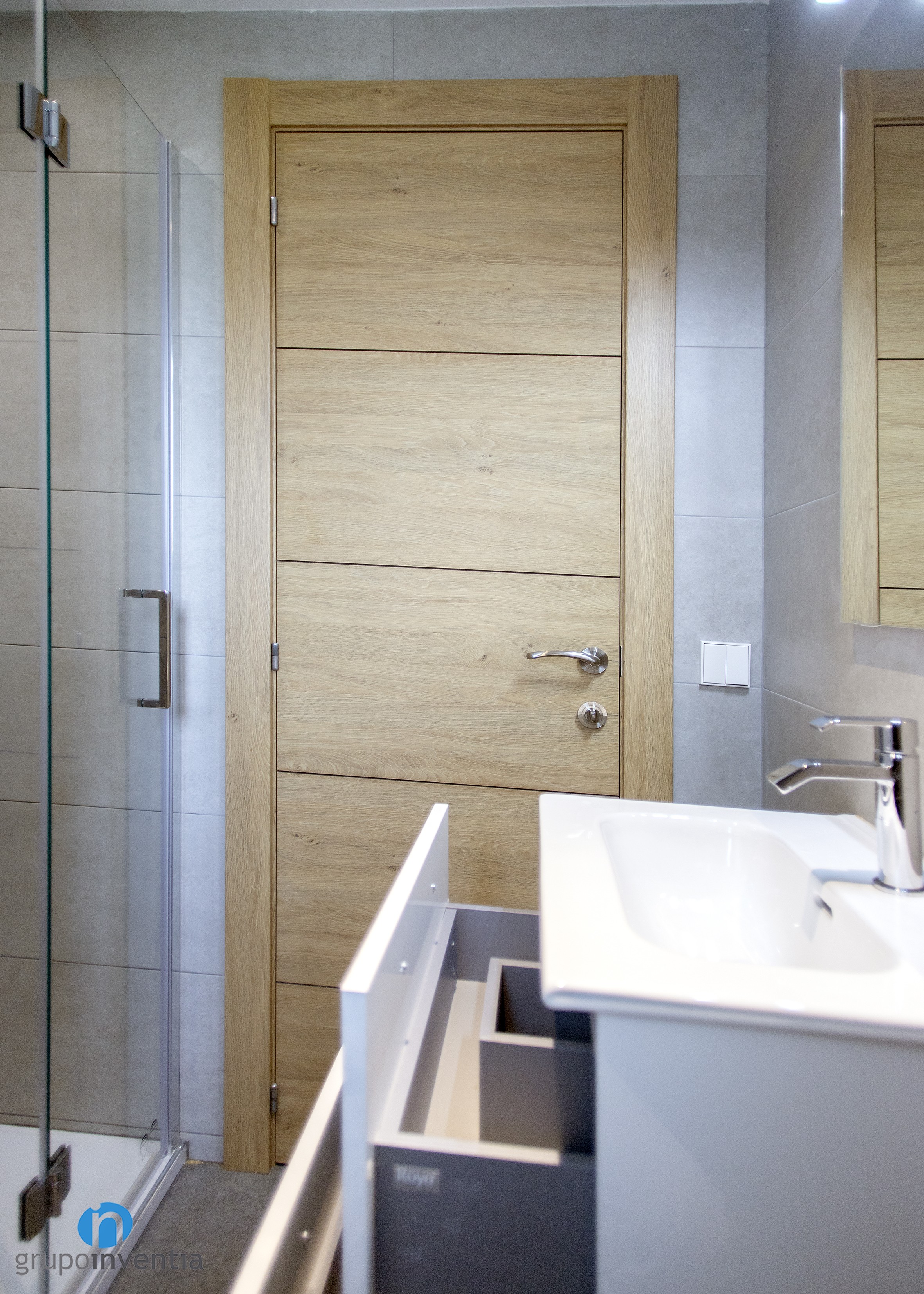 Per al disseny interior de les cambres de bany es va apostar per un enrajolat de parets complet amb rajoles de color gris suau. Aquesta imatge neutra genera un ambient molt agradable i permet introduir altres acabats com els de fusta, presents en el moble del lavabo i a les portes. Com a detall, la paret de la dutxa del bany principal es alicató amb rajoles que imiten la fusta.