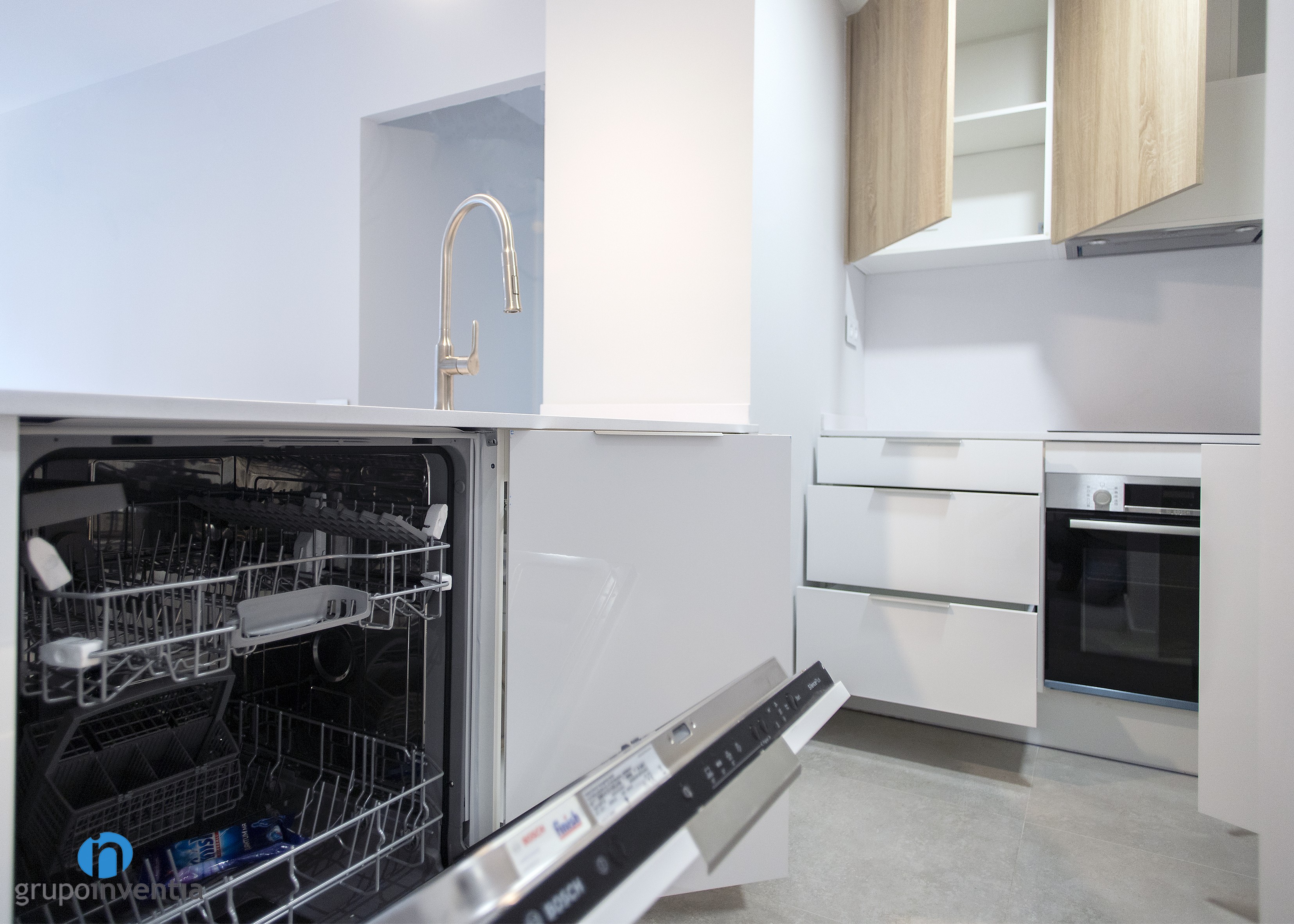 A la part central d’aquesta reforma de cuina es va disposar un tram de taulell de cuina sobre el qual es va instal·lar una placa vitroceràmica i es va encastar el forn a sota. A la part dreta apareix una nova taulell que aporta superfície de suport, mentre que en l’extrem es va disposar un buit a mida per encastar la nevera. Amb tot això, la capacitat d’emmagatzematge a la cuina també es va ampliar amb escreix.