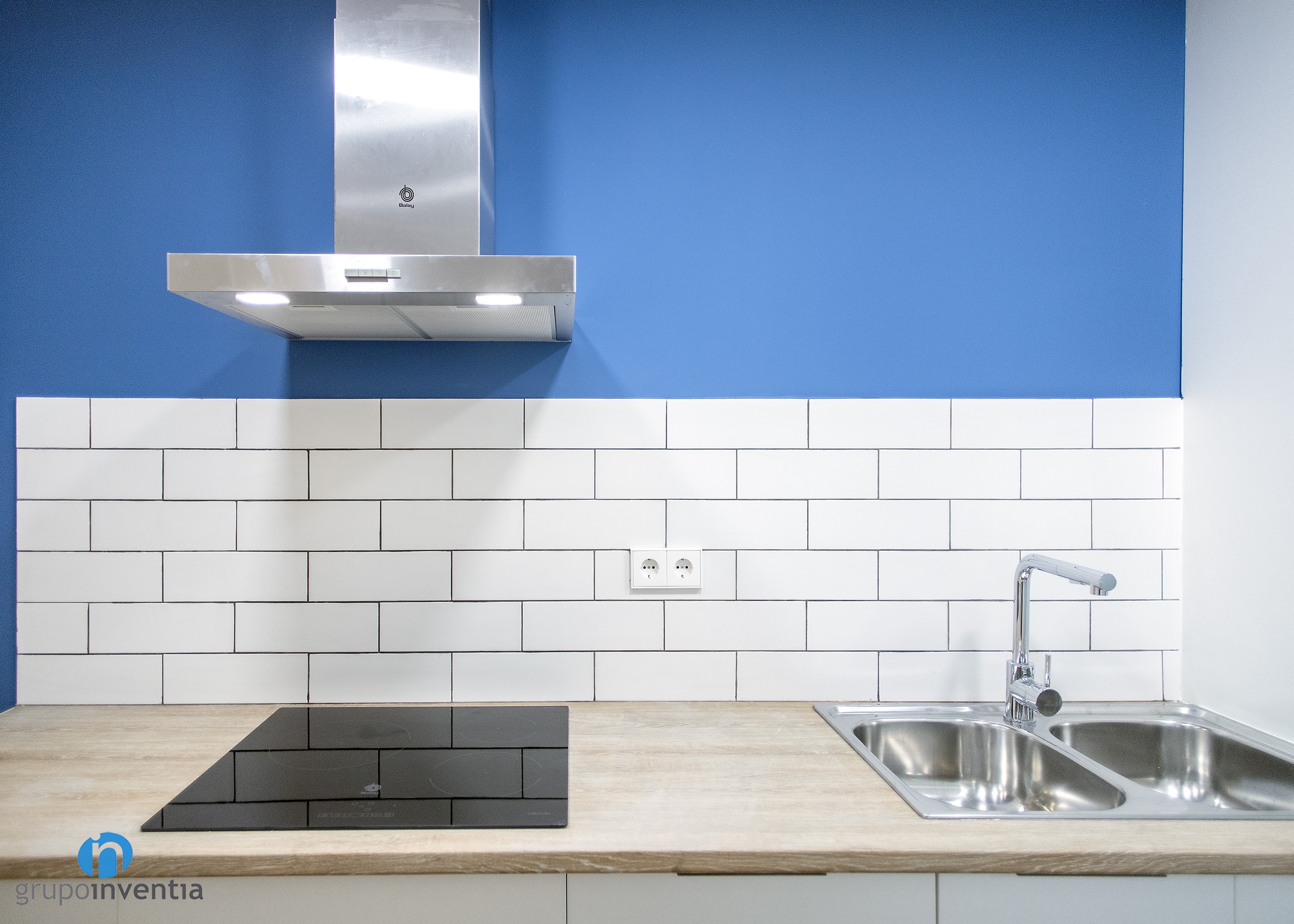 A la part dreta d’aquesta reforma de cuina es va disposar un buit a mida per encastar la nevera. Al seu costat es situa un armari de cuina que amplia la capacitat d’emmagatzematge de l’estança. En aquest treball destaca el color blau viu amb el qual es va pintar la paret i les rajoles tipus metro amb els quals es va enrajolar la pared superior del taulell de cuina.