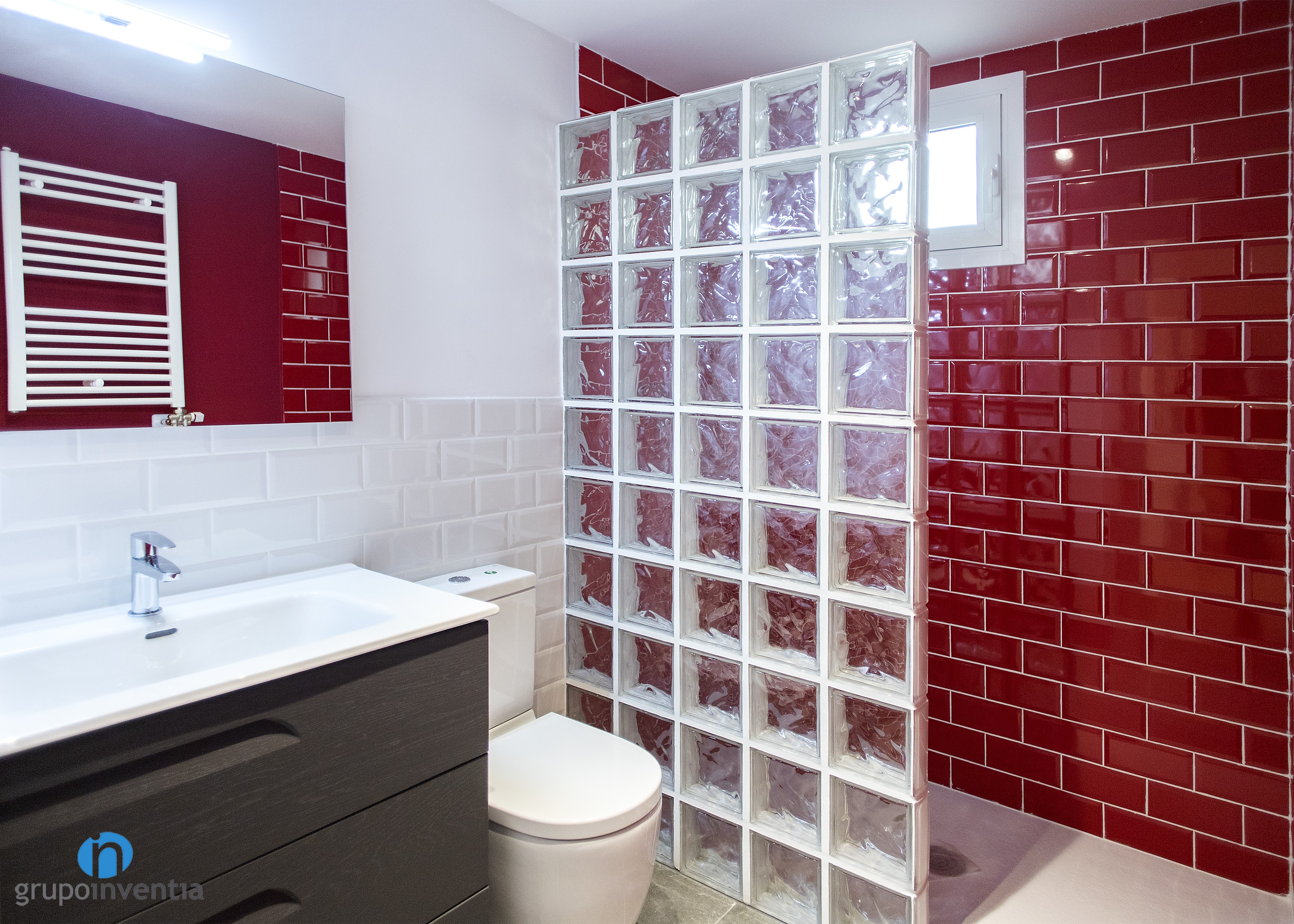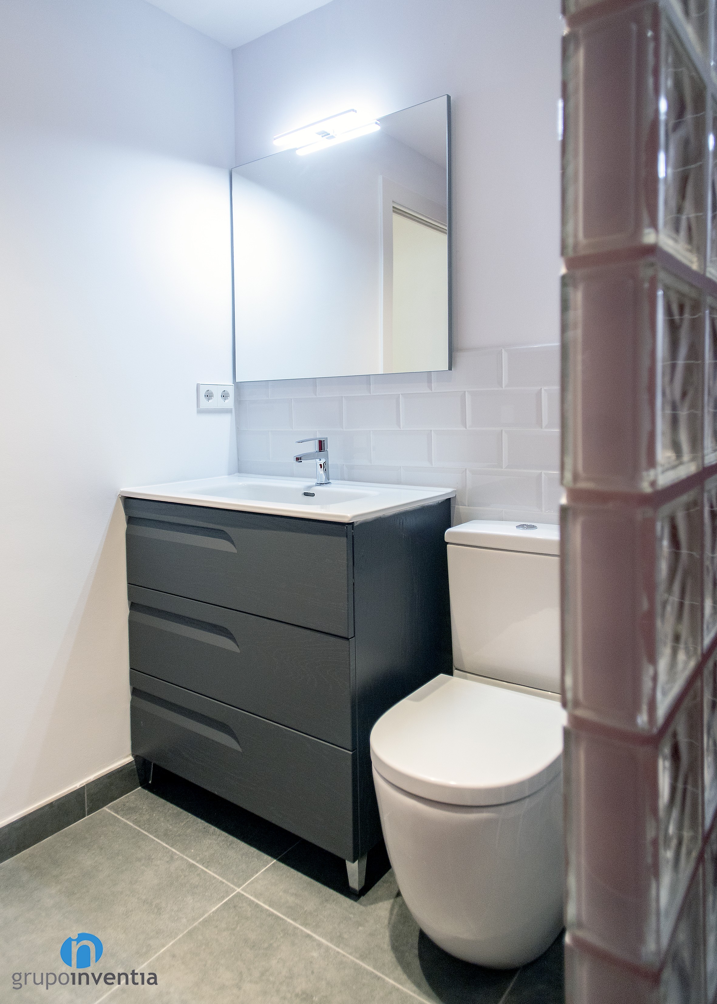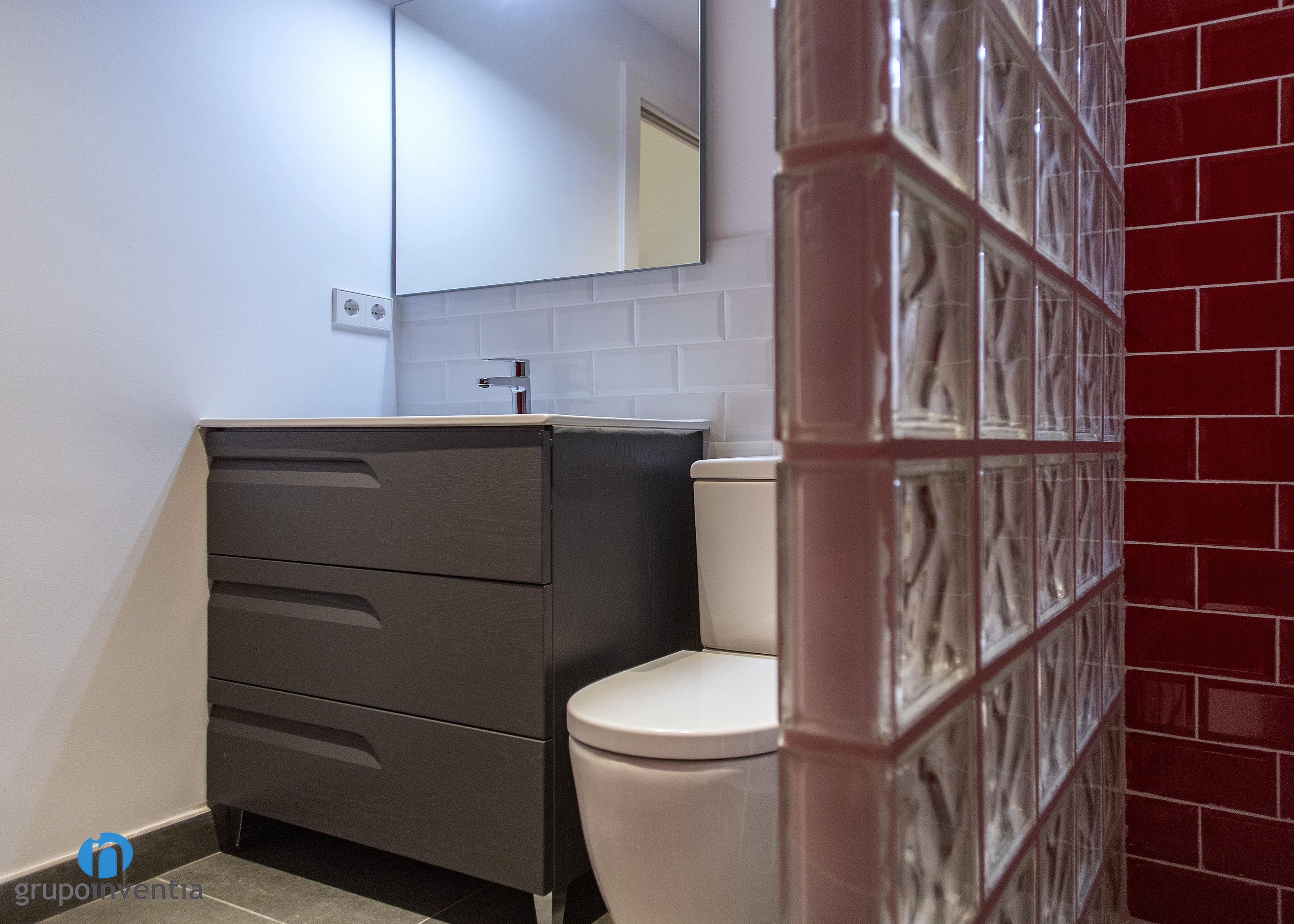 Amb la reforma de bany l’estança compta amb un nou equipament sanitari a punt per oferir les millors prestacions. Aquest consta d’un lavabo amb moble d’emmagatzematge, un vàter i una dutxa. La separació d’aquesta es va realitzar amb una paret de vidre, aportant una imatge moderna i amb molta personalitat a l’estança.
