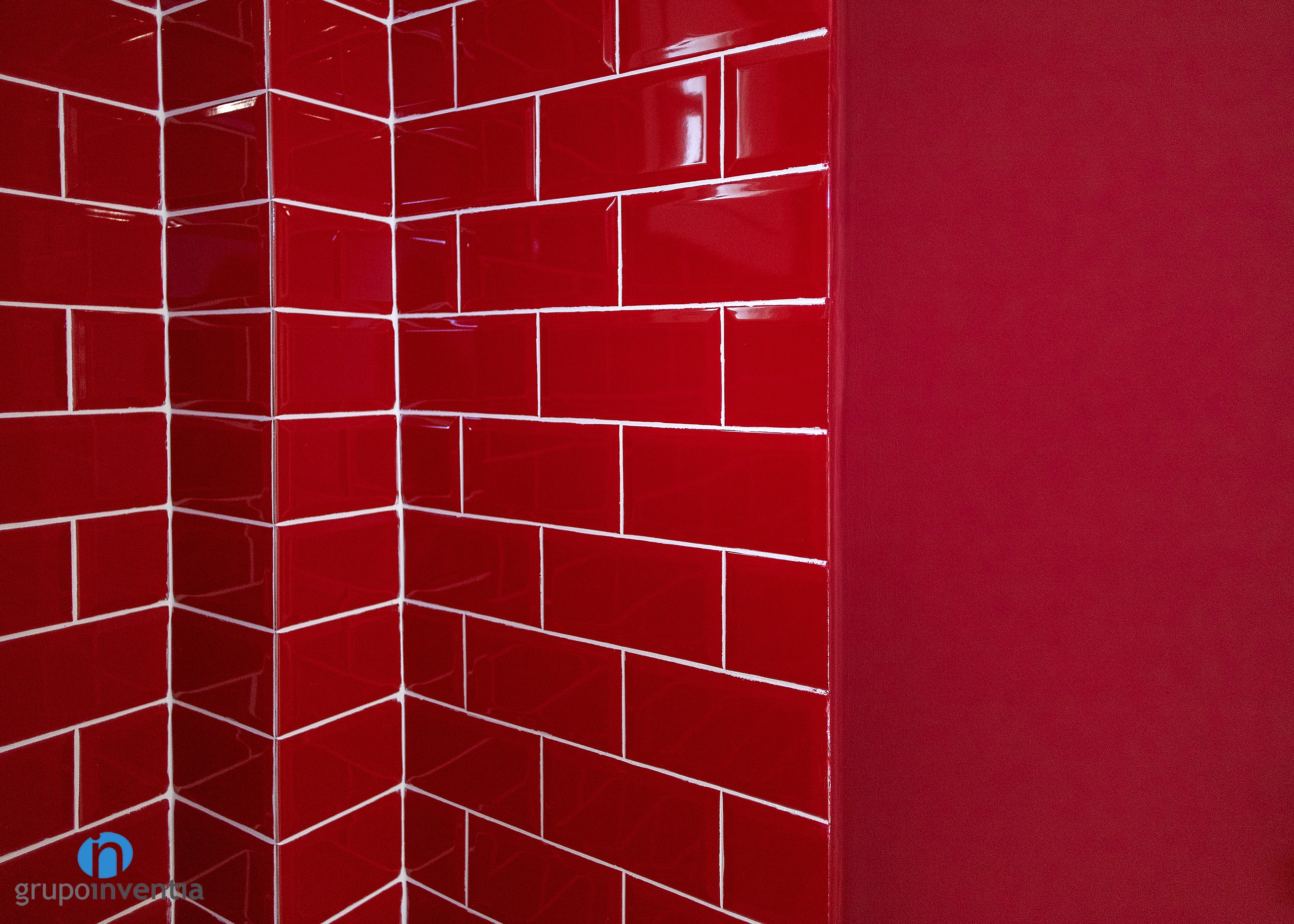 Quant a la seva nova imatge, la paret de l’esquerra es va enrajolar a mitja altura amb rajoles bisellades blanques i es va pintar del mateix color la resta de paret fins arribar al sostre. A la paret de la dreta es va realitzar el mateix procés però utilitzant rajoles i pintura de color vermell. Les rajoles bisellades vermelles s’estenen fins a la paret de la dutxa.