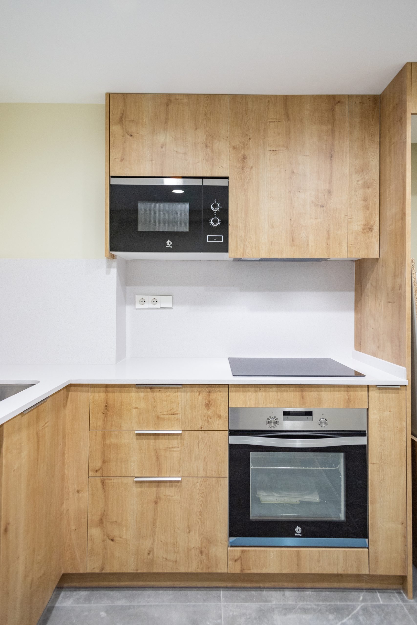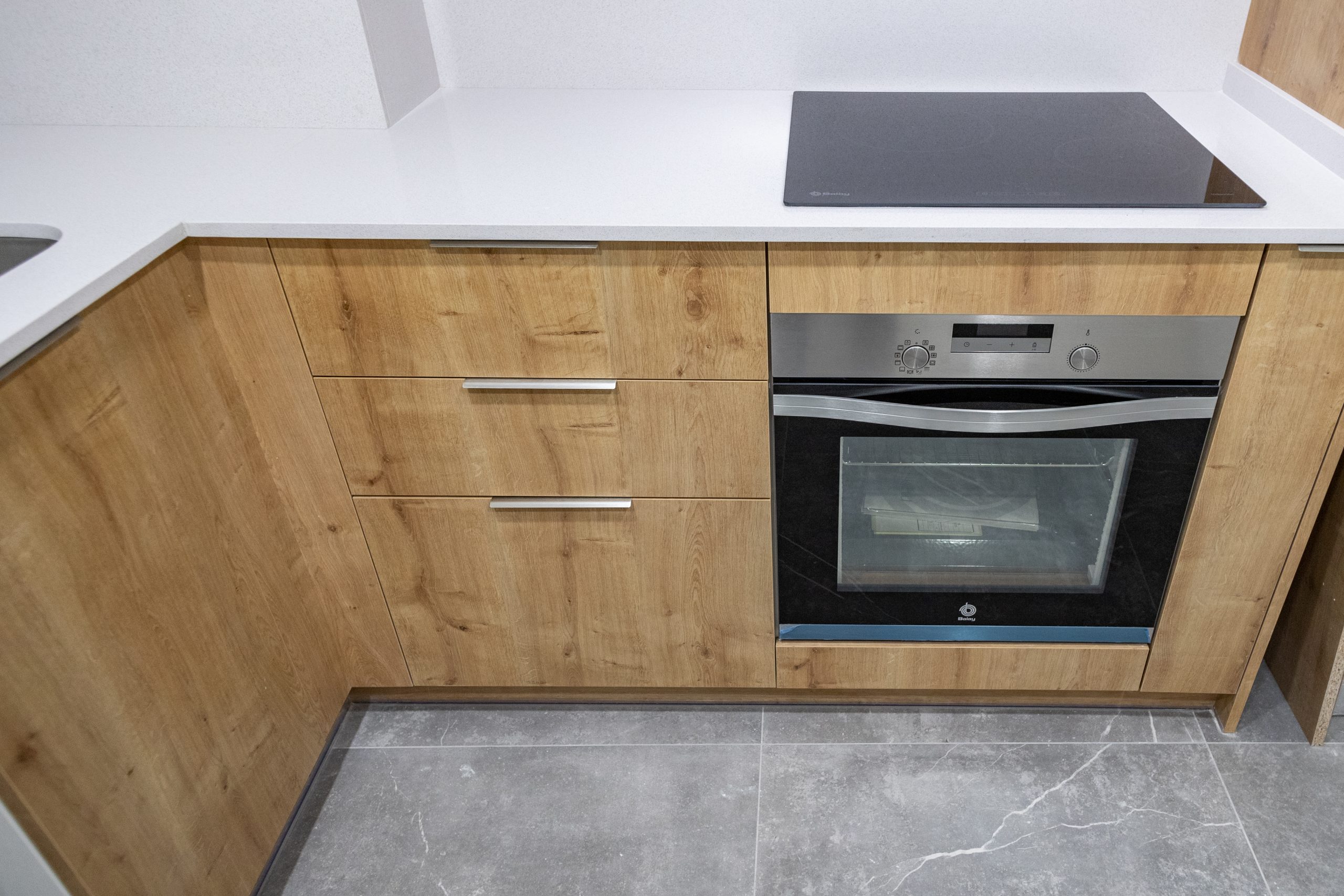 El taulell torça cap a l’esquerra i dóna pas a un segon tram equipat amb una pica d’un si. A la part inferior compta amb un buit a mida per integrar el rentaplats i més capacitat demmagatzematge. Per al moble d’aquesta reforma de cuina s´ha escollit un acabat en tons mitjans de fusta. Combina molt bé amb els tons neutres de les parets i el color gris del nou paviment de cuina.