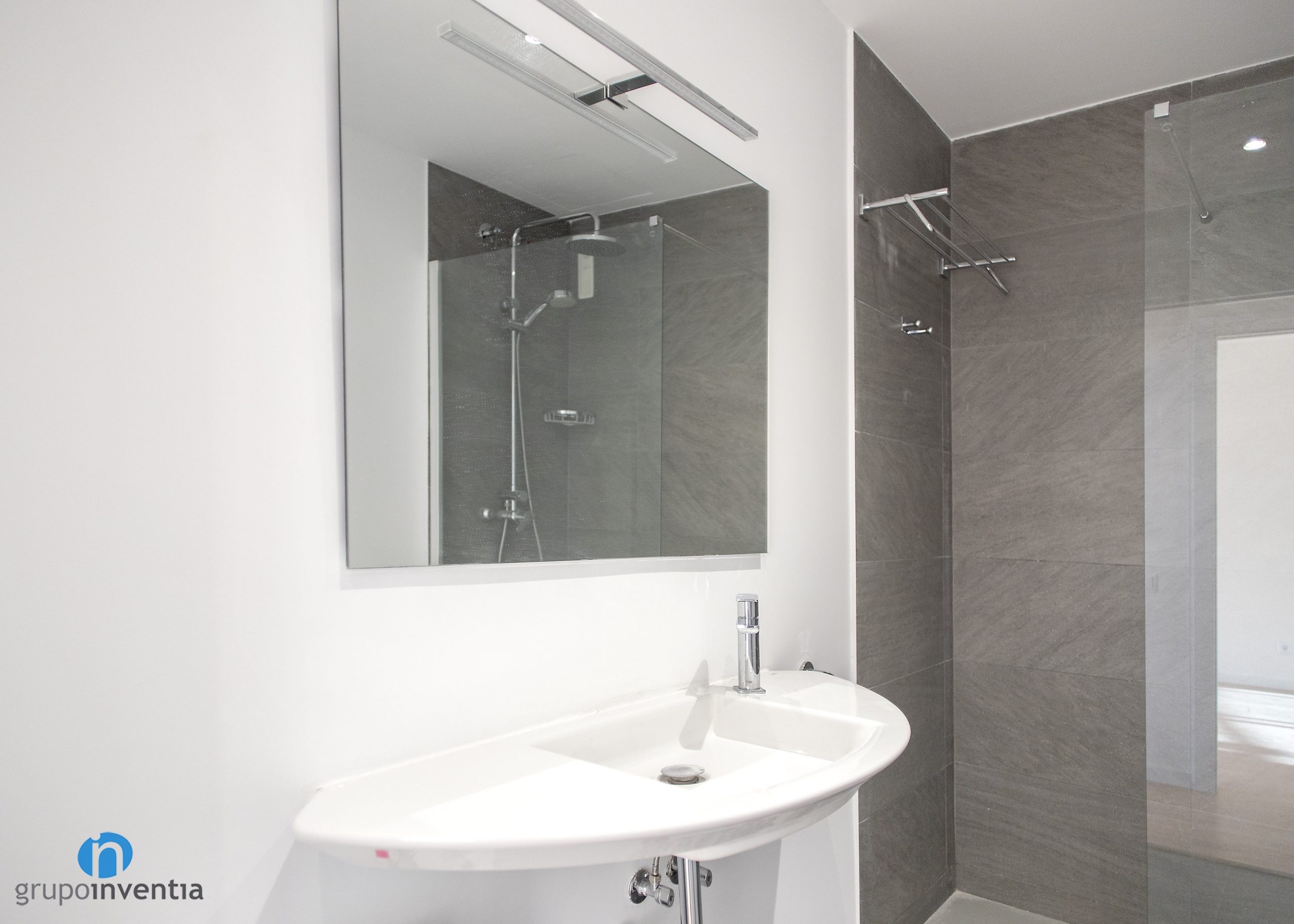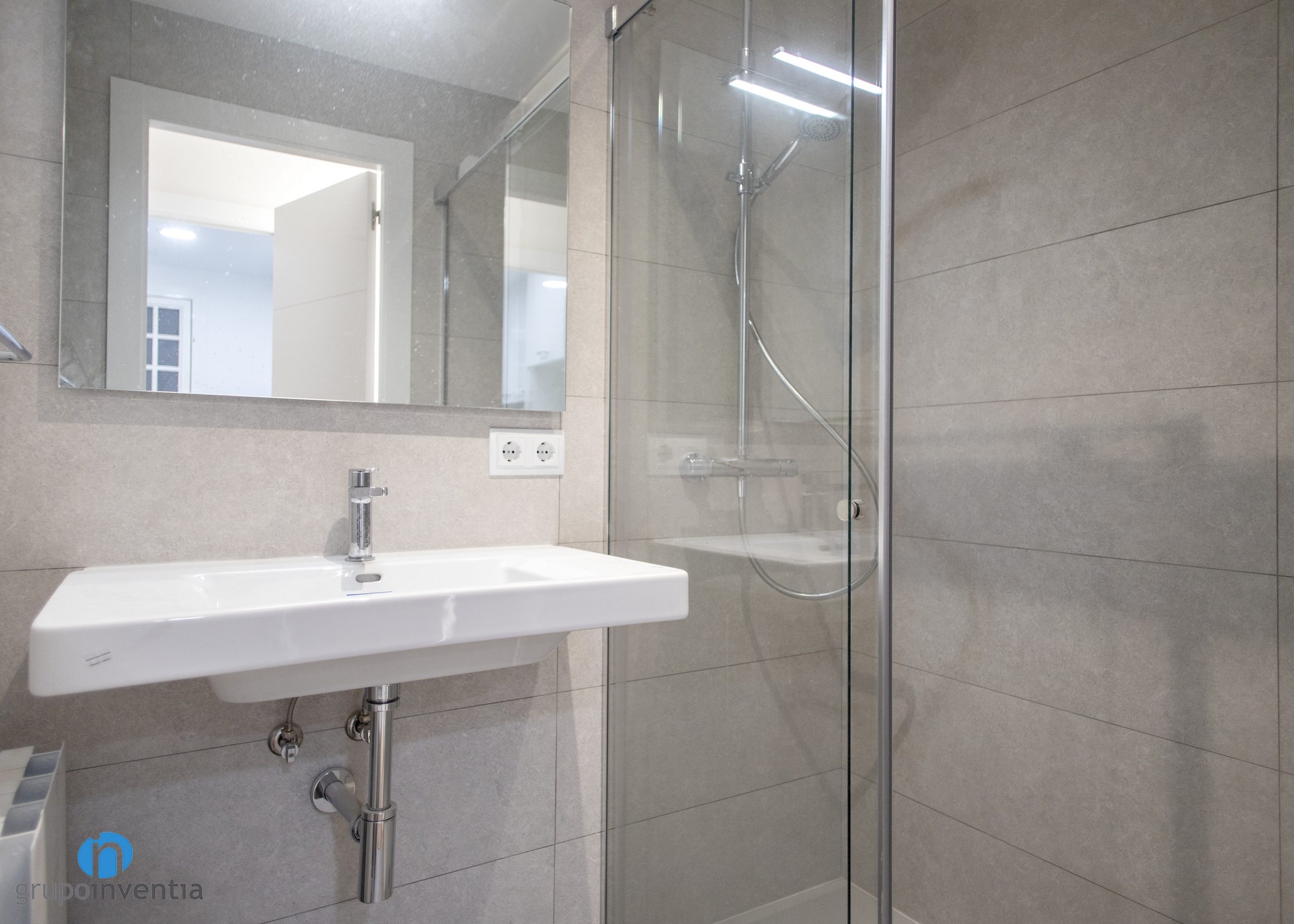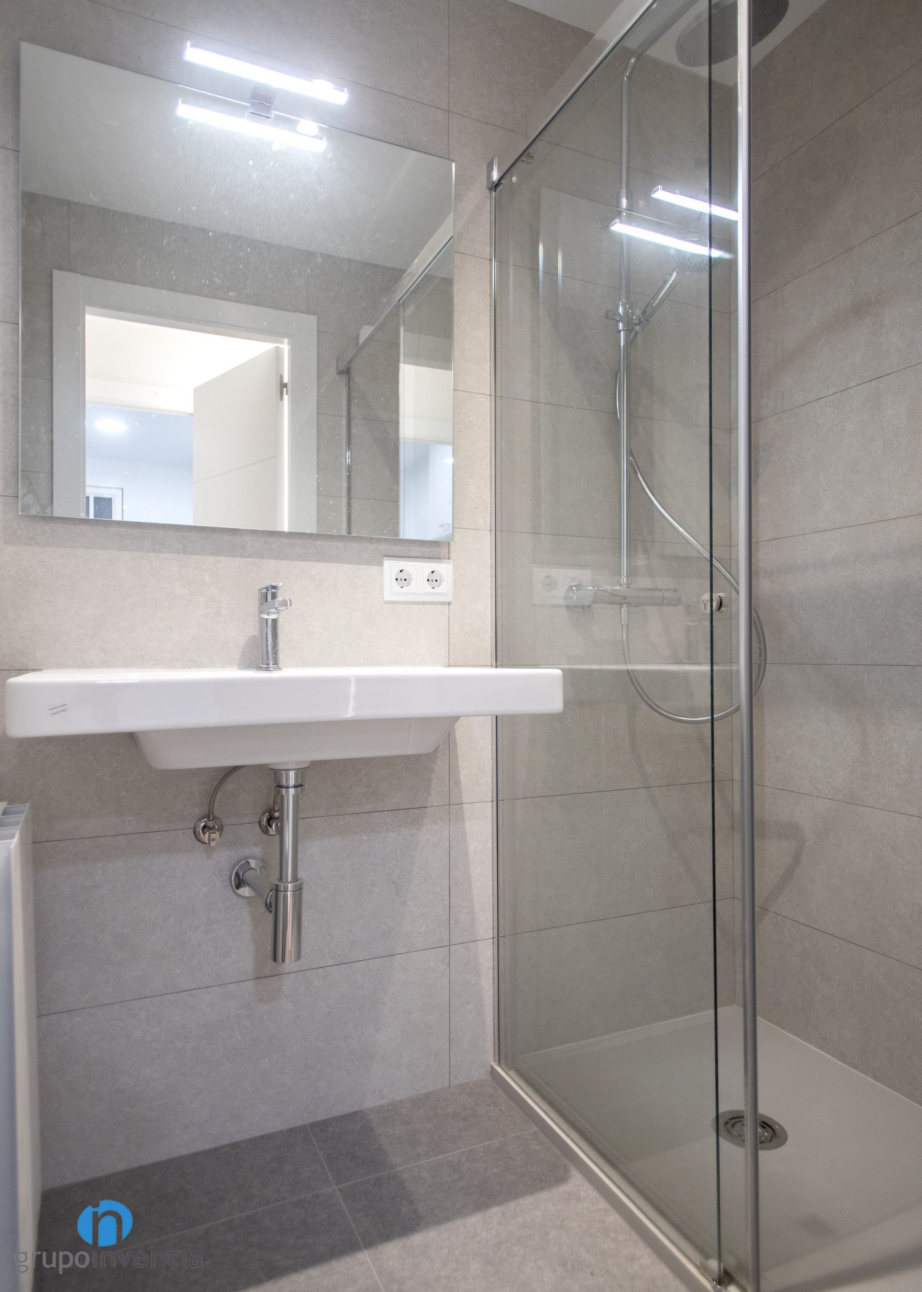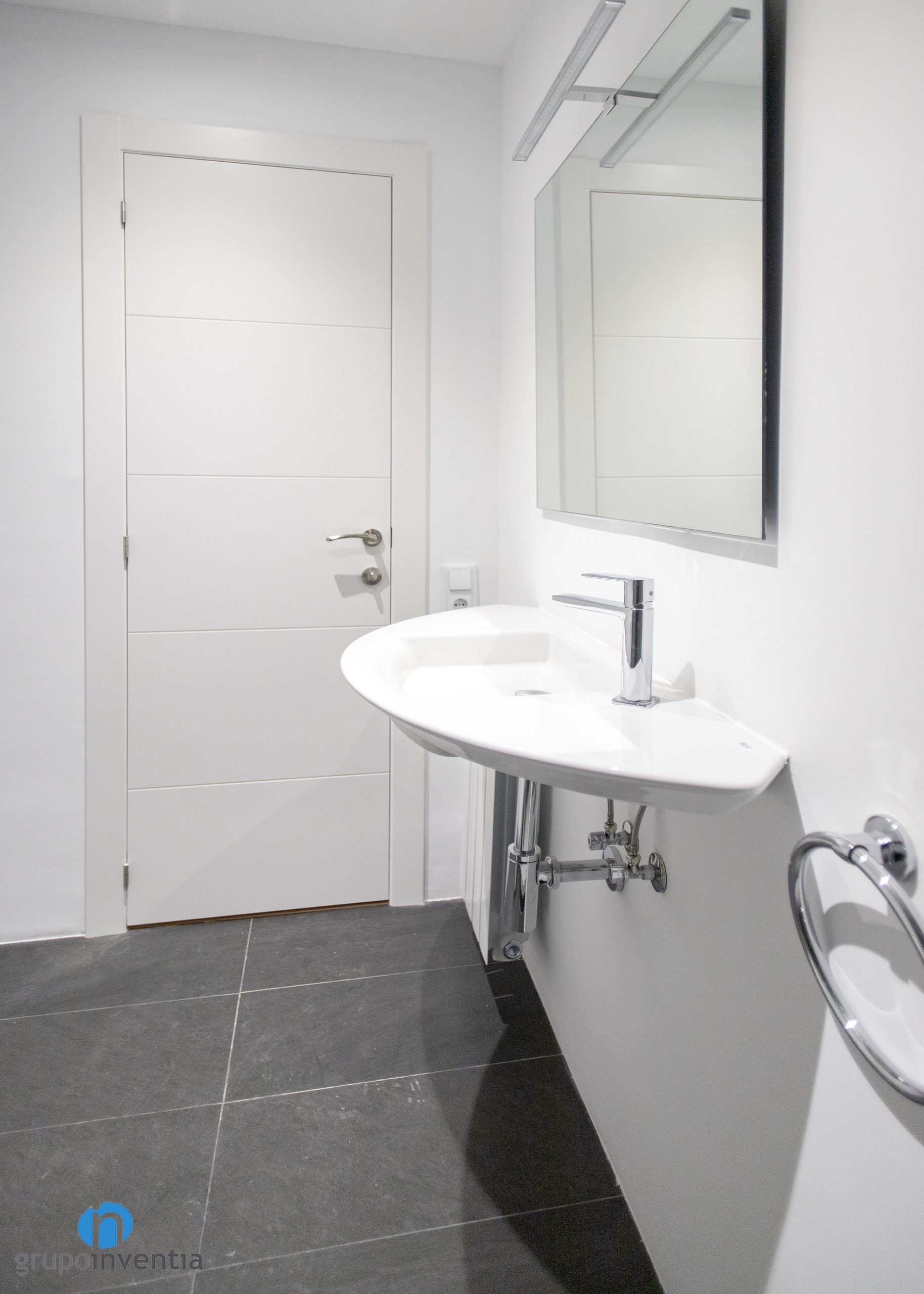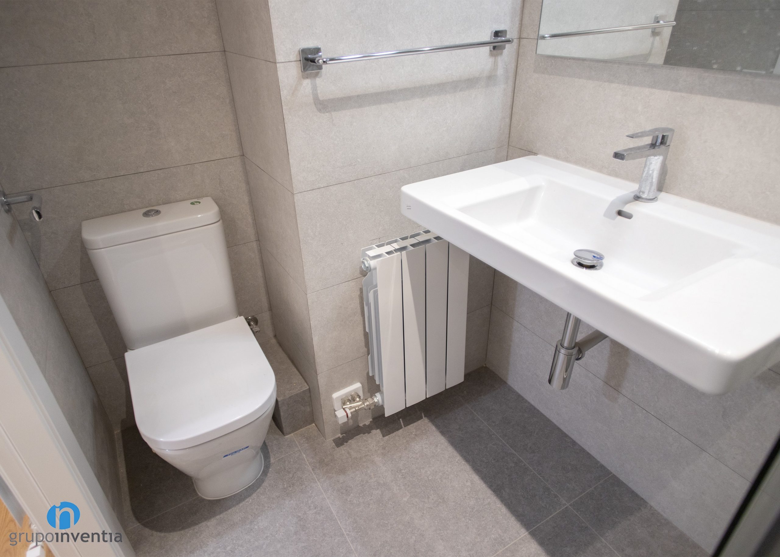L’habitatge que ens hem encarregat de reformar compta amb dos banys. En tots dos casos s’ha utilitzat un disseny interior molt similar, aconseguint homogeneïtzar les dues estances. Al bany principal les parets s’han pintat de blanc i s’han combinat amb un paviment i rajoles de color gris. Al bany de cortesia s’ha optat per enrajolar del tot les parets amb rajoles beige.