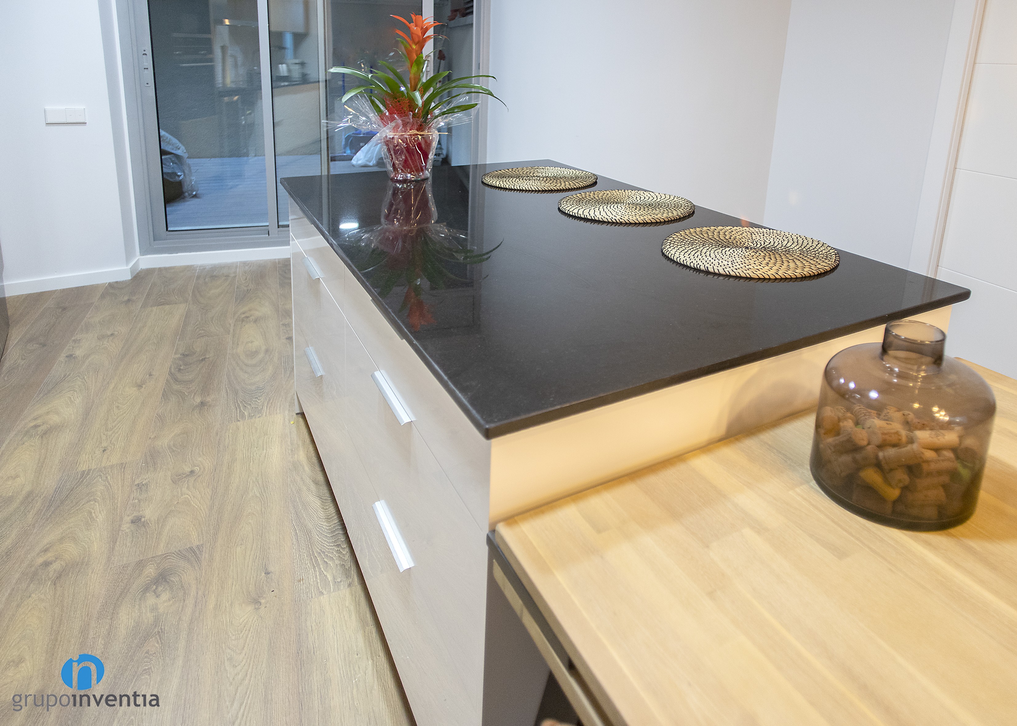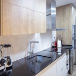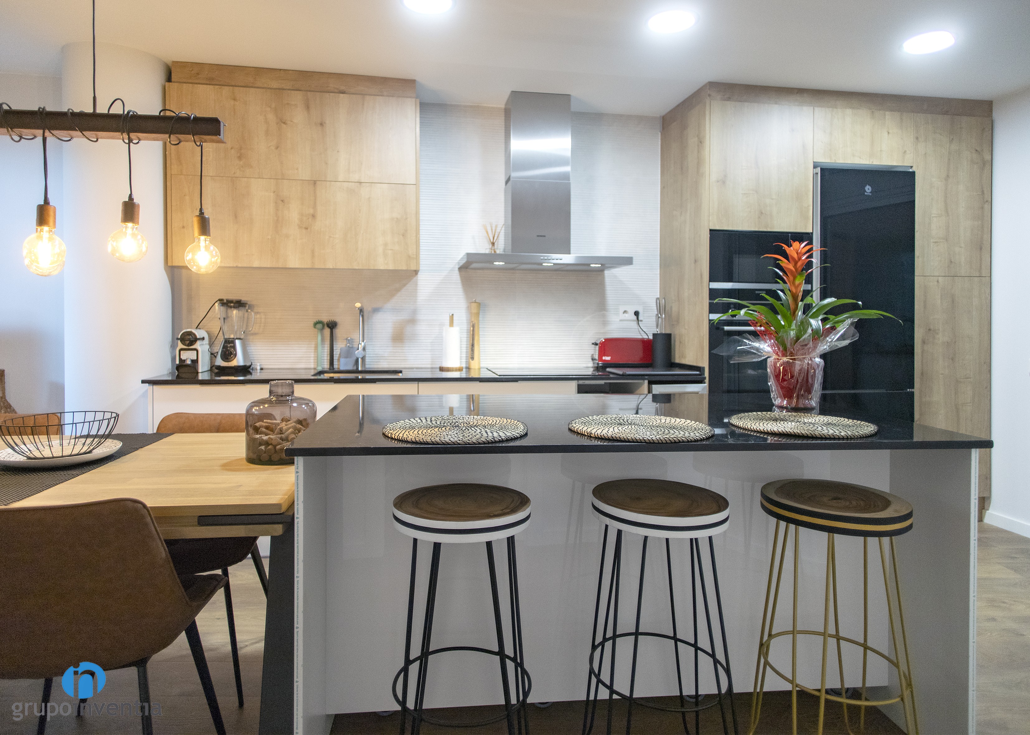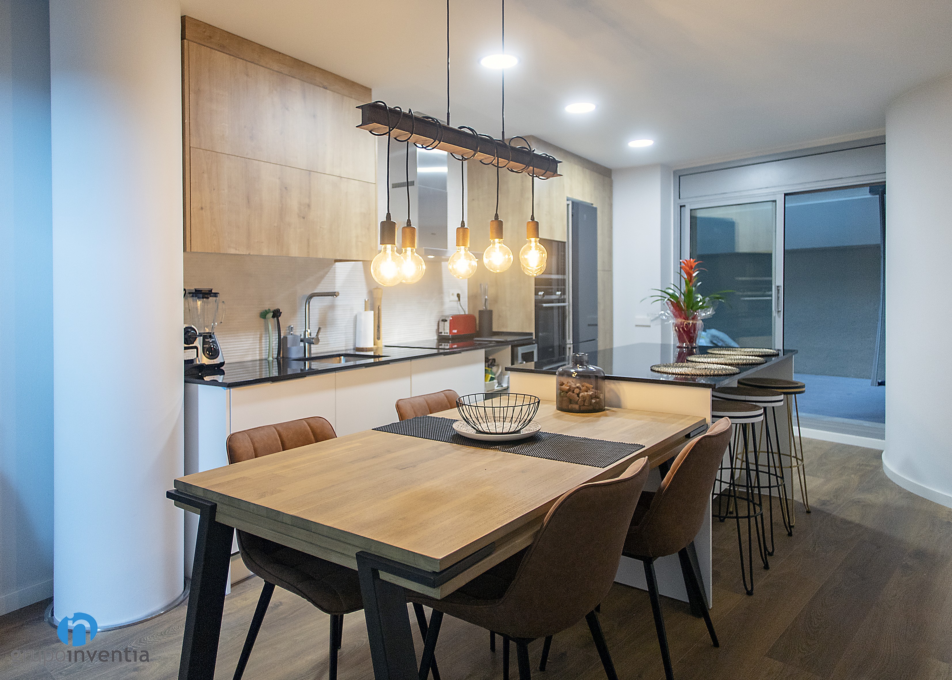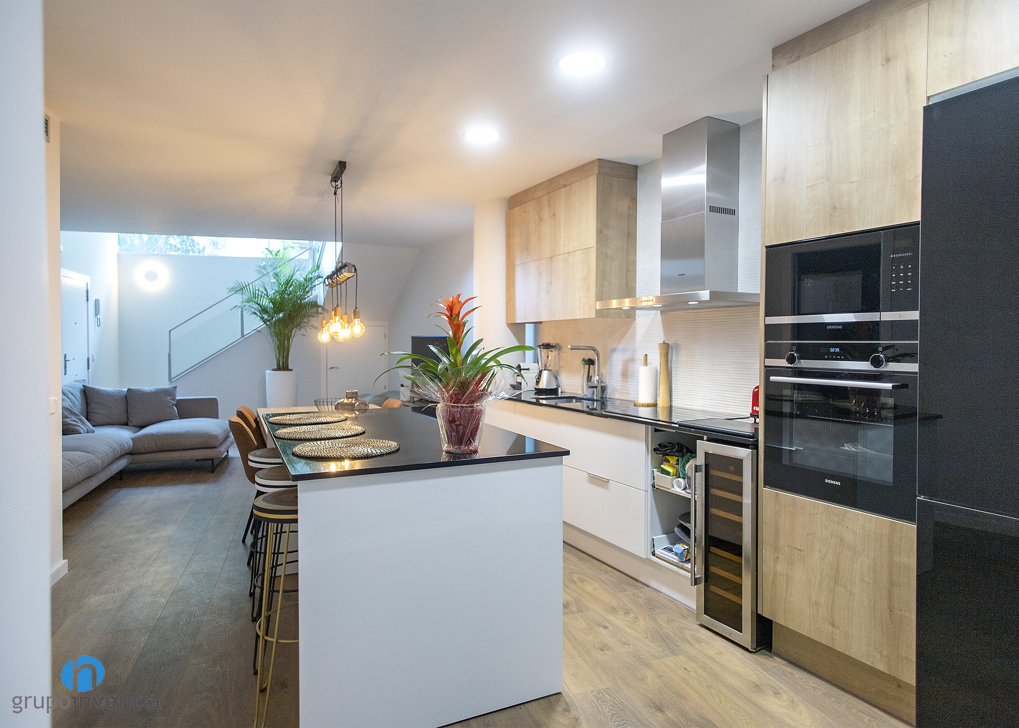 Es tracta d’una cuina oberta i distribuïda a dos fronts. S’hi va aconseguir generar un espai tan funcional com acollidor, combinant un equipament de cuina modern i mantenint l’estil contemporani que es va imprimir a tot l’habitatge. El costat obert el componen una barra d’esmorzar, que al seu torn ofereix superfície de suport, i una taula amb capacitat per varis comensals.