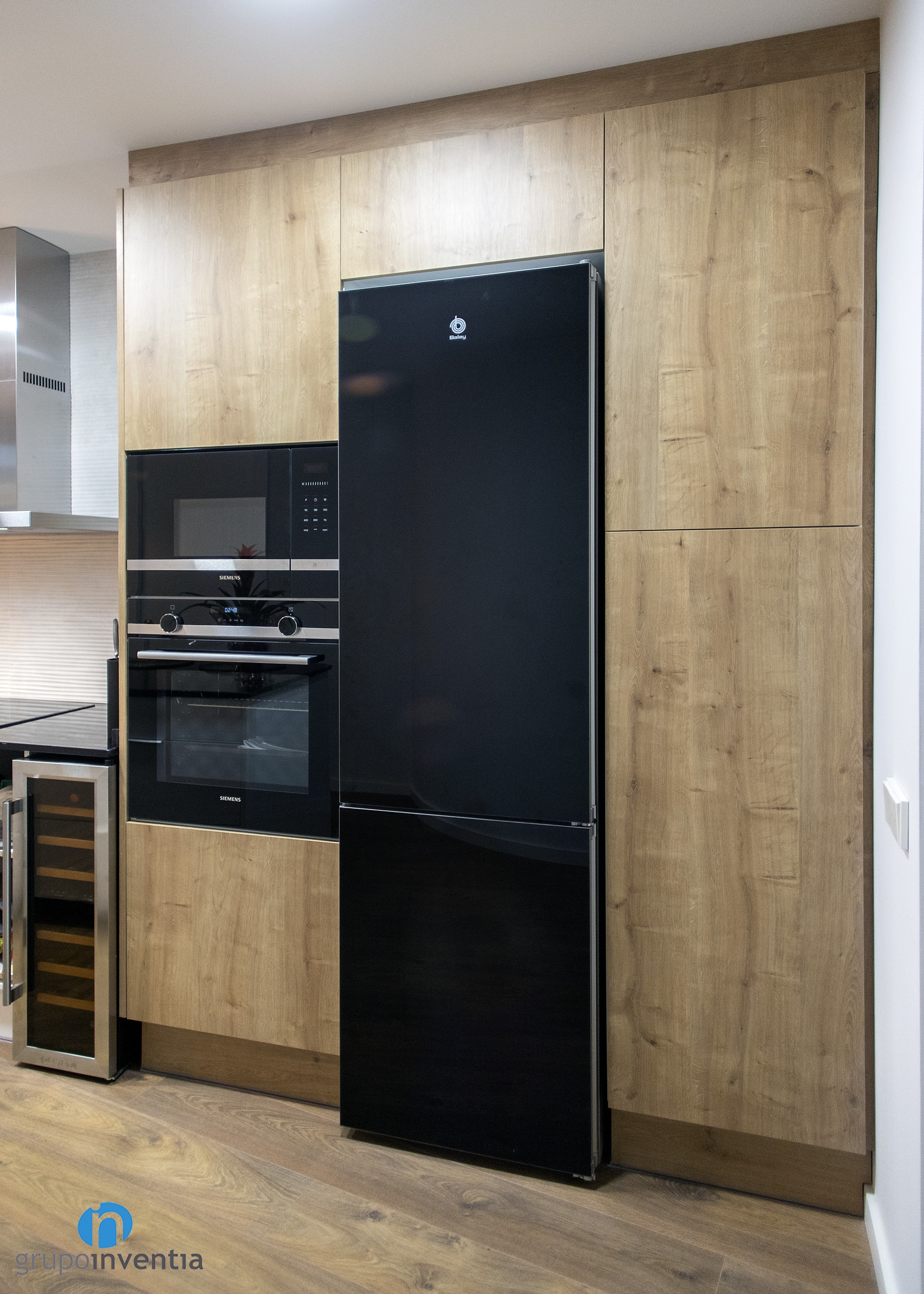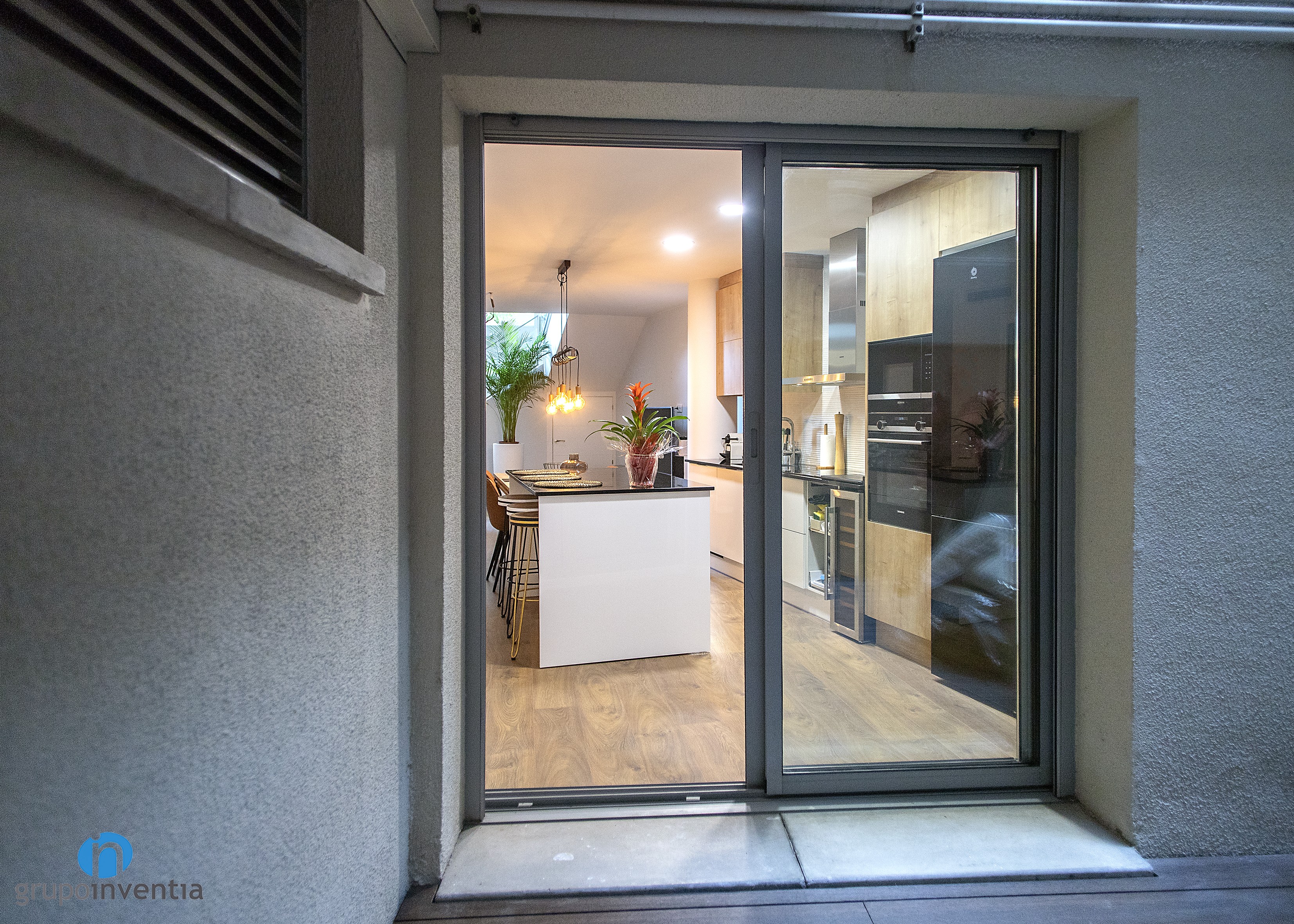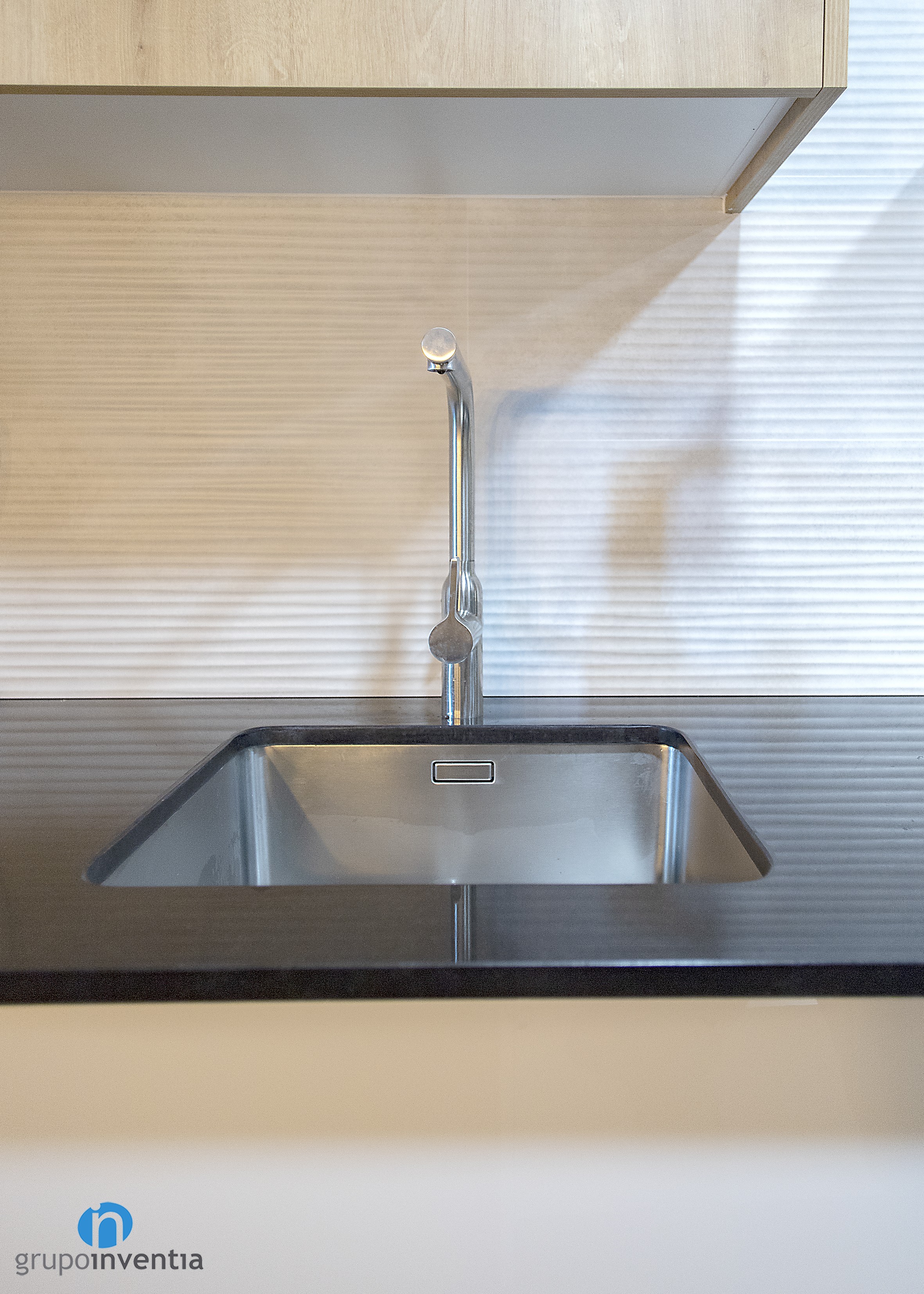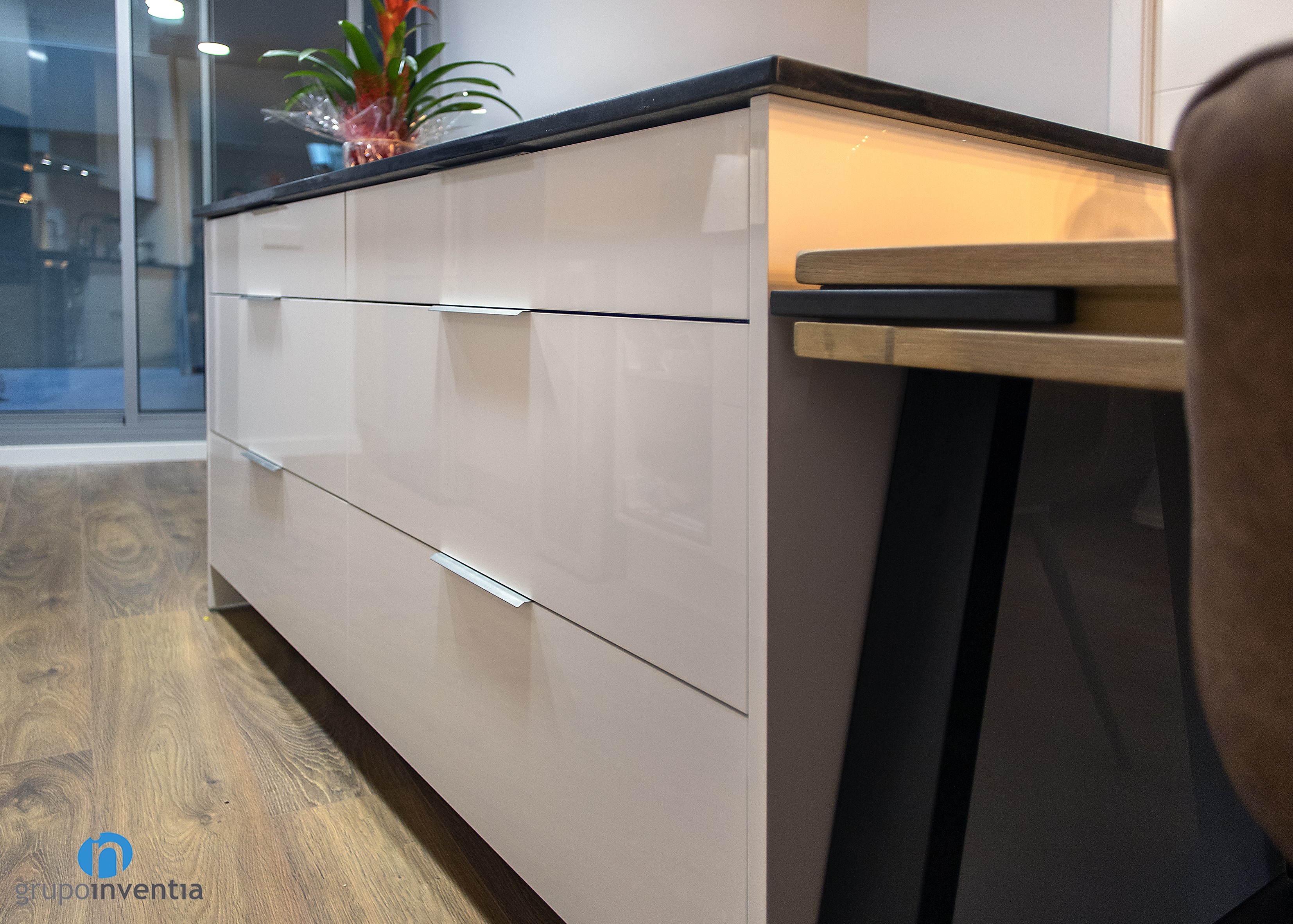 Es tracta d’una cuina oberta i distribuïda a dos fronts. S’hi va aconseguir generar un espai tan funcional com acollidor, combinant un equipament de cuina modern i mantenint l’estil contemporani que es va imprimir a tot l’habitatge. El costat obert el componen una barra d’esmorzar, que al seu torn ofereix superfície de suport, i una taula amb capacitat per varis comensals.