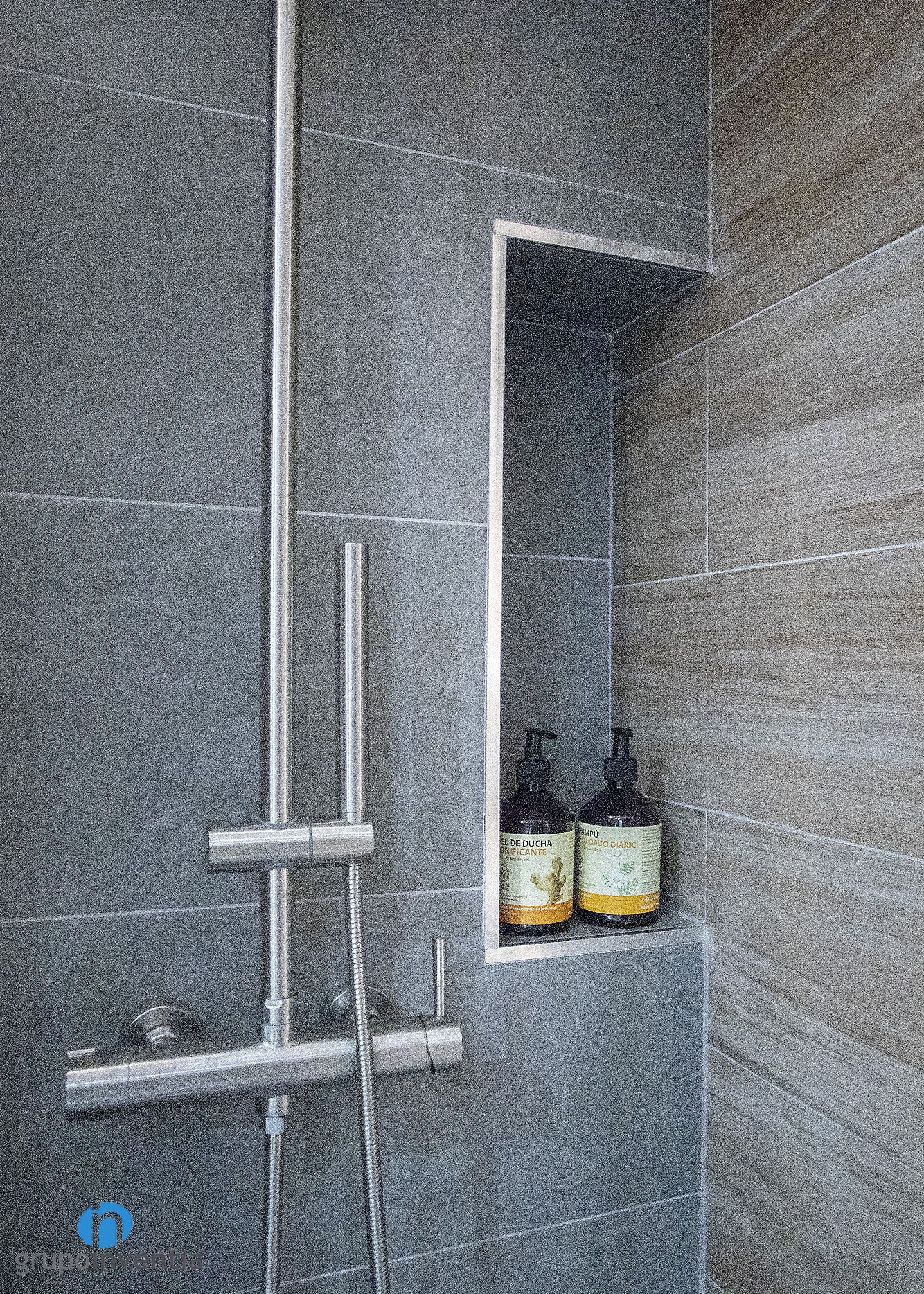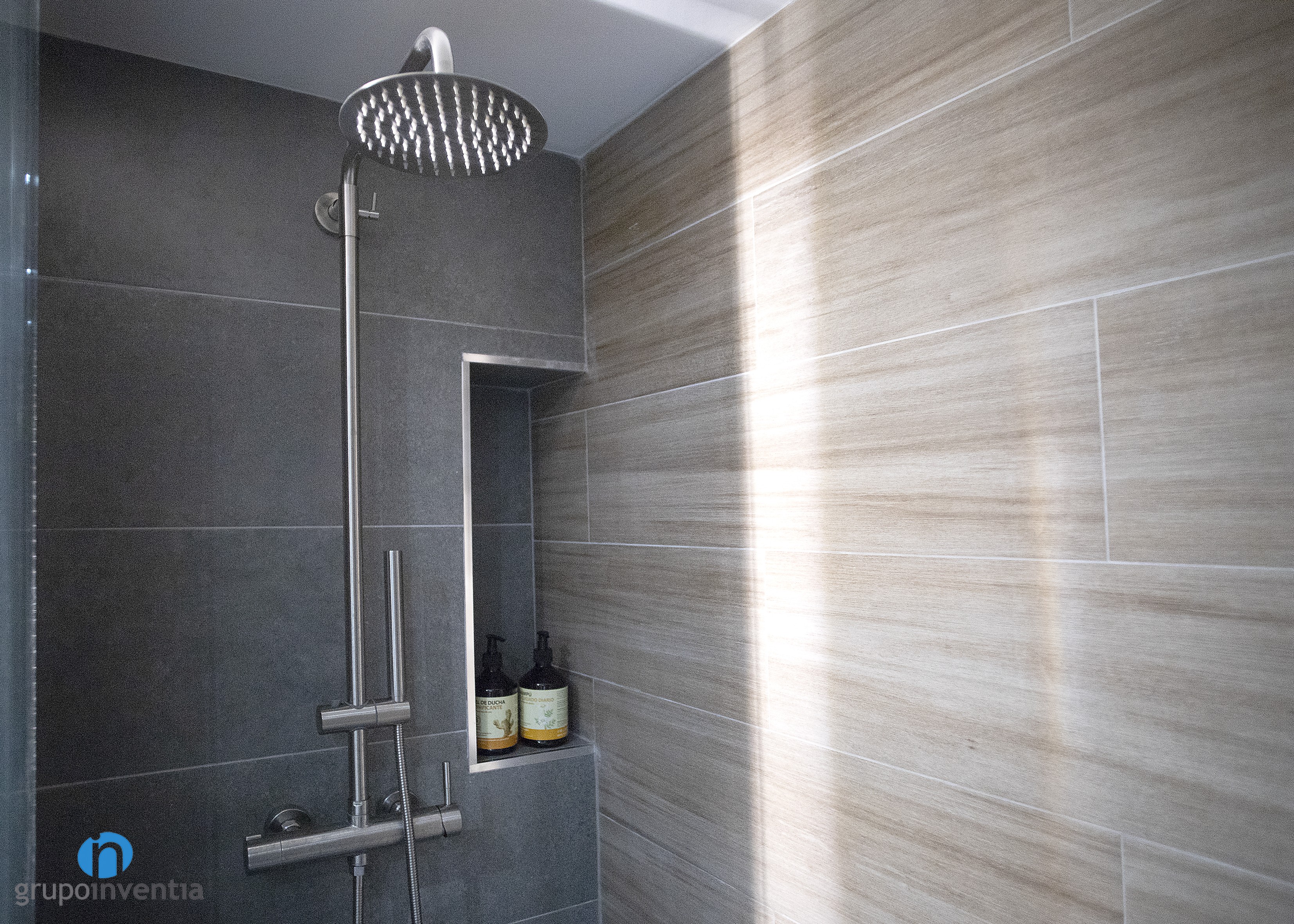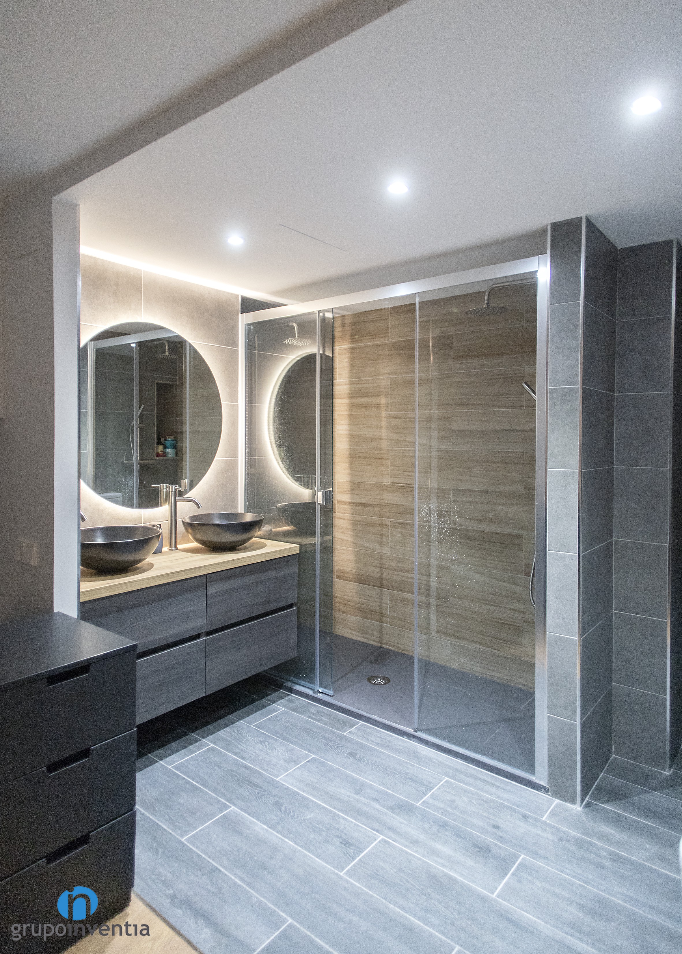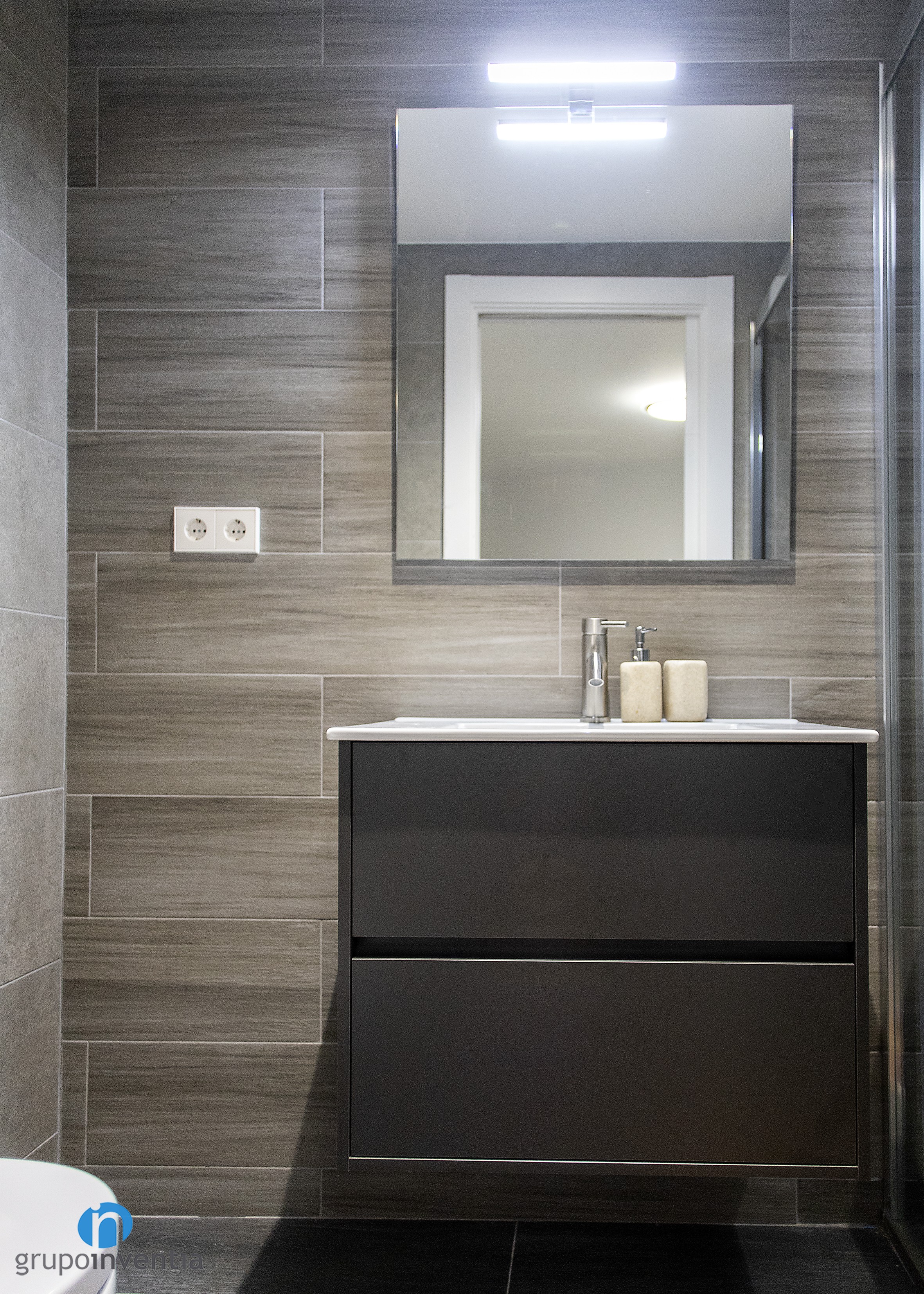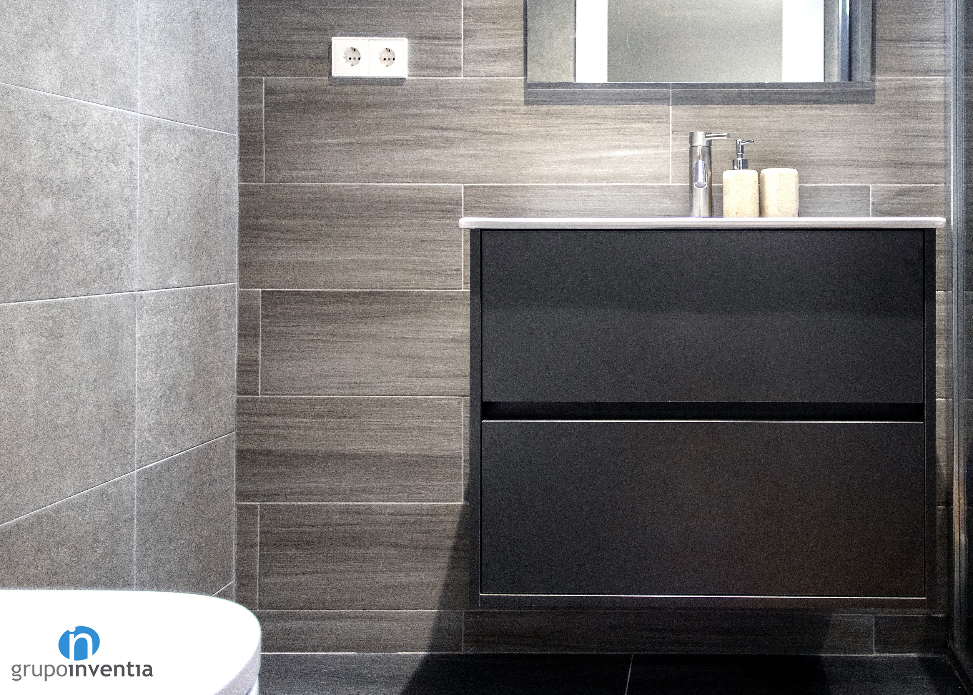 Aquest últim aspecte és possible gràcies a un projecte d’interiorisme perfecte i encertat. Les parets es alicataron amb rajoles de to fosc, encara que algunes d’elles es va enrajolar amb rajoles que presenten acabats en fusta. Aquest detall combina molt bé amb els mobles de bany, també de fusta en to fosc, i un paviment de rajoles de color gris.