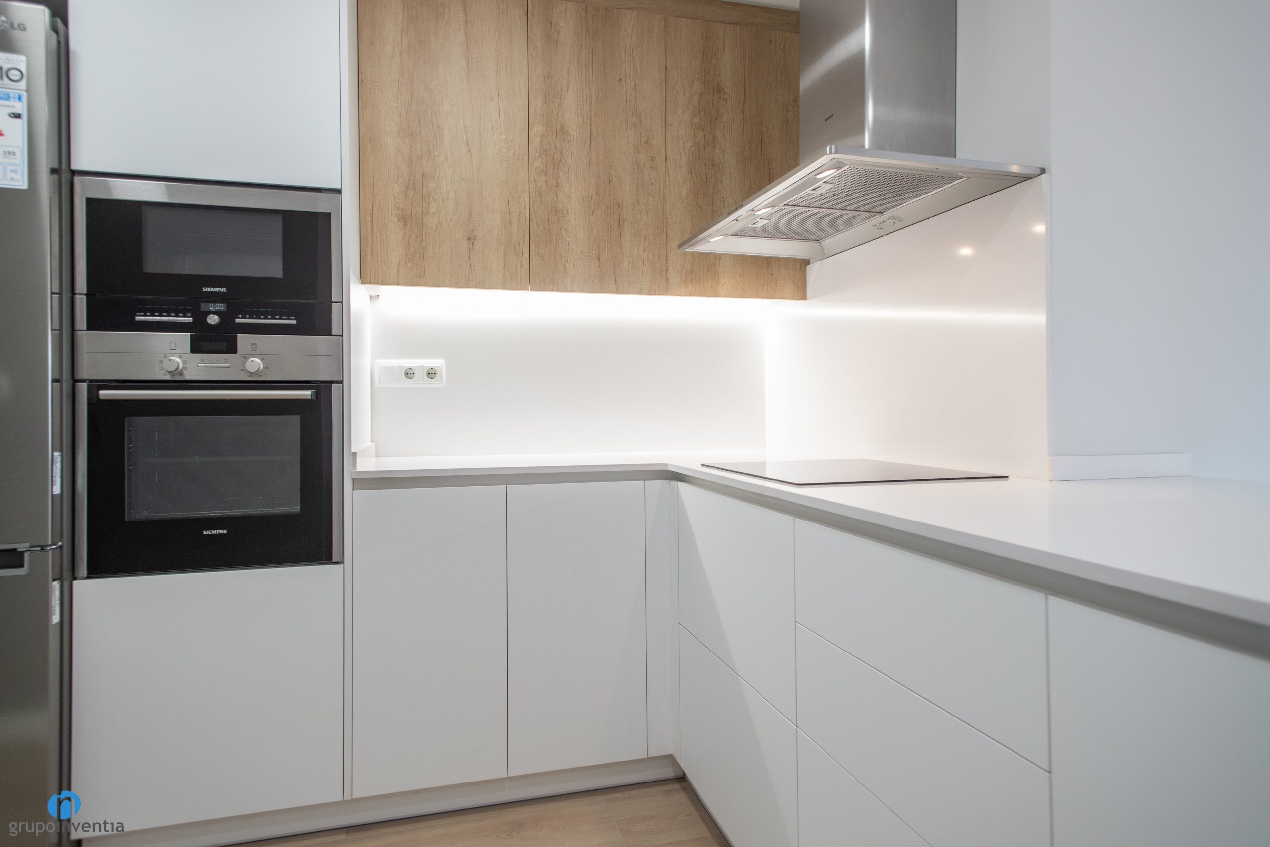 La nova cuina és de concepte obert i està distribuïda en forma de L. Donades les característiques del seu espai està disposició permet una correcta mobilitat. Cada nou element de la cuina se situa en el lloc indicat per a garantir la millor funcionalitat. Amb aquesta reforma de cuina s’ha dotat a l’espai d’una àmplia superfície de suport i d’una gran capacitat d’emmagatzematge.