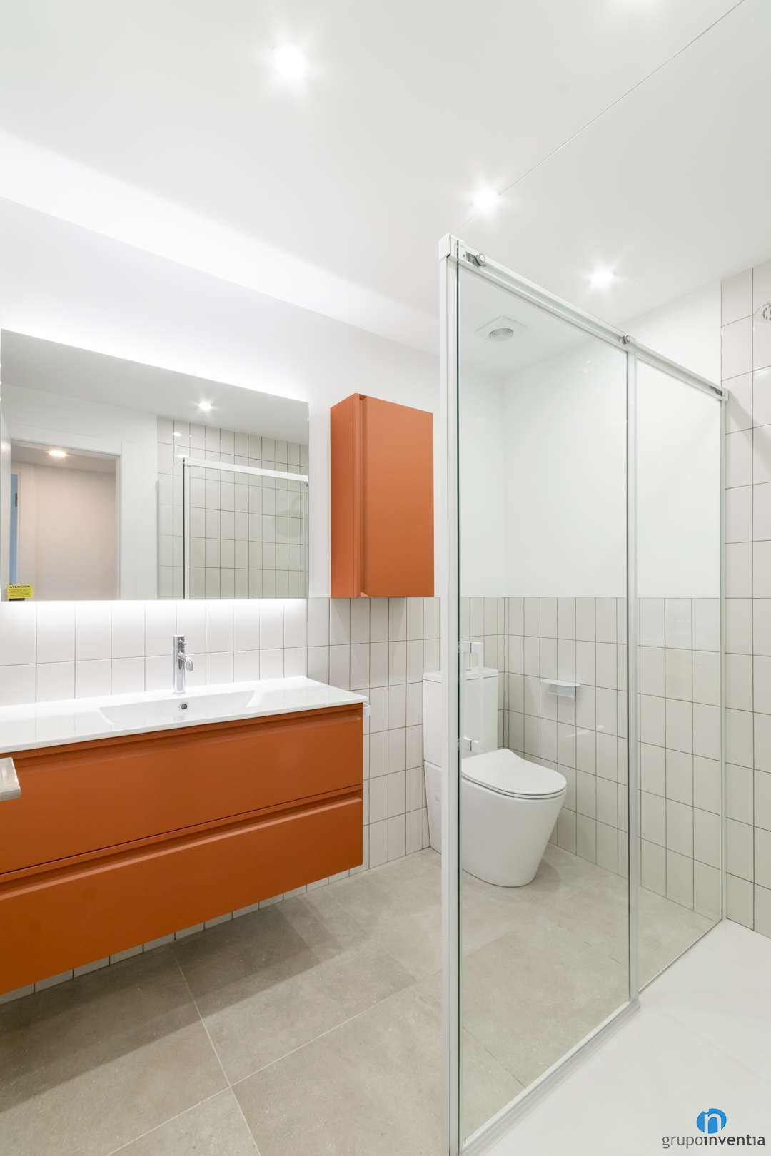 En aquest bany, seguint la tonalitat taronja de la cuina, trobem, un moble de dos calaixos suspès i un mòdul auxiliar del mateix to terracota que són la peça principal d’aquest. La resta del bany, per no sobrecarregar-lo, s’ha plantejat amb una rajola grisenca al terra, combinat amb una rajola de petit format a la paret, i pintura blanca.
