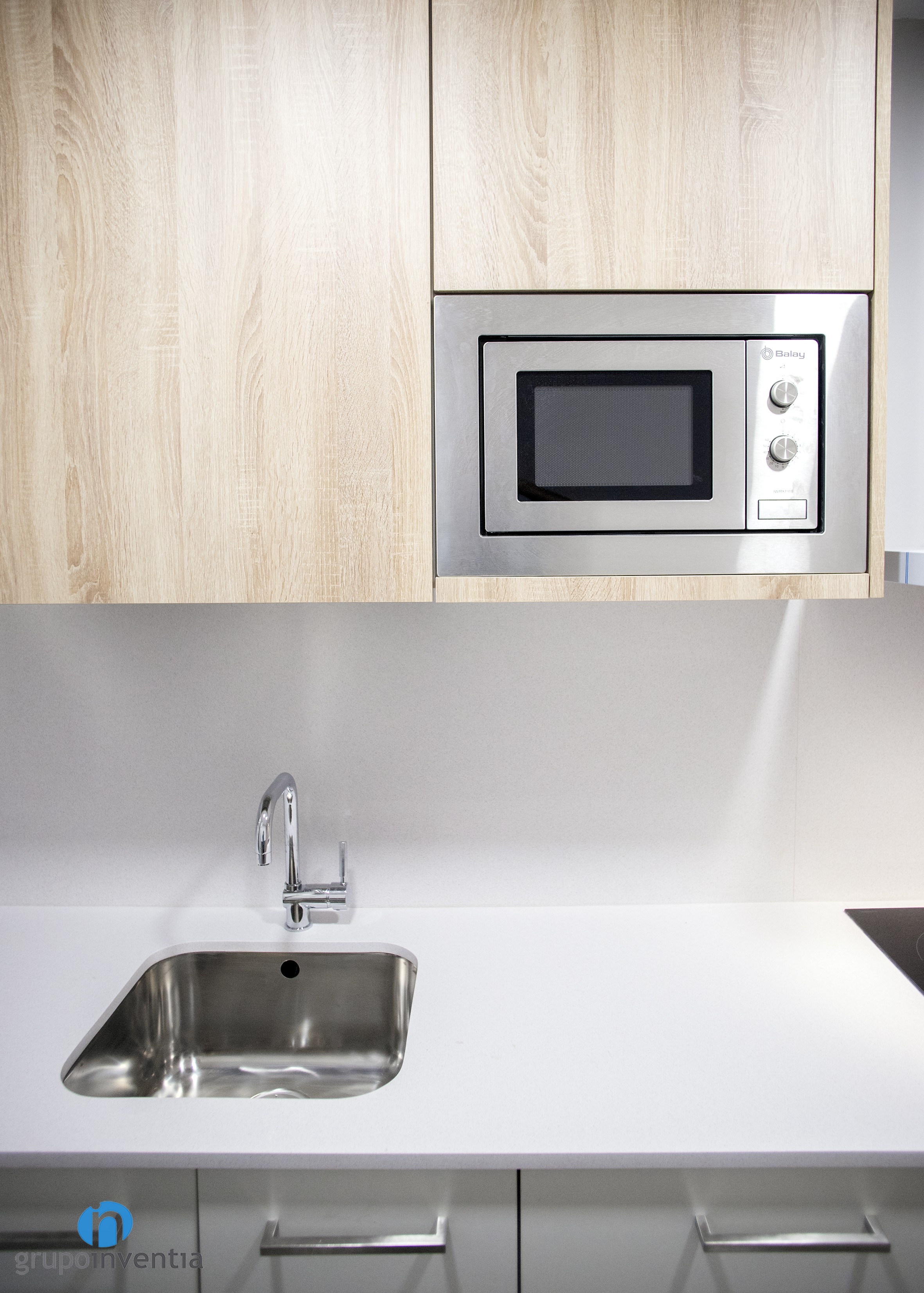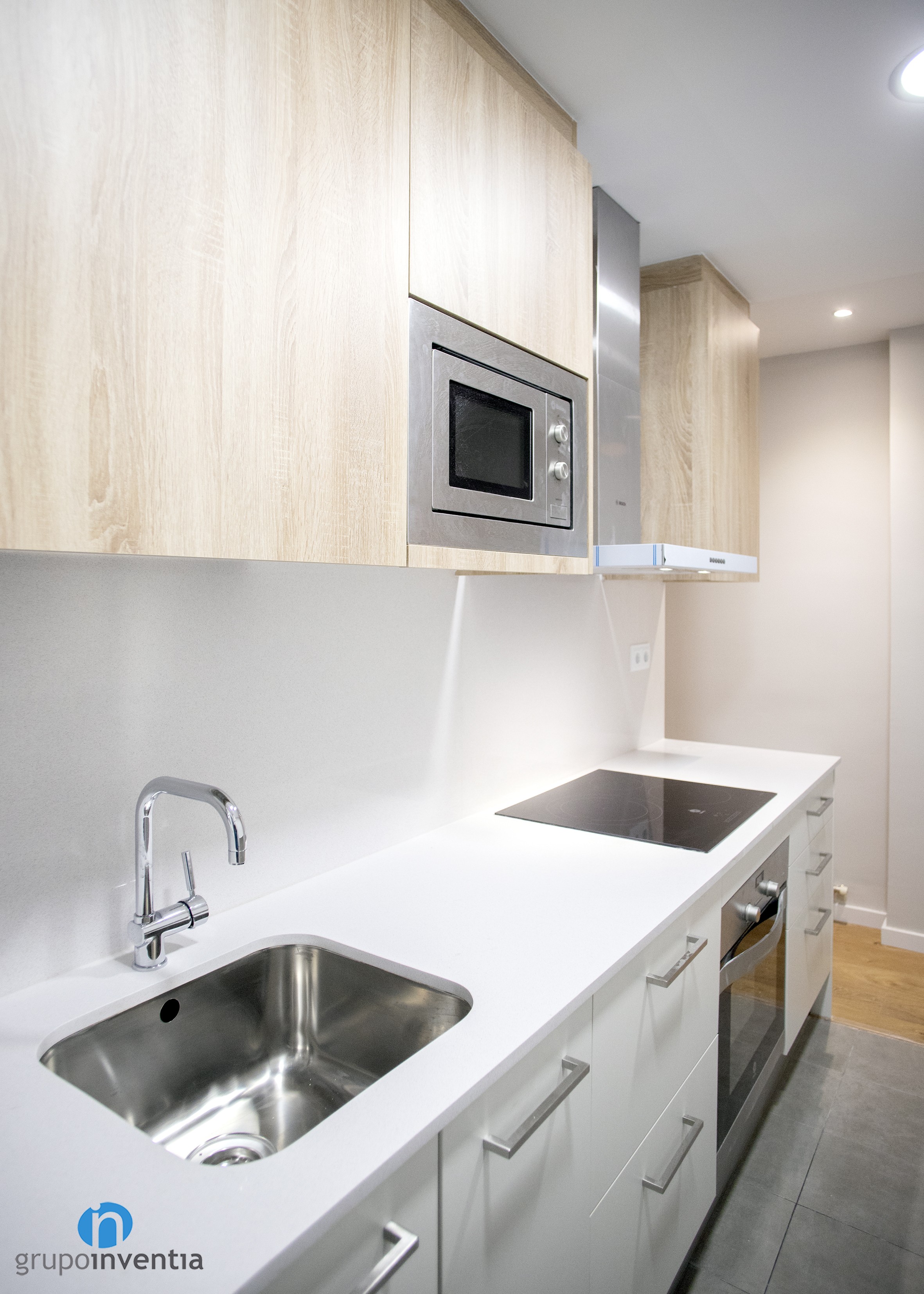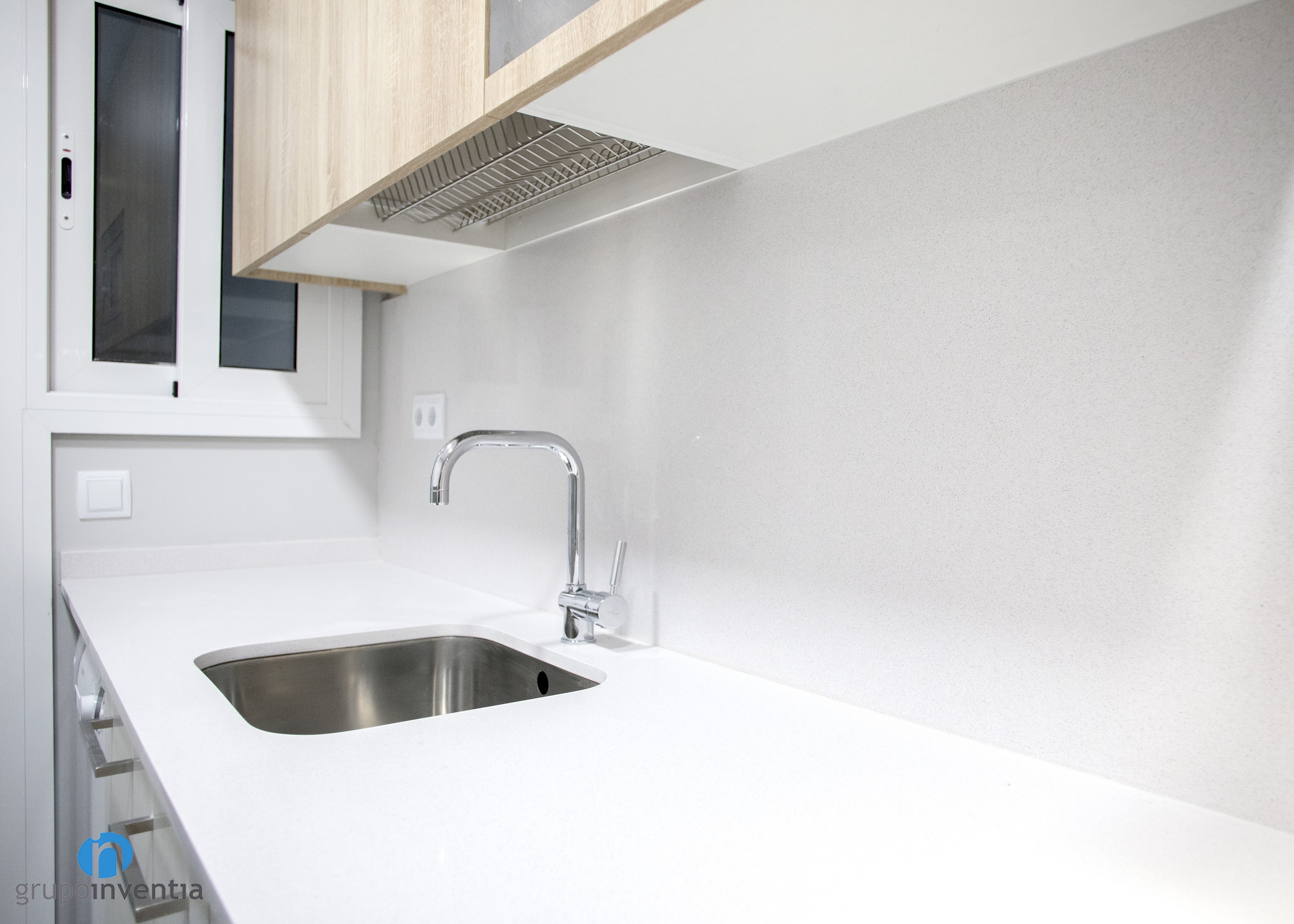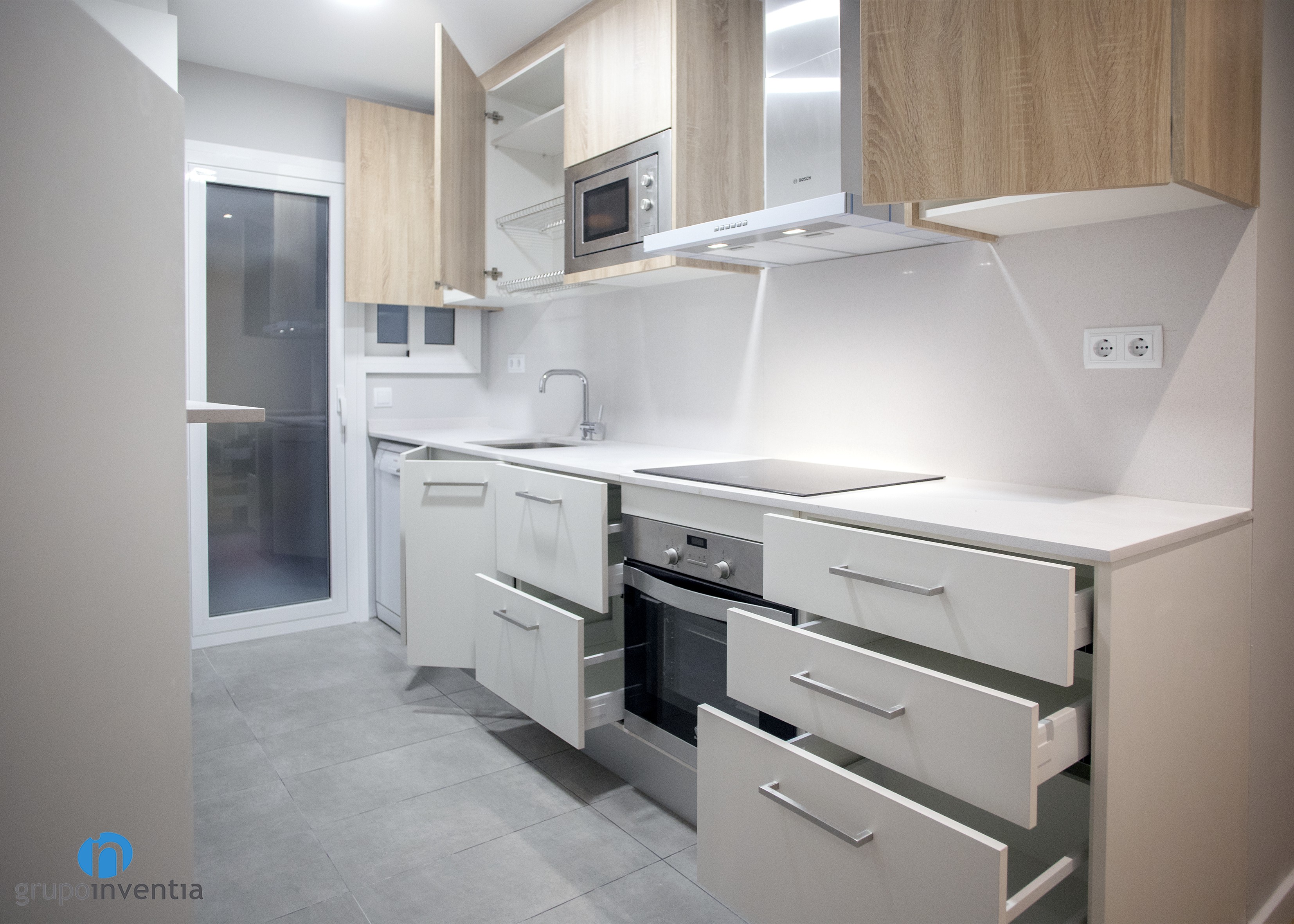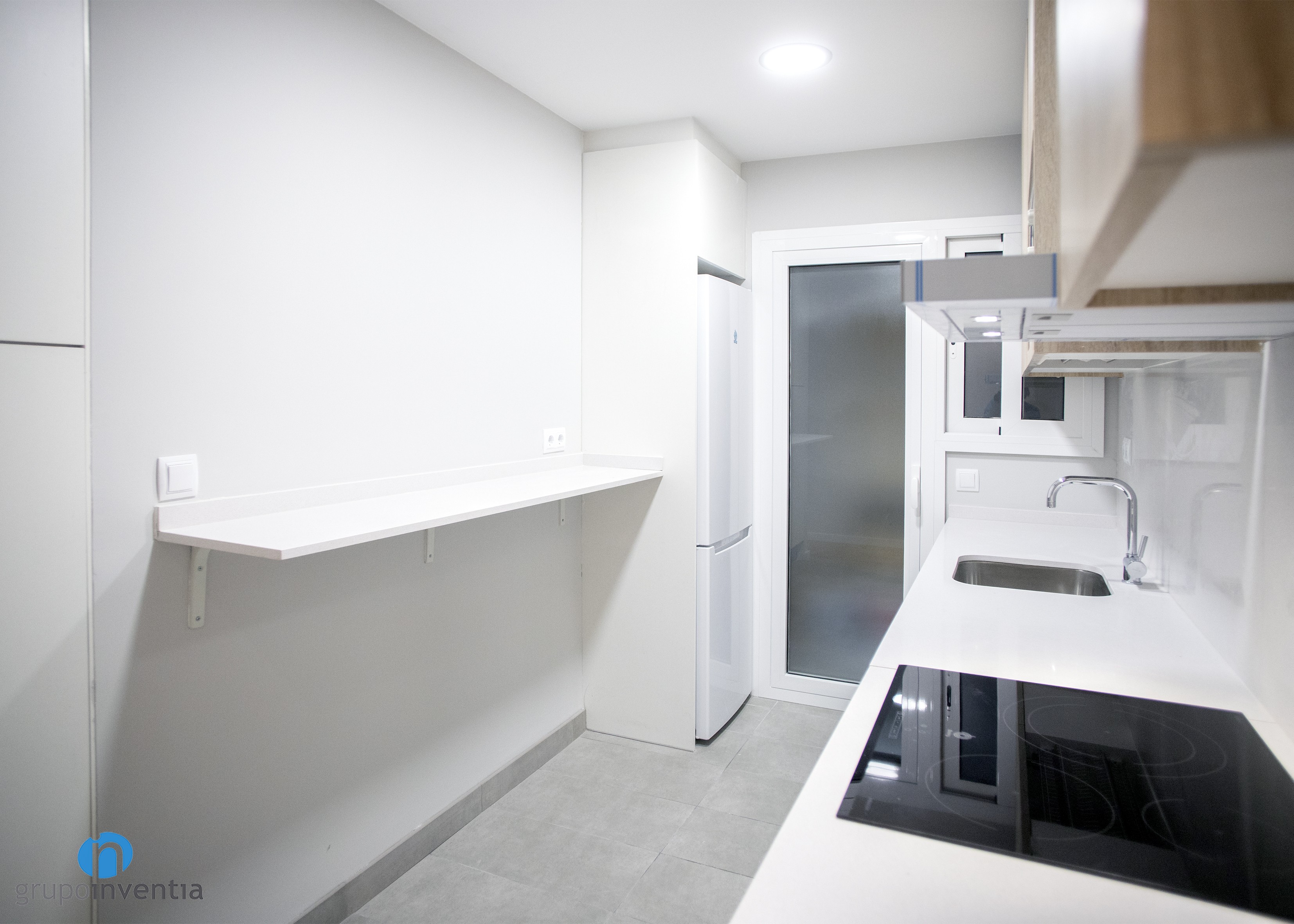 Per a la disposició dels nous elements es va utilitzar una distribució de cuina lineal, situant-se en la part dreta de l’estança. Aquesta l’ocupa una allargat taulell equipada amb una placa vitroceràmica i una pica individual. A més, compta amb capacitat d’emmagatzematge a la part inferior, on es va encastar el forn i el rentaplats, i en la superior, lloc escollit per encastar al microones.