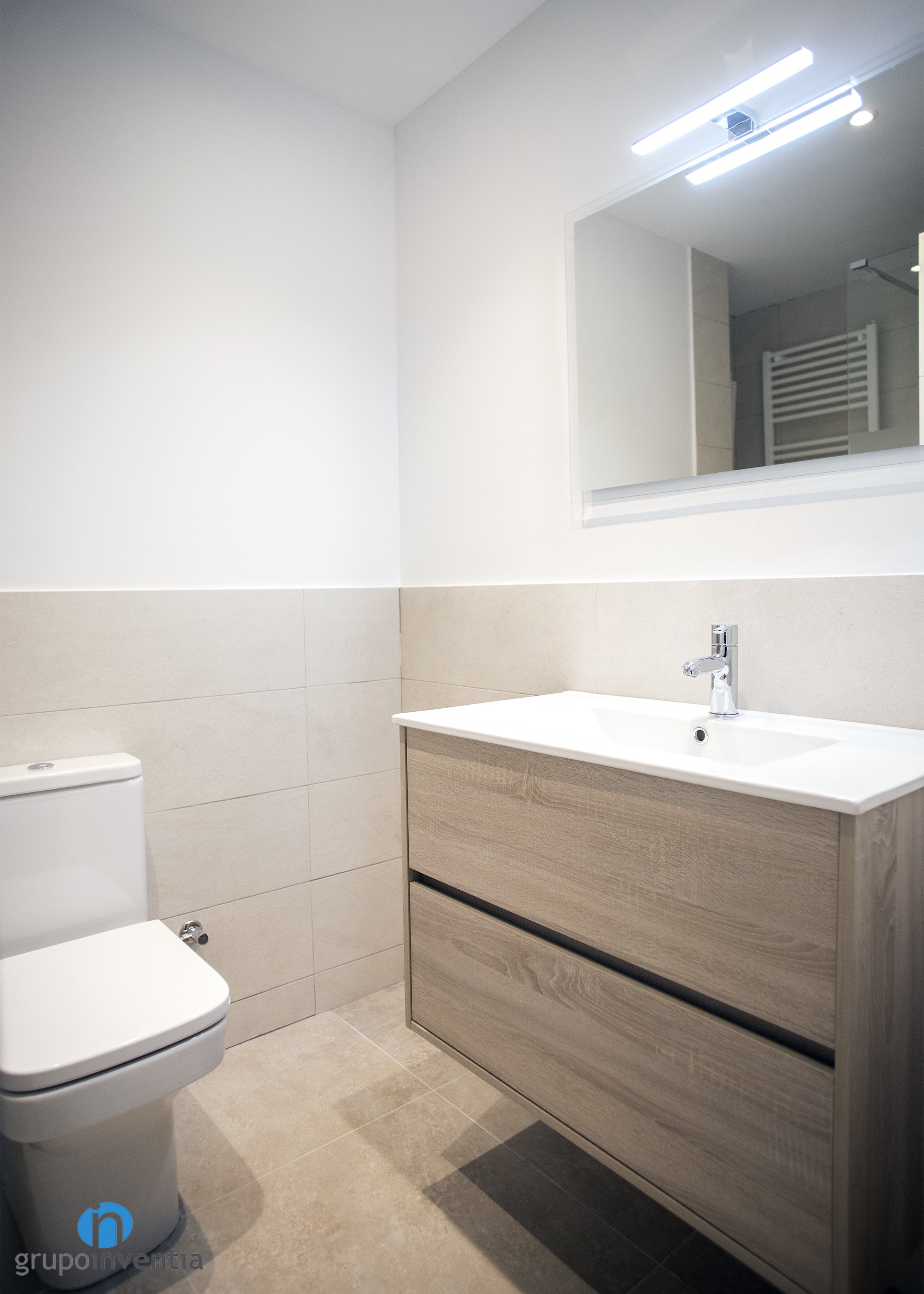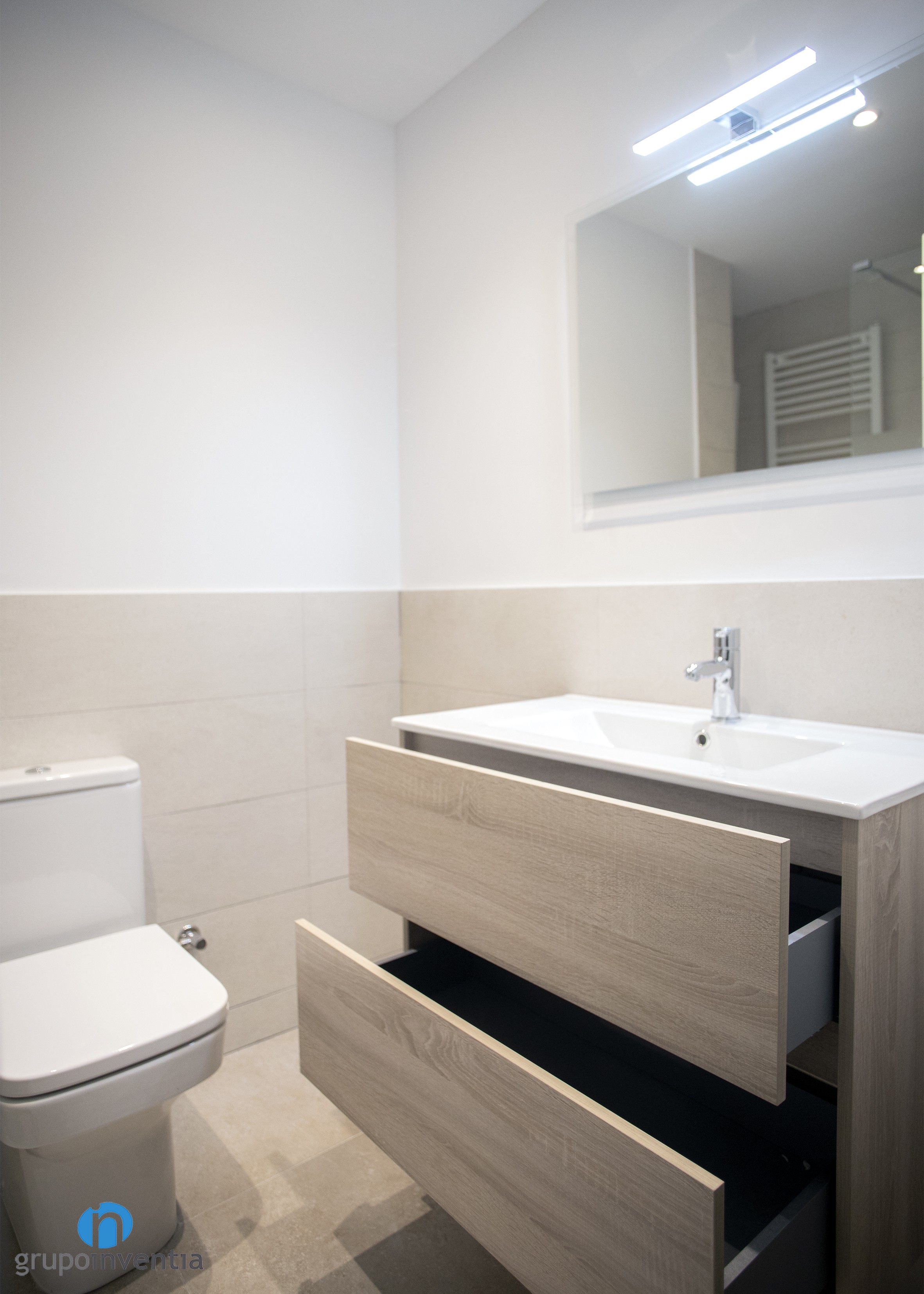 L’habitatge comptava amb dues cambres de bany en què es va utilitzar un disseny interior que aporta sensació d’amplitud i lluminositat, alhora que crea un ambient acollidor. Per l’enrajolat de les parets es van utilitzar rajoles beige, un to molt semblant al del paviment col·locat i en el qual s’introdueixen acabats en fusta com els que trobem en el moble de bany.