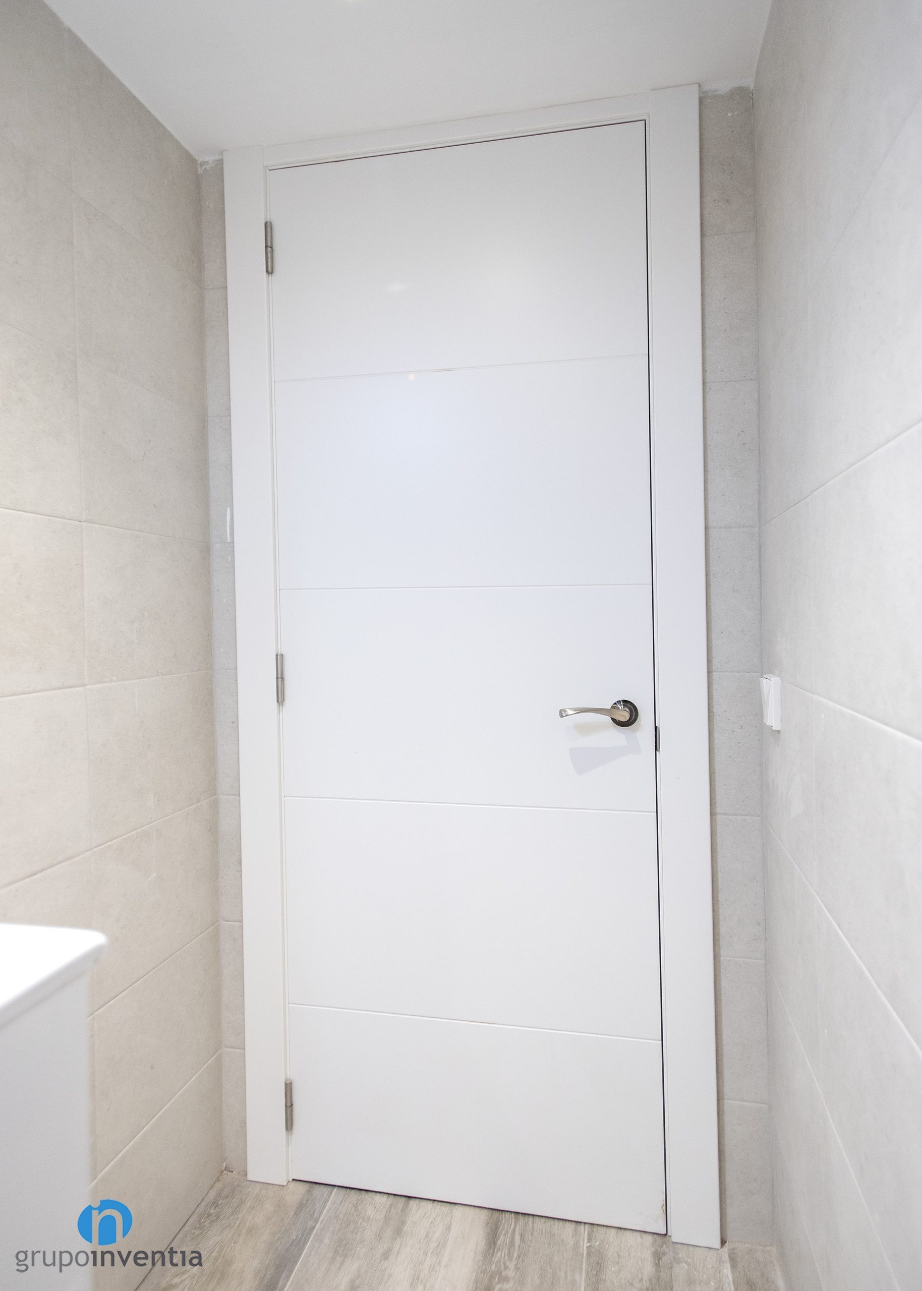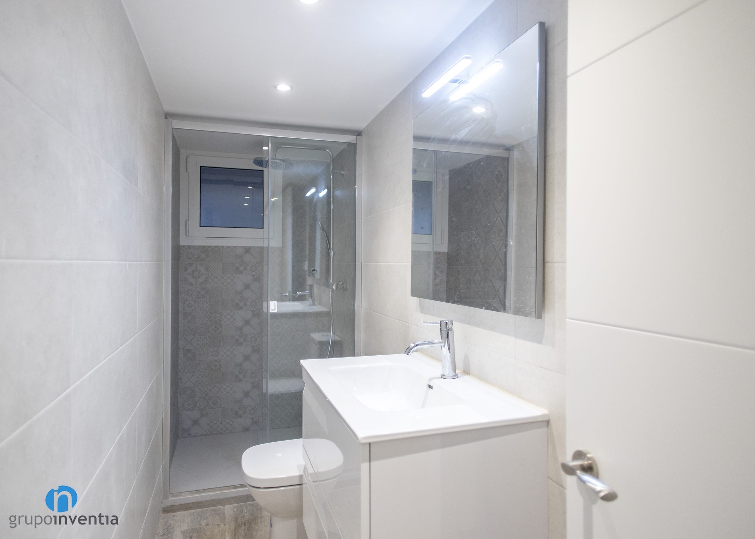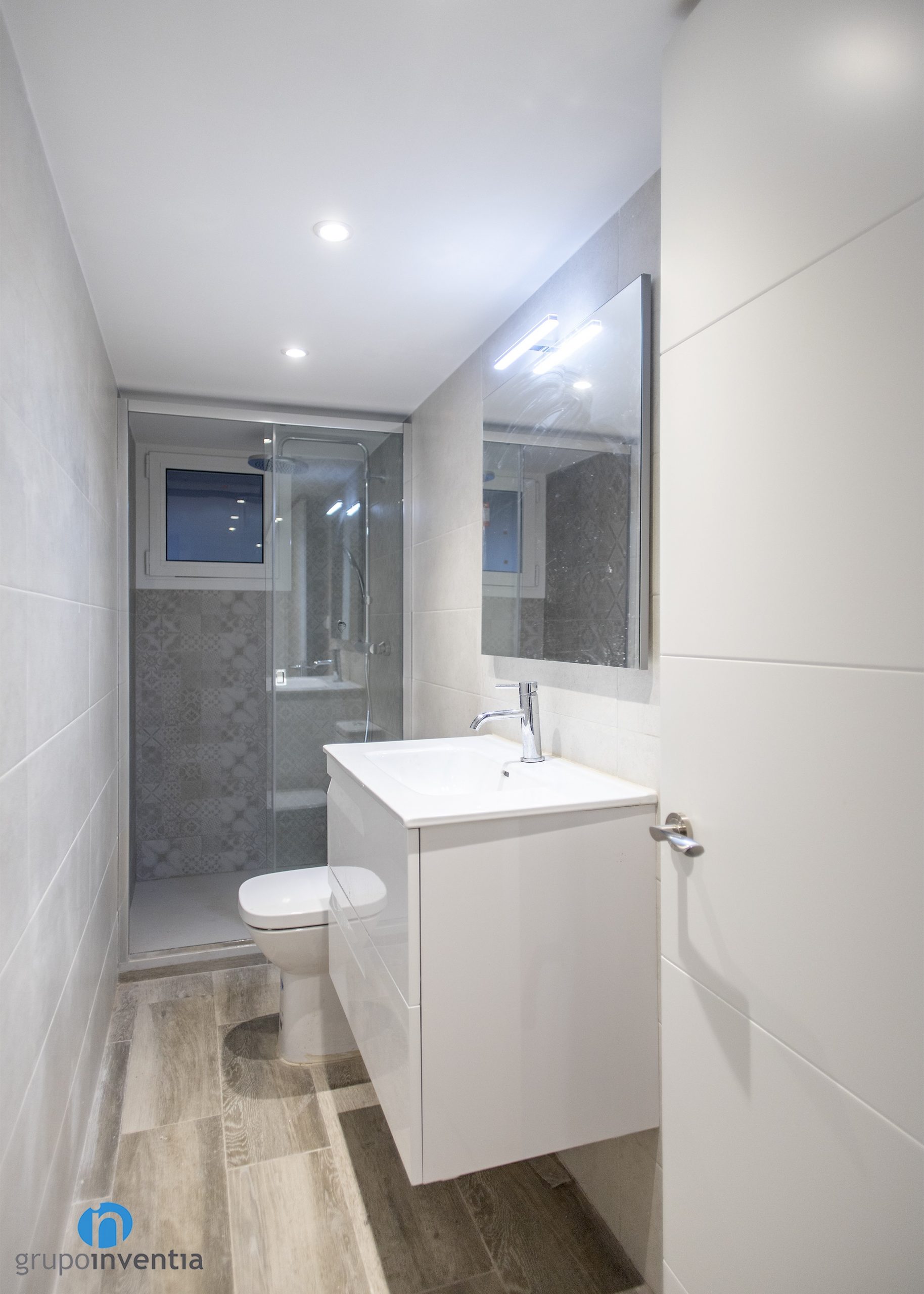L’habitatge reformat compta amb una cambra de bany a la qual s’accedeix a través d’una porta de fusta blanca. A l’interior, les parets s’han enrajolat amb rajoles blanques i s’ha col·locat un terra de gres que imita un acabat en fusta. En en enrajolat de la paret de la dutxa s’han utilitzat rajoles tipus mosaic.