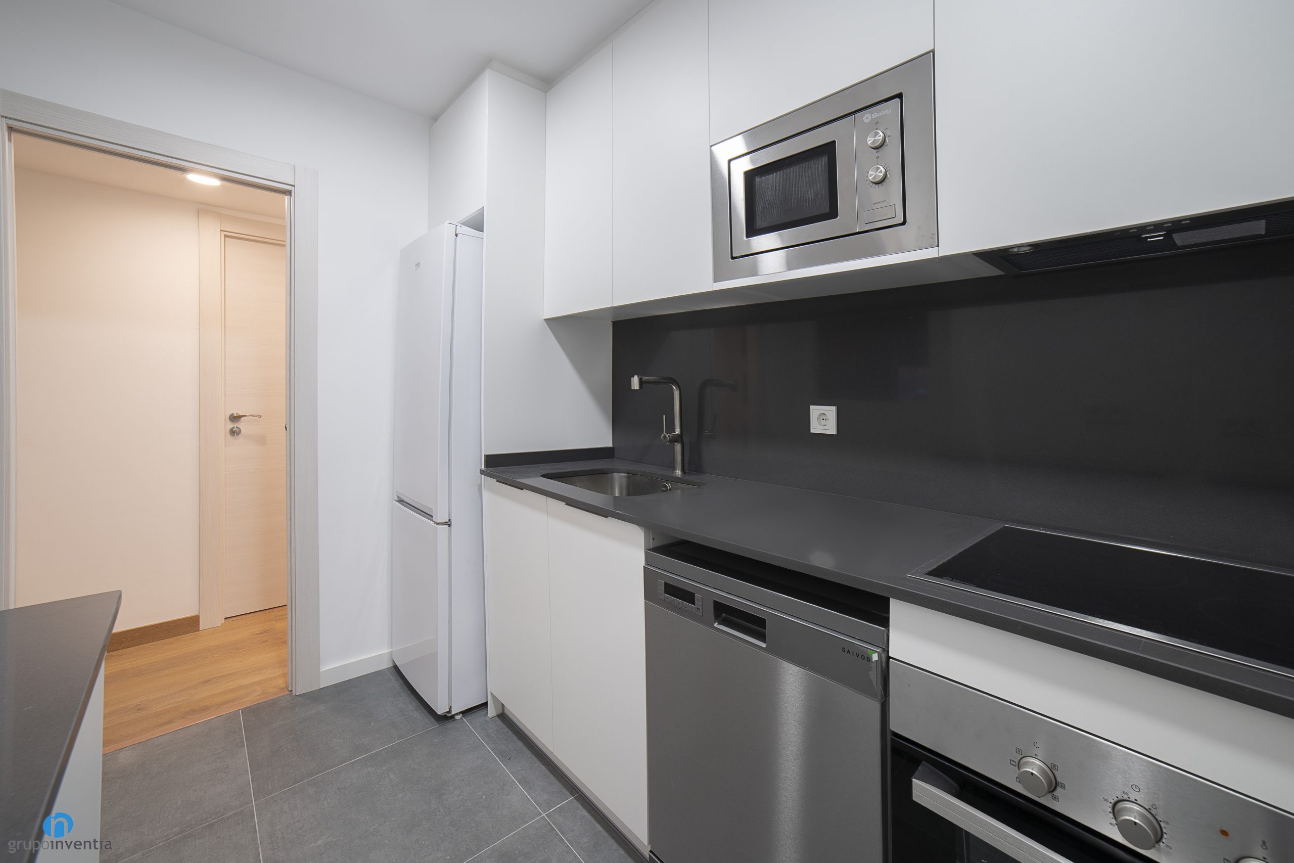 A la banda esquerra s’ha col·locat el moble principal de cuina. Té un taulell allargat on s’ha instal·lat una pica i una placa vitroceràmica. Als armaris superiors s’ha integrat el microones, mentre que a la zona inferior d’emmagatzematge s’han integrat el forn i el rentaplats. Per la seva banda, a l’extrem esquerre s’ha disposat un forat a mida per integrar la nevera.