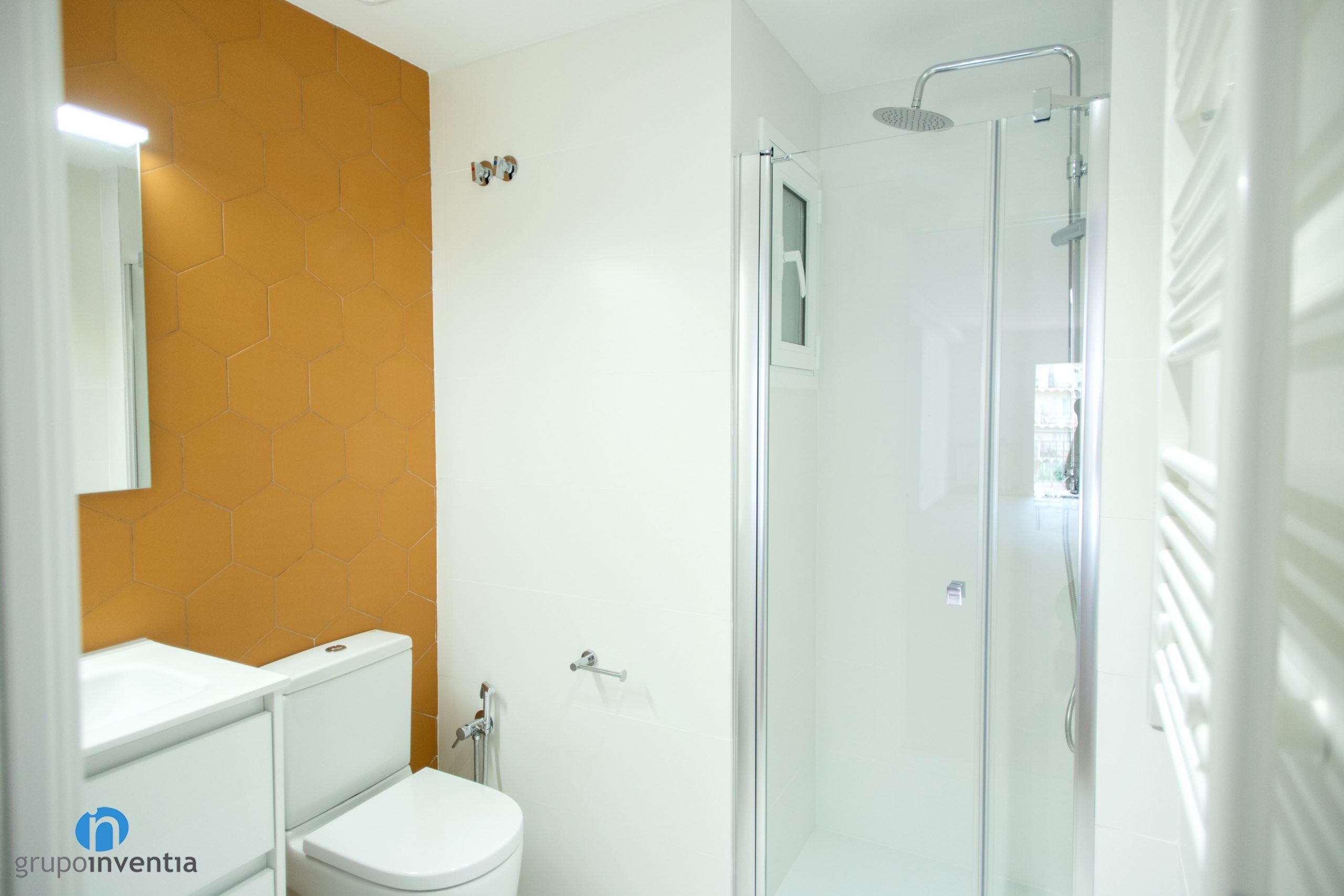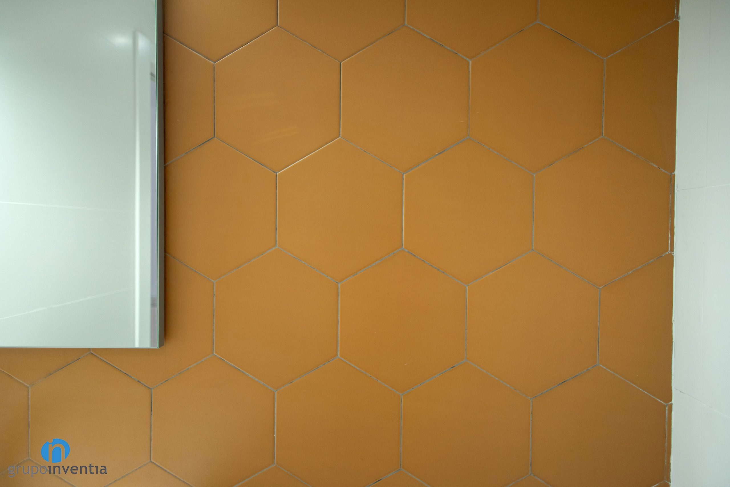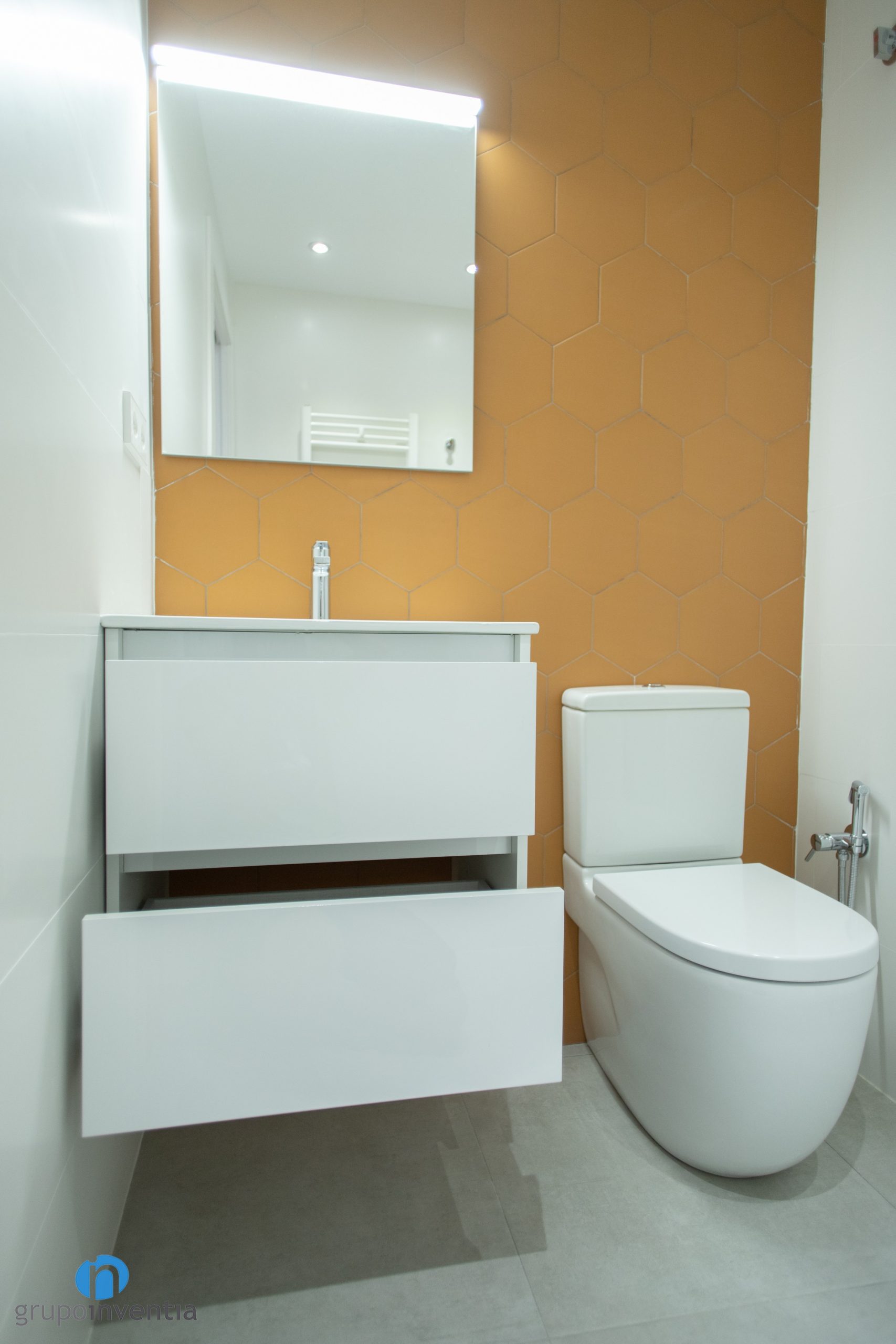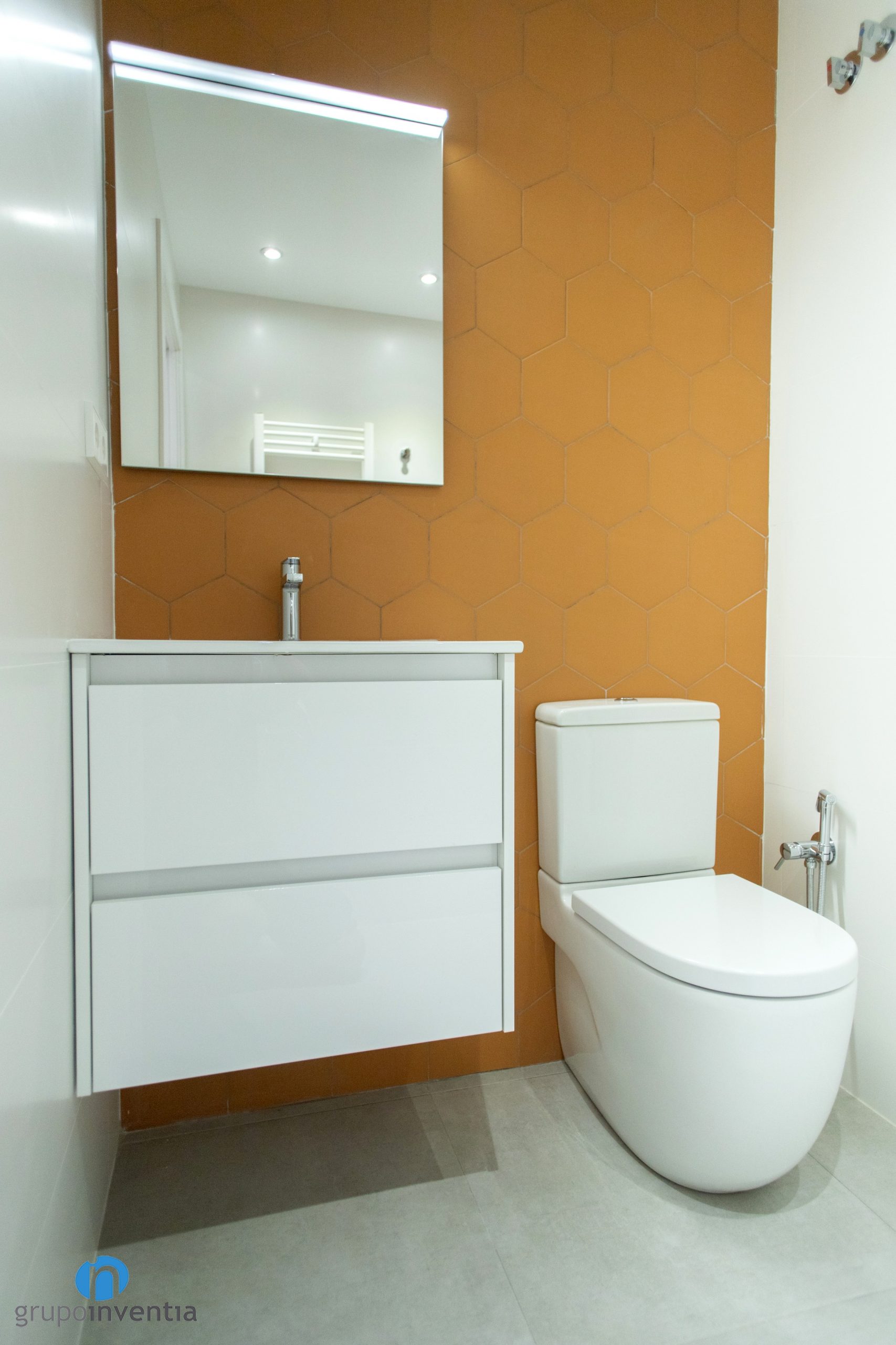 Les parets s’han enrajolat completament. Una diferència entre tots dos és que s’ha utilitzat un color diferent per enrajolar la paret del lavabo. Al bany principal s’ha apostat per rajoles hexagonals de color blau. Al bany de cortesia són de la mateixa manera, encara que de color taronja. Per al nou paviment s’ha escollit un terra de gres gris. Una combinació perfecta entre imatge i funcionalitat.