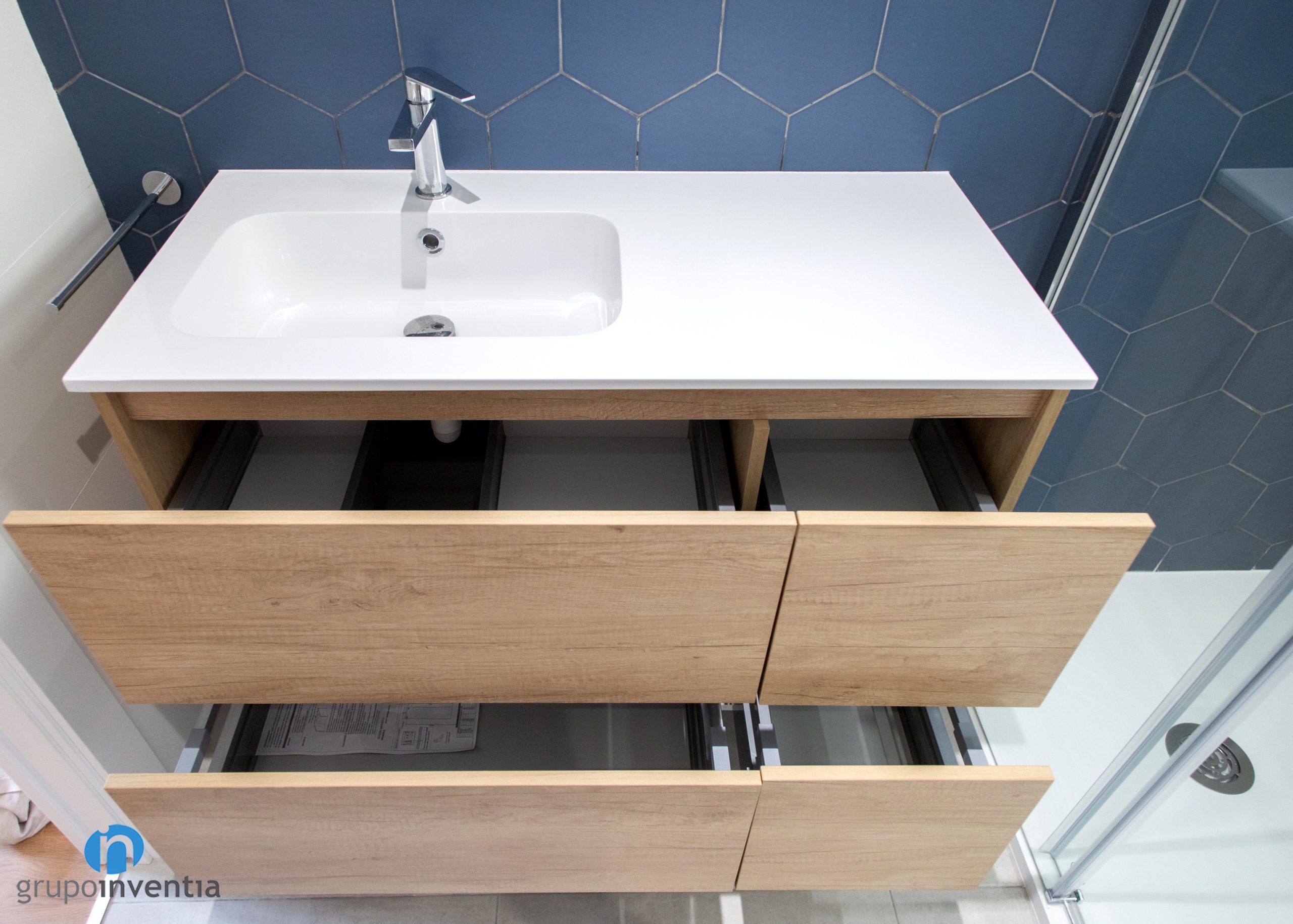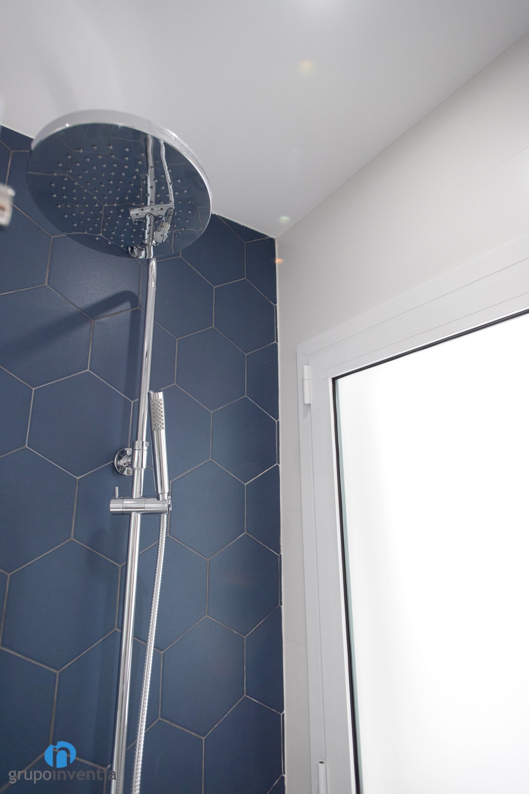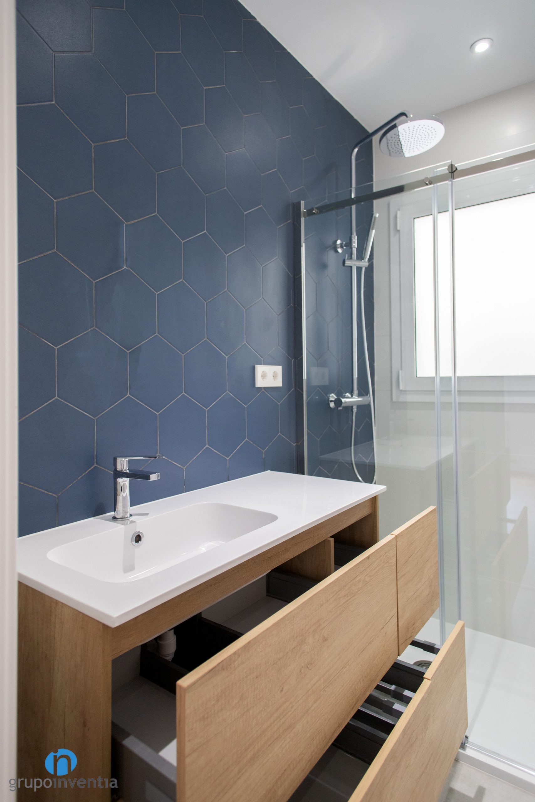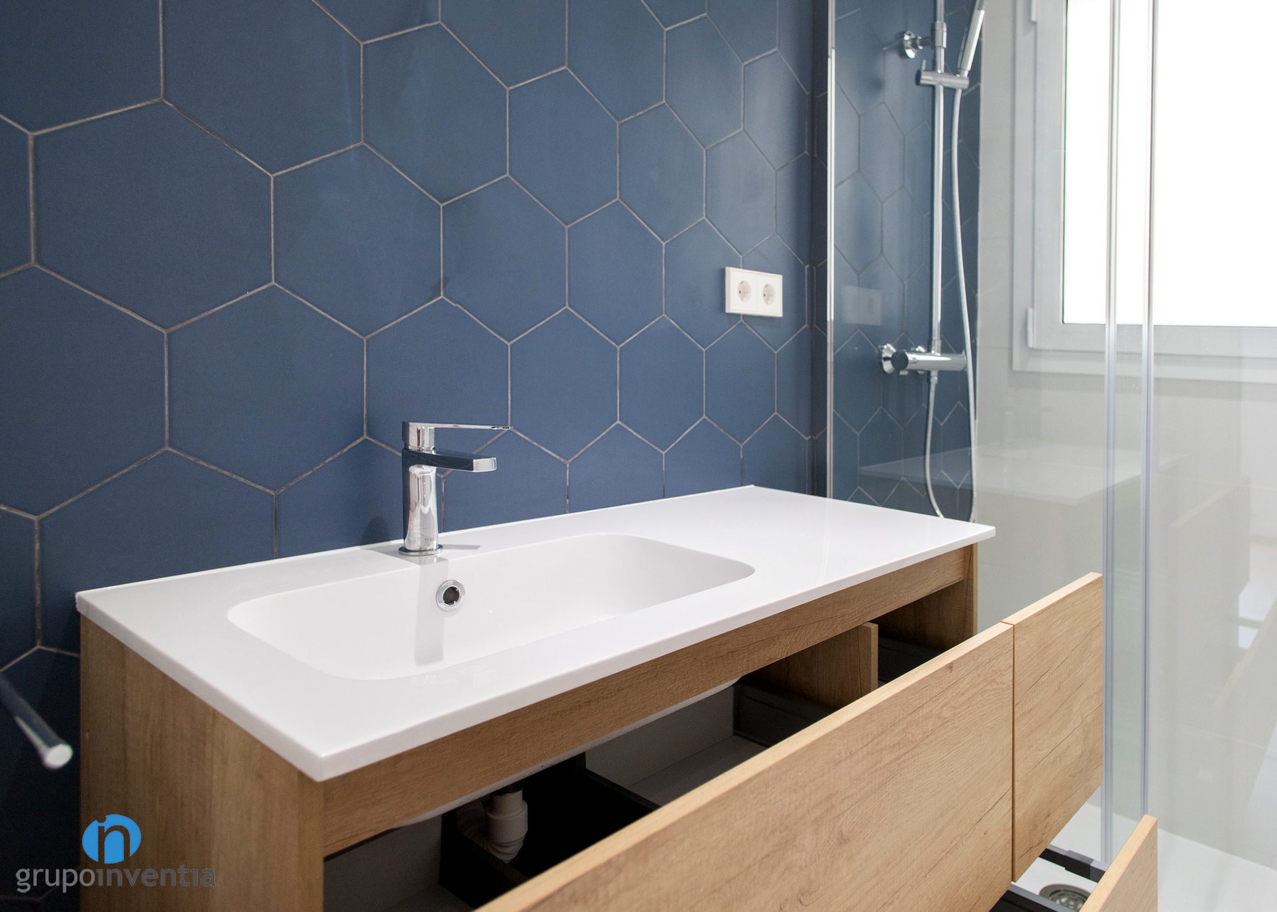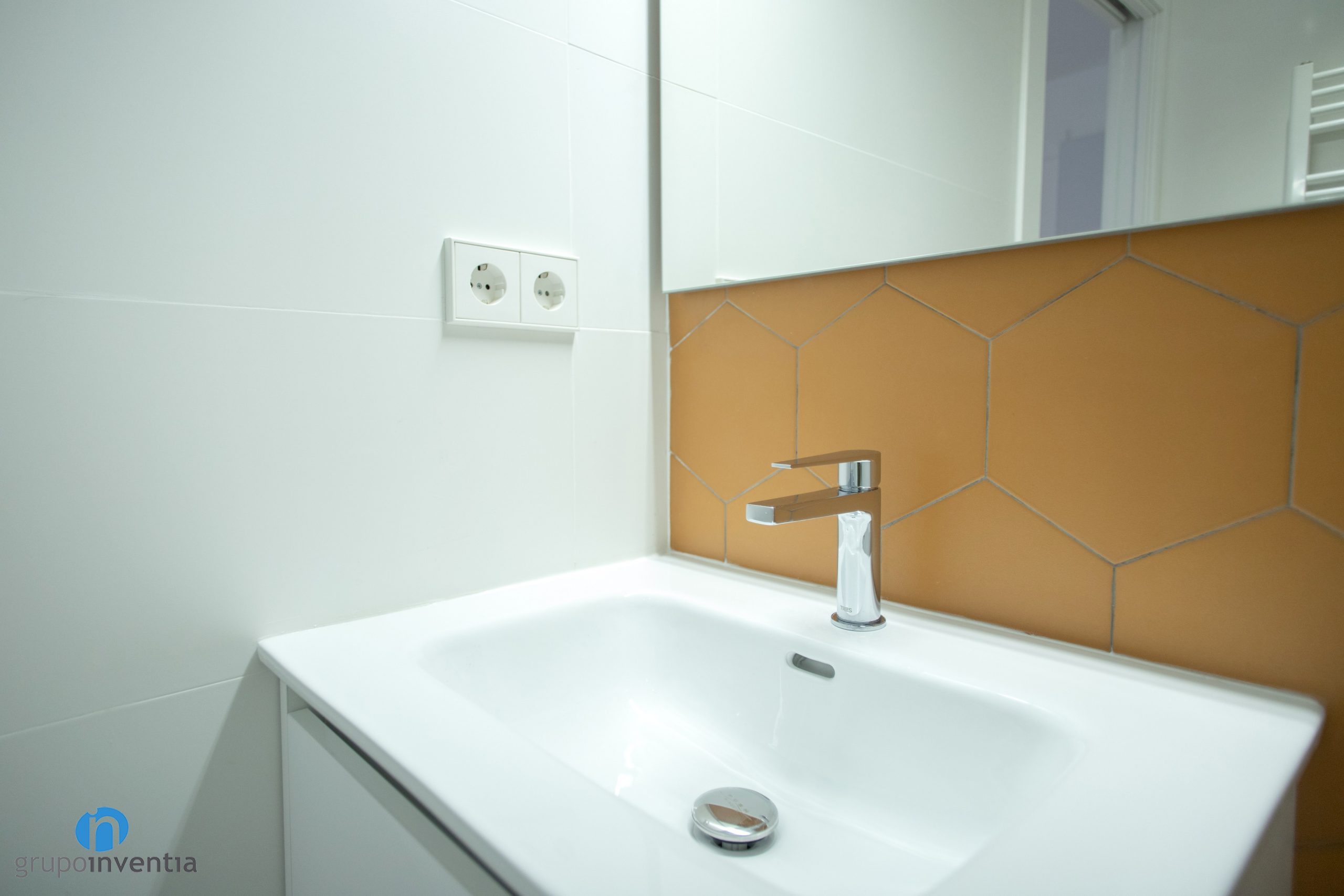 Les parets s’han enrajolat completament. Una diferència entre tots dos és que s’ha utilitzat un color diferent per enrajolar la paret del lavabo. Al bany principal s’ha apostat per rajoles hexagonals de color blau. Al bany de cortesia són de la mateixa manera, encara que de color taronja. Per al nou paviment s’ha escollit un terra de gres gris. Una combinació perfecta entre imatge i funcionalitat.