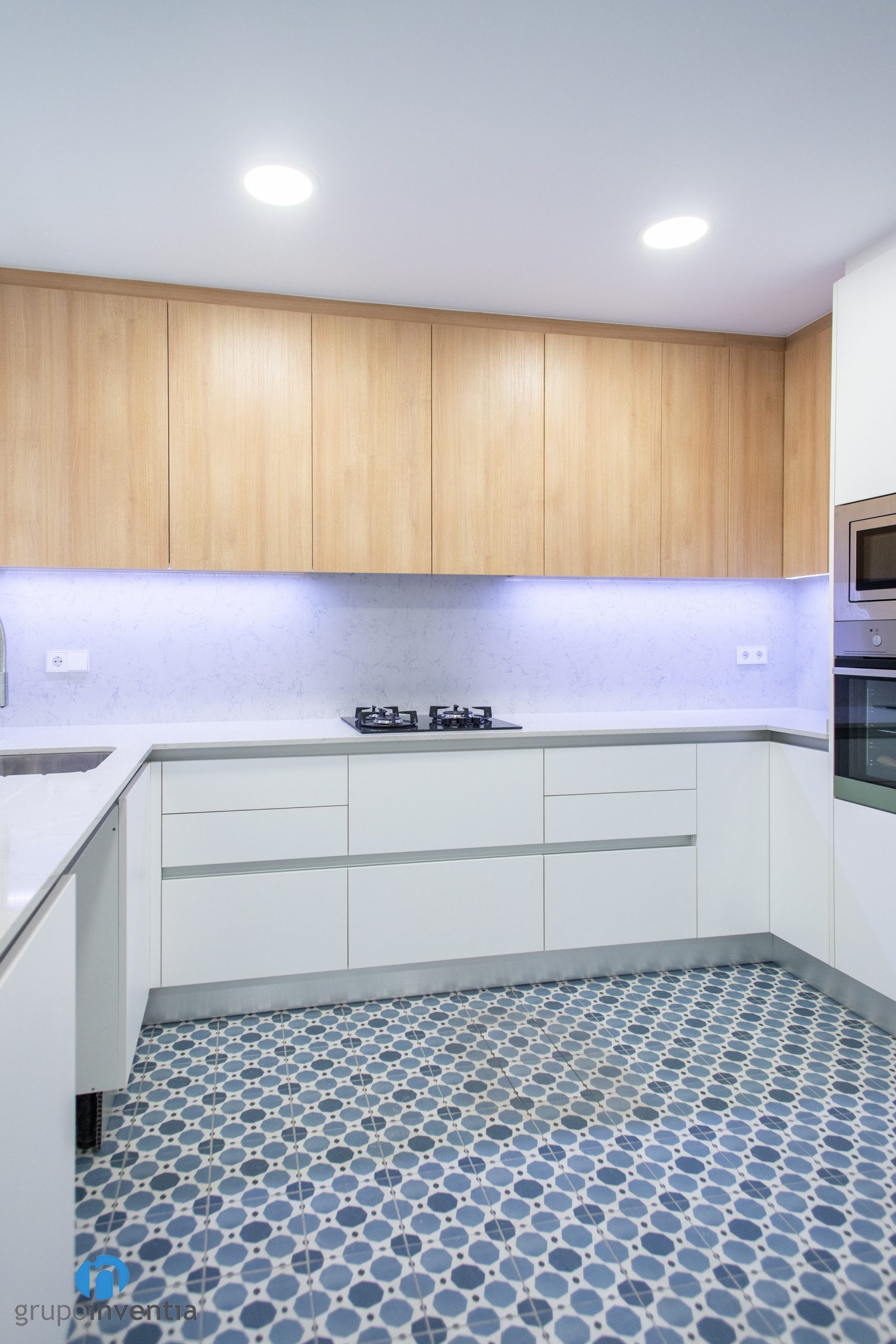 La cuina s’ubica en una estança pròpia i aquesta distribuïda en forma d’U a l’igual que la resta d’estances d’aquesta reforma integral, la cuina és àmplia i amb la nova disposició s’han aconseguit una funcionalitat i mobilitat perfectes. Al seu torn compta amb molta capacitat d’emmagatzematge. El aporta un moble de cuina de color blanc a la part inferior i d’acabats en fusta en la seva zona superior.