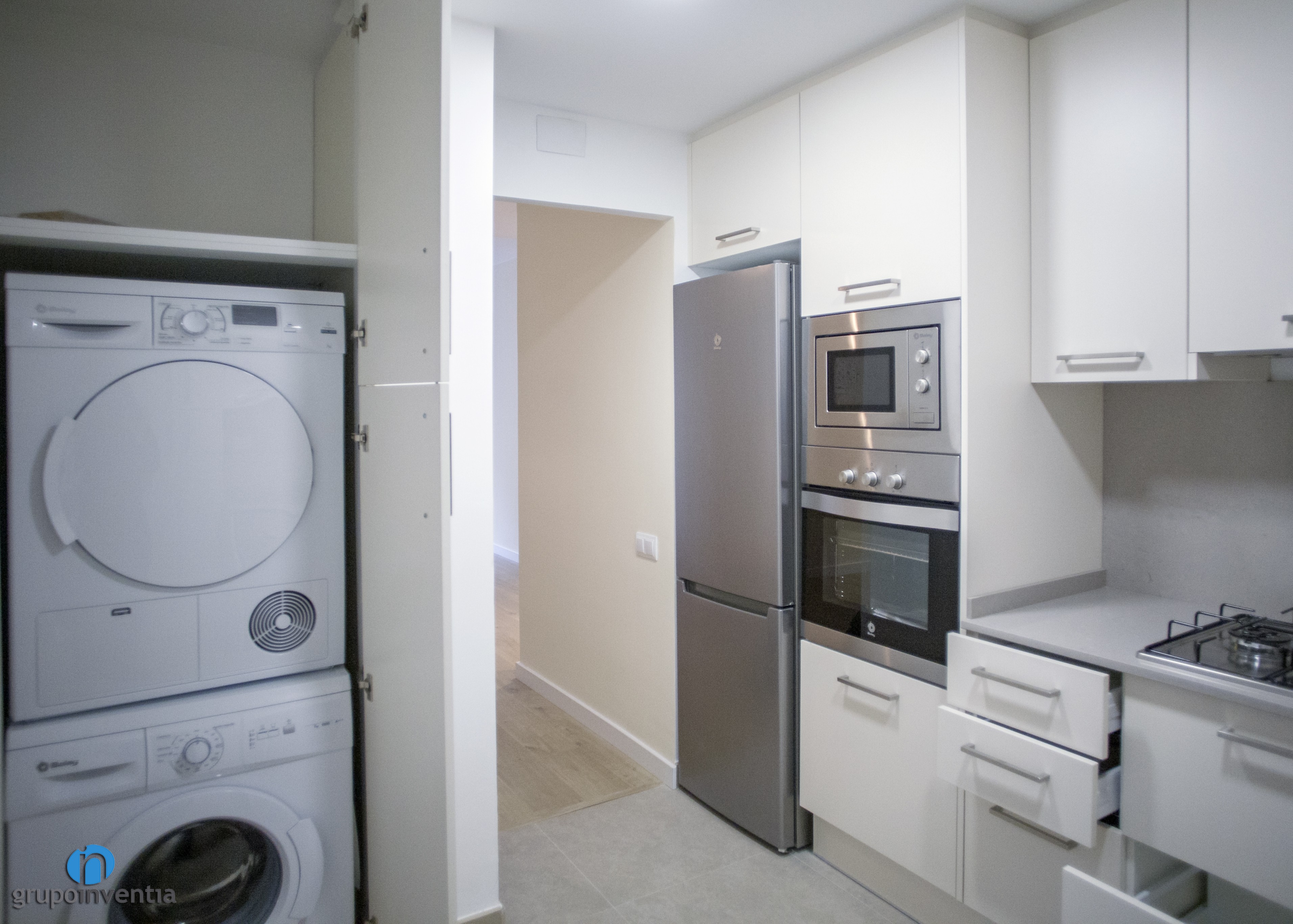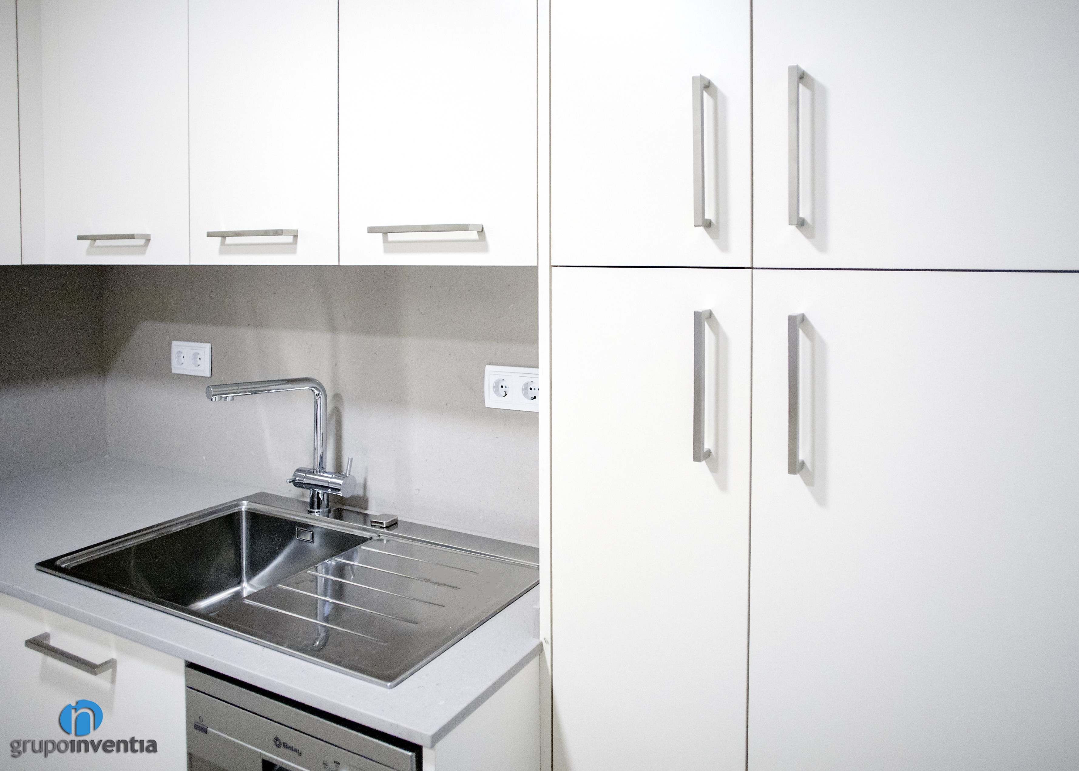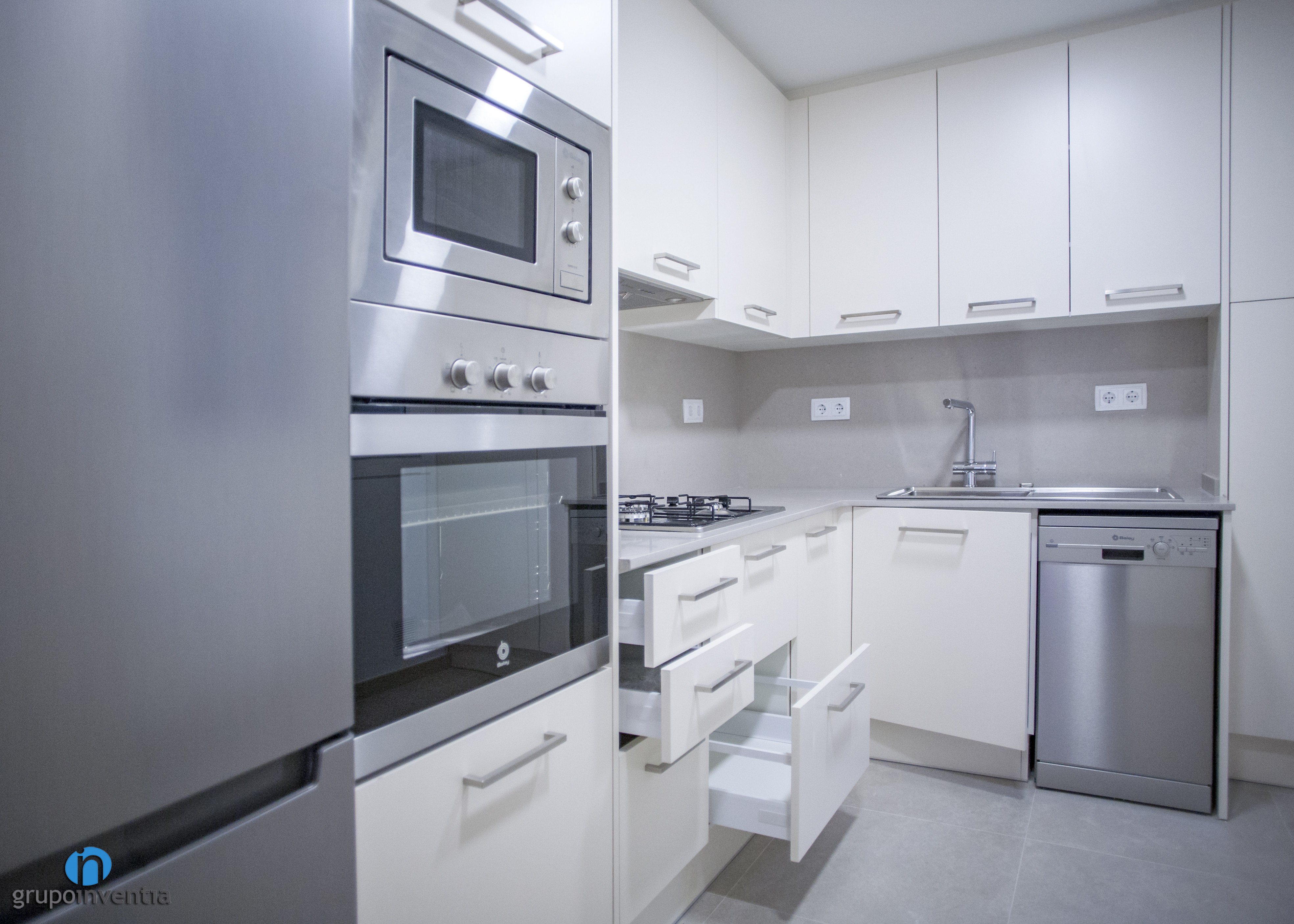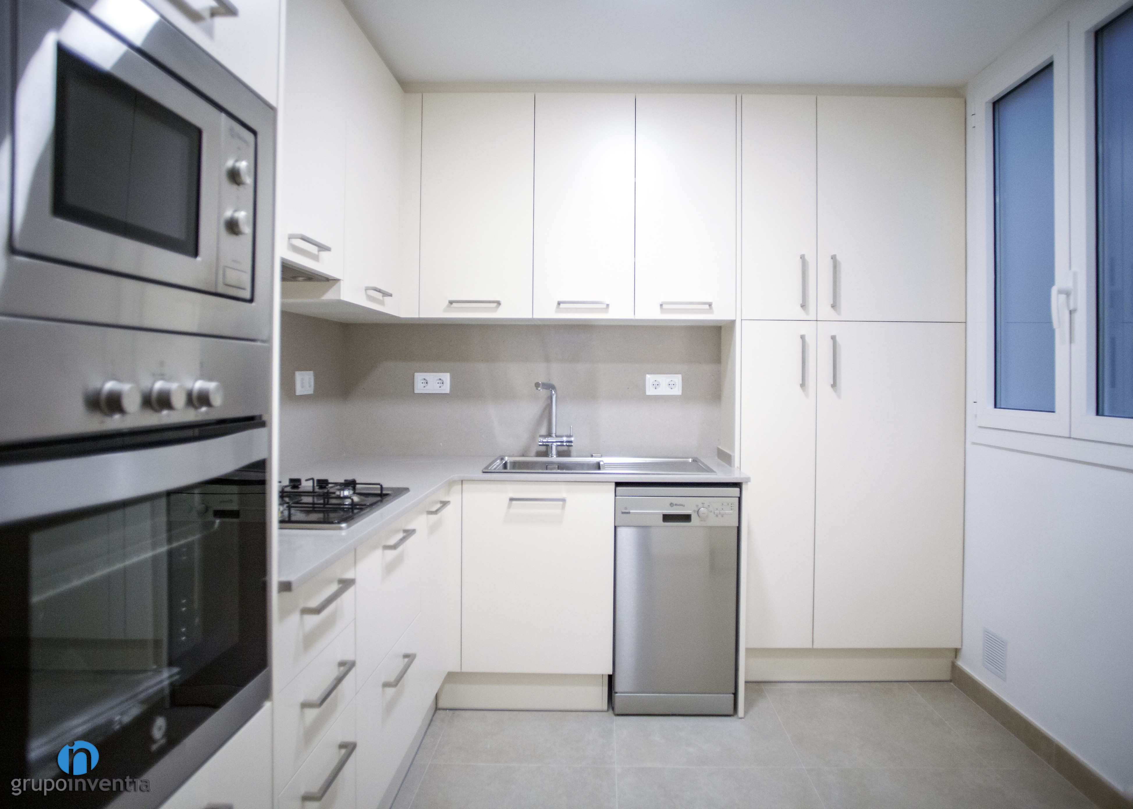 La cuina ocupa la seva pròpia estança i està distribuïda en forma de L, aconseguint una ubicació perfecta i funcional per a cada element. A l’extrem de la part esquerra es van col·locar els electrodomèstics, compostos per una nevera, un forn i un microones. Seguidament neix un allargat tram de taulell que, a més d’oferir una àmplia superfície de suport, està equipat amb una cuina de quatre fogons. El taulell torça a la dreta per donar pas a un segon tram. Aquest és una mica més reduït, però perfecte per col·locar l’aigüera. A més, es va encastar el rentaplats a la part inferior.