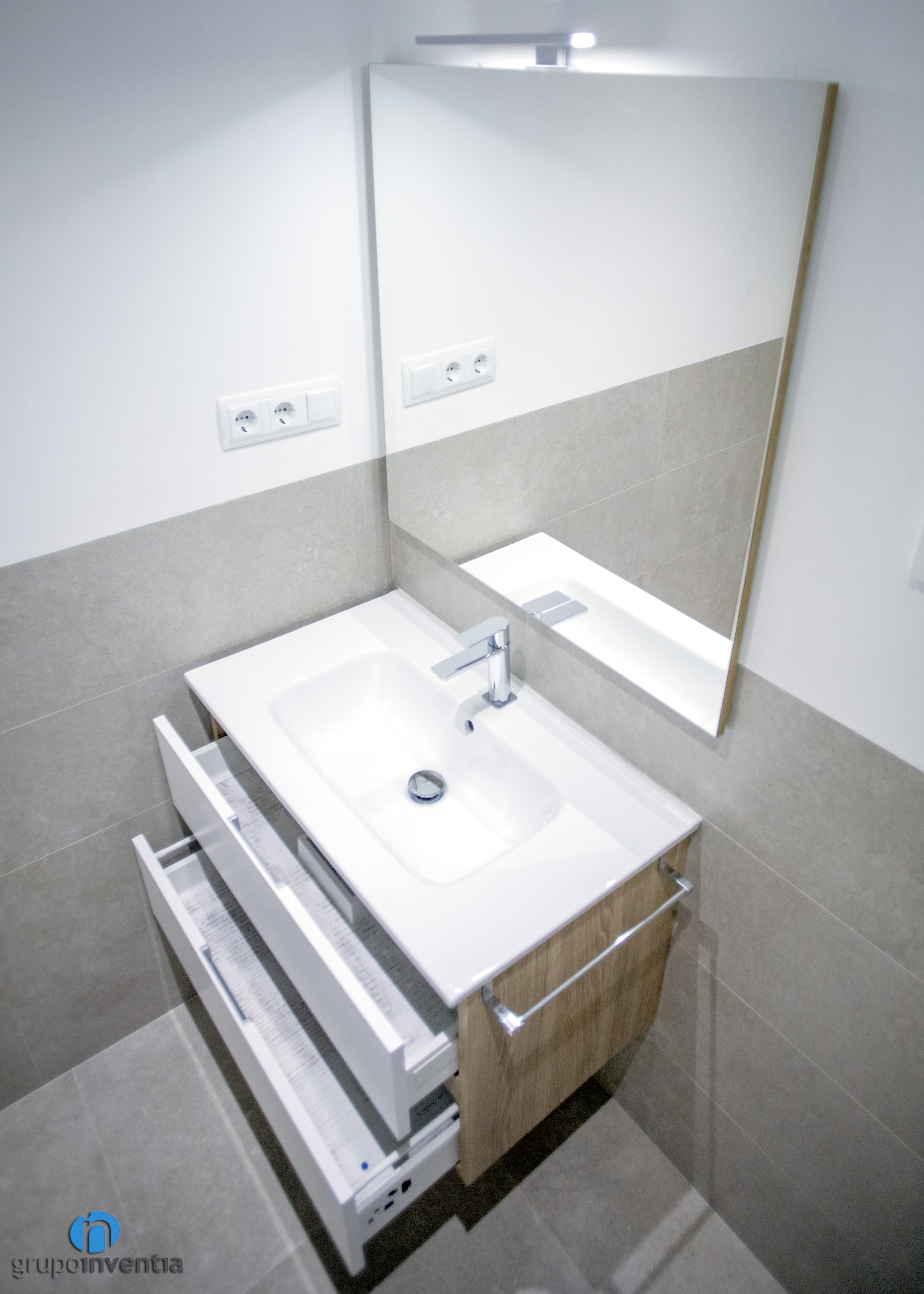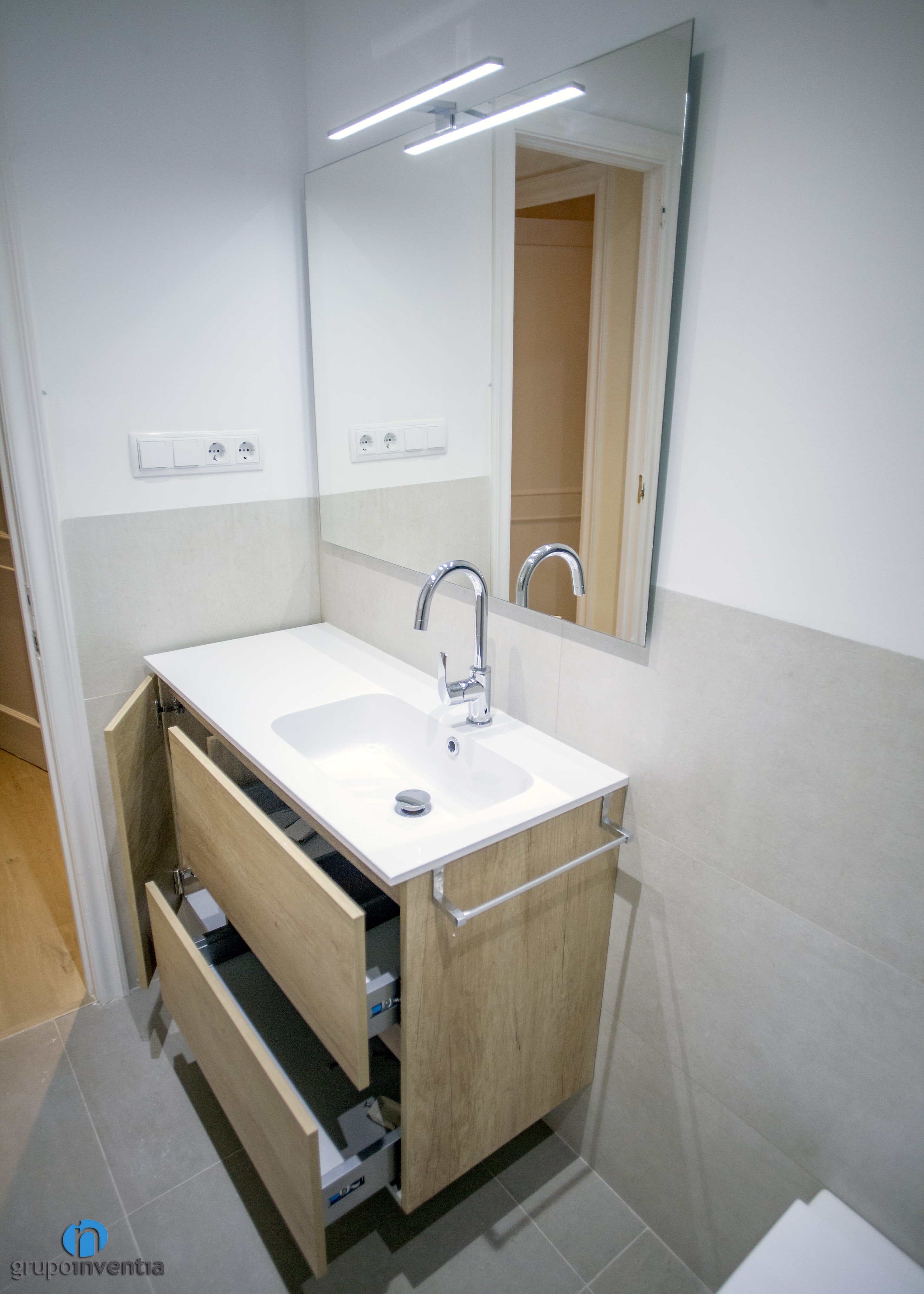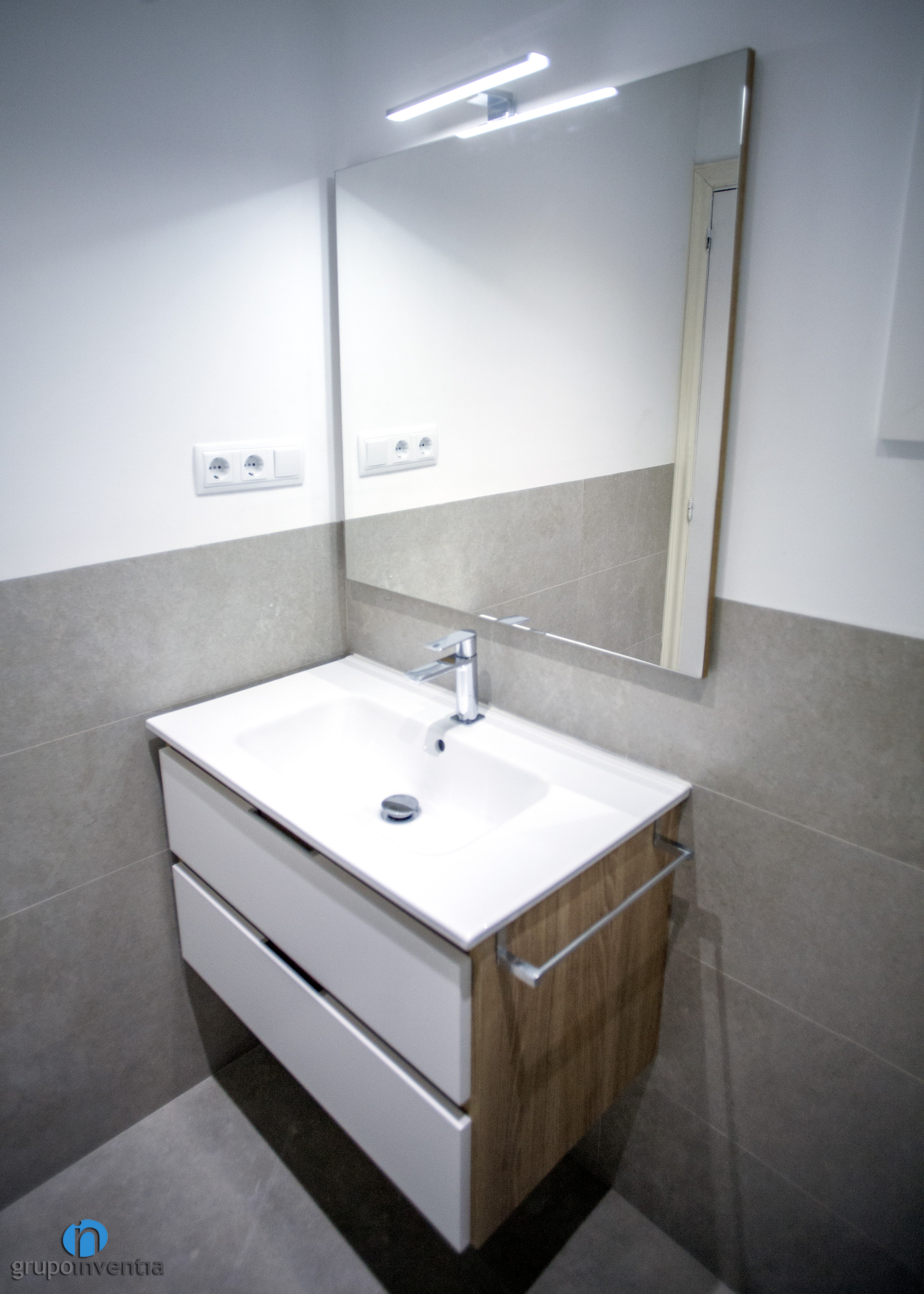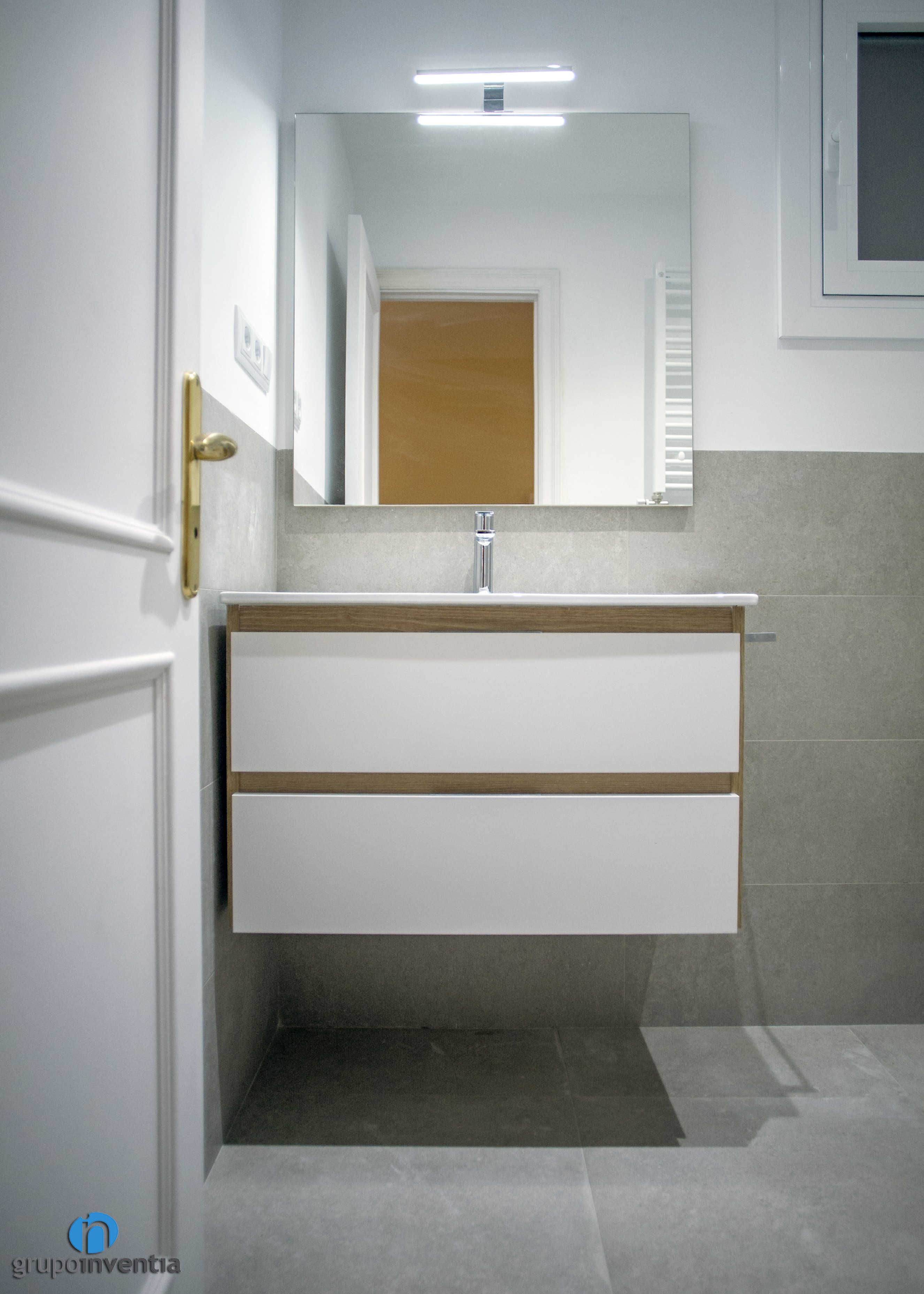 L’habitatge compta amb una cambra de bany principal i un lavabo. En tots dos casos es va apostar per enrajolar les parets a mitja altura amb rajoles grises i pintar la resta de blanc. Així es va generar un ambient fresc i molt ampli visualment. A això se li afegeixen toc en fusta que encaixen molt bé en el conjunt.
