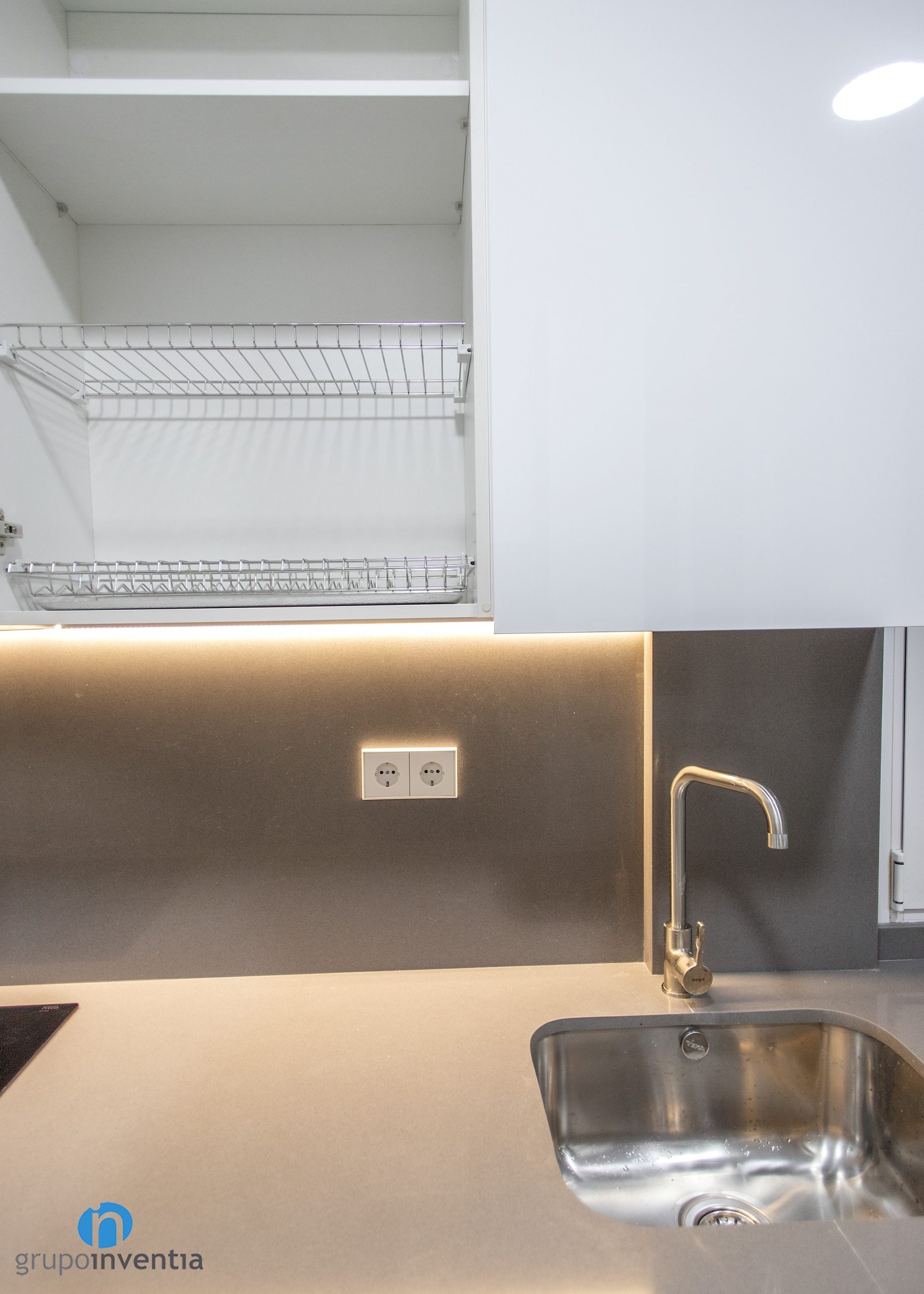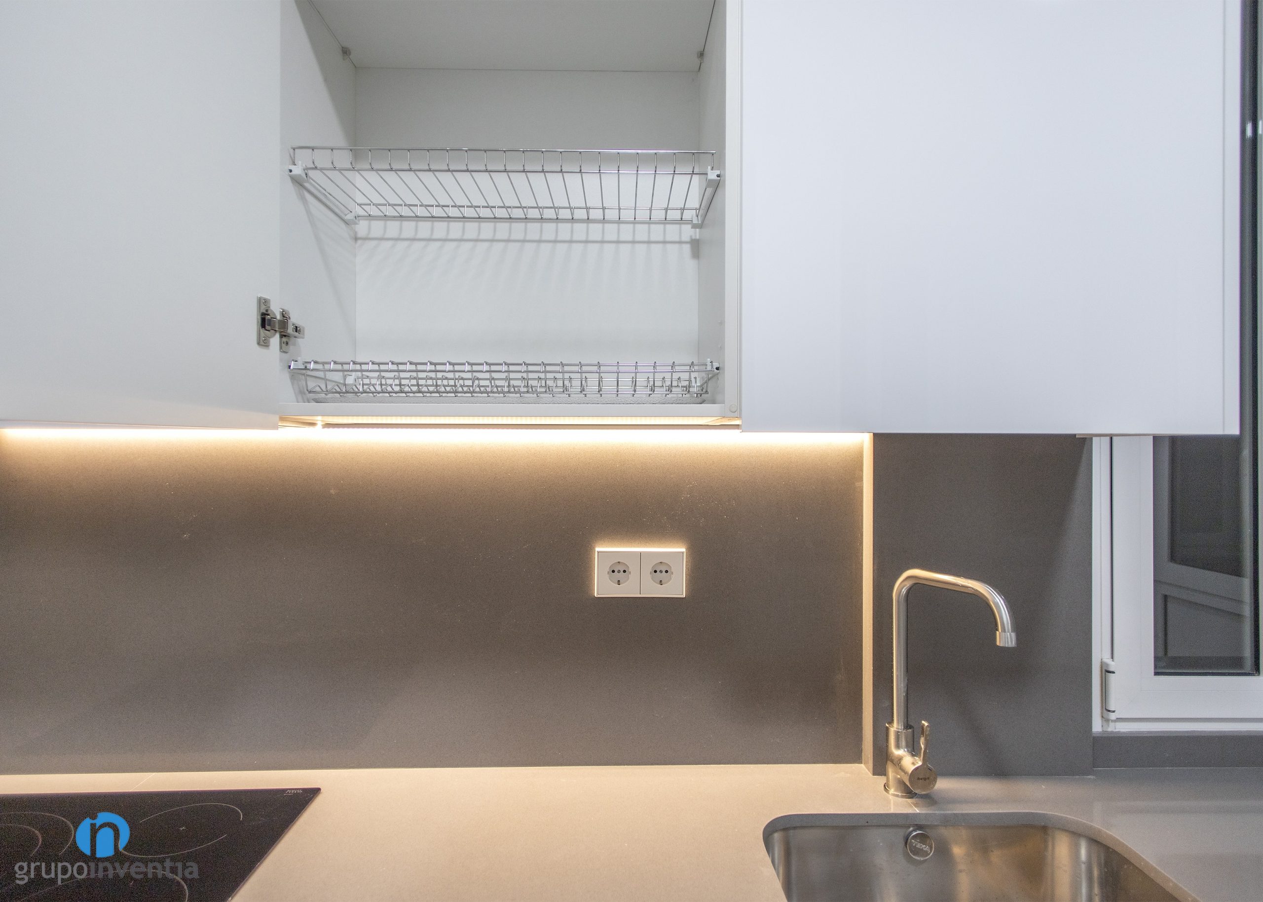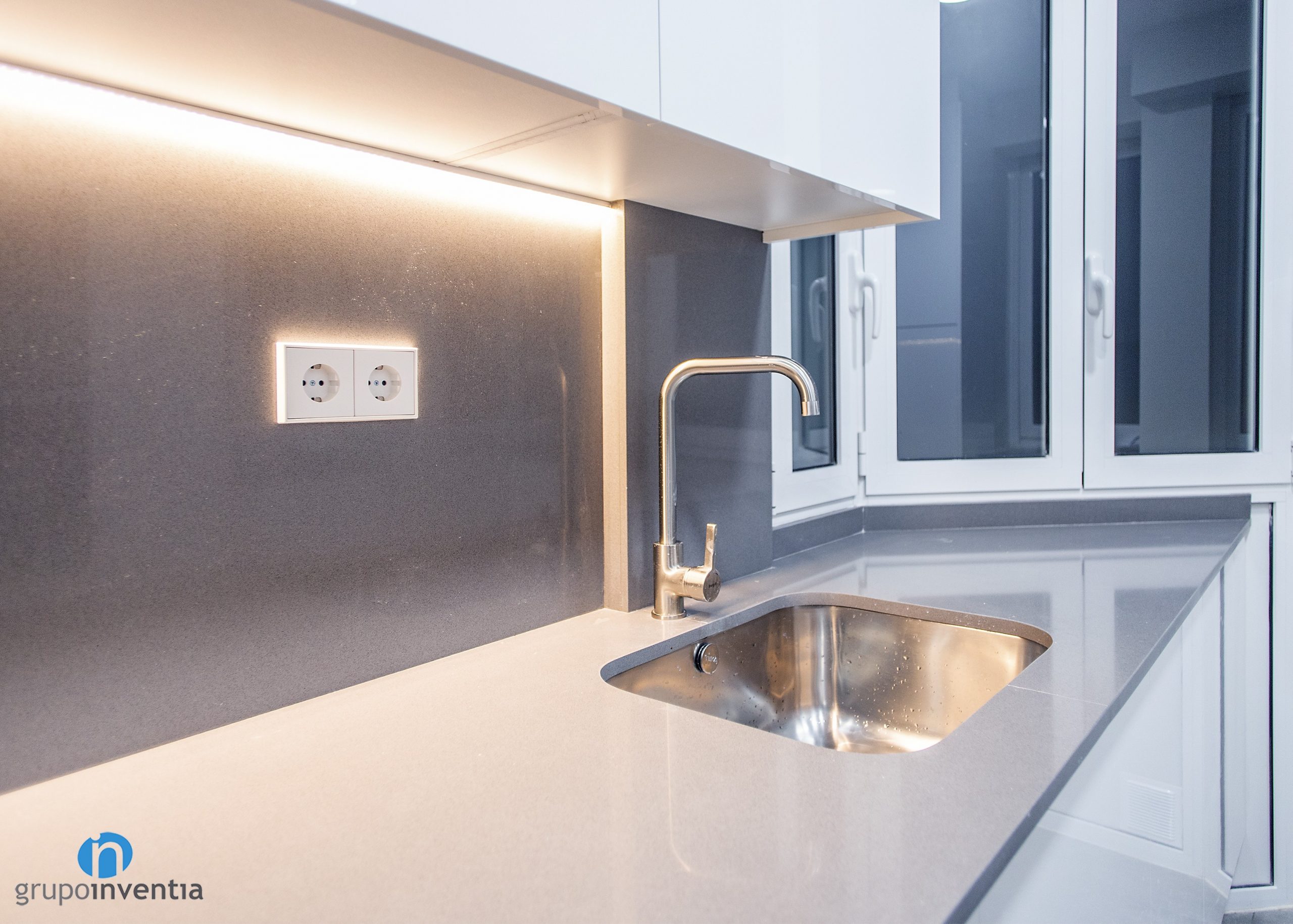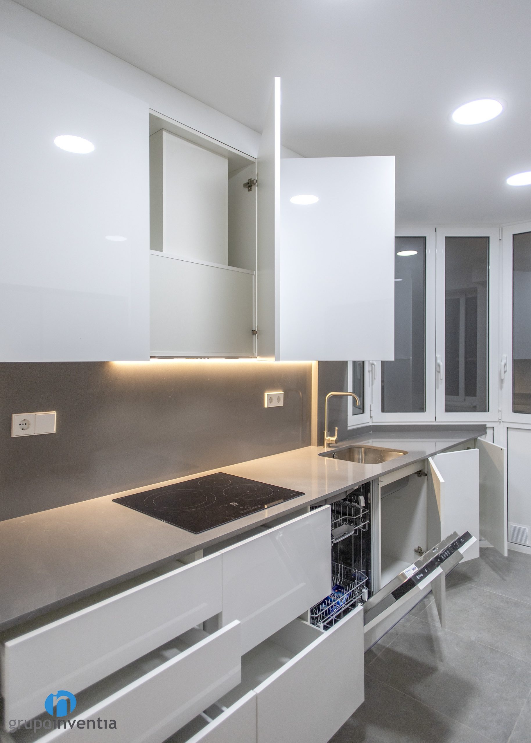 El costat esquerre l’ocupa una allargat taulell que ofereix una àmplia superfície de suport i de treball. En ella també s’han instal·lat una placa vitroceràmica i una pica. A més, aquesta reforma de cuina compta amb una àmplia capacitat d’emmagatzematge. Tant en la part inferior com superior del taulell de cuina hi ha armaris i calaixos.