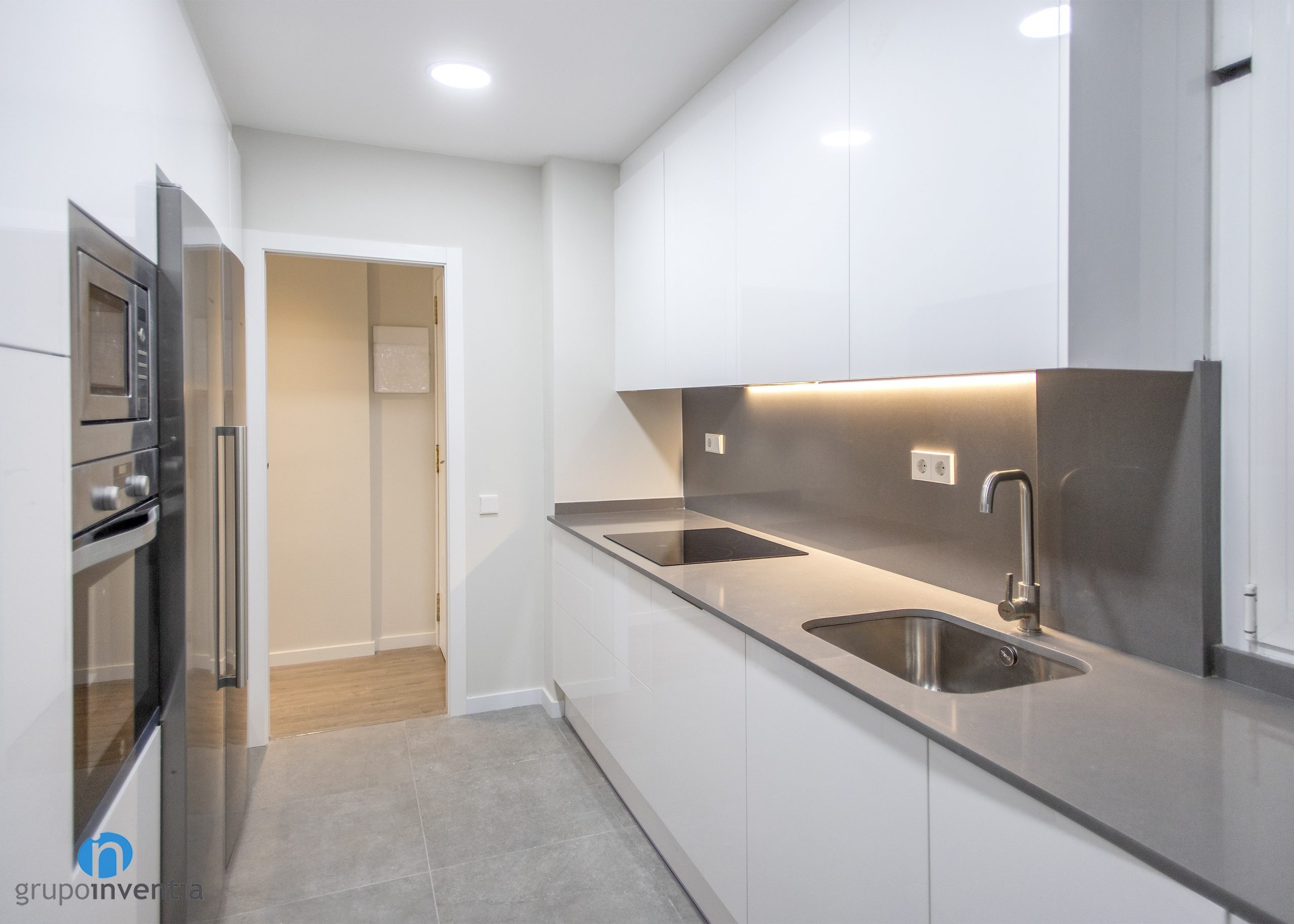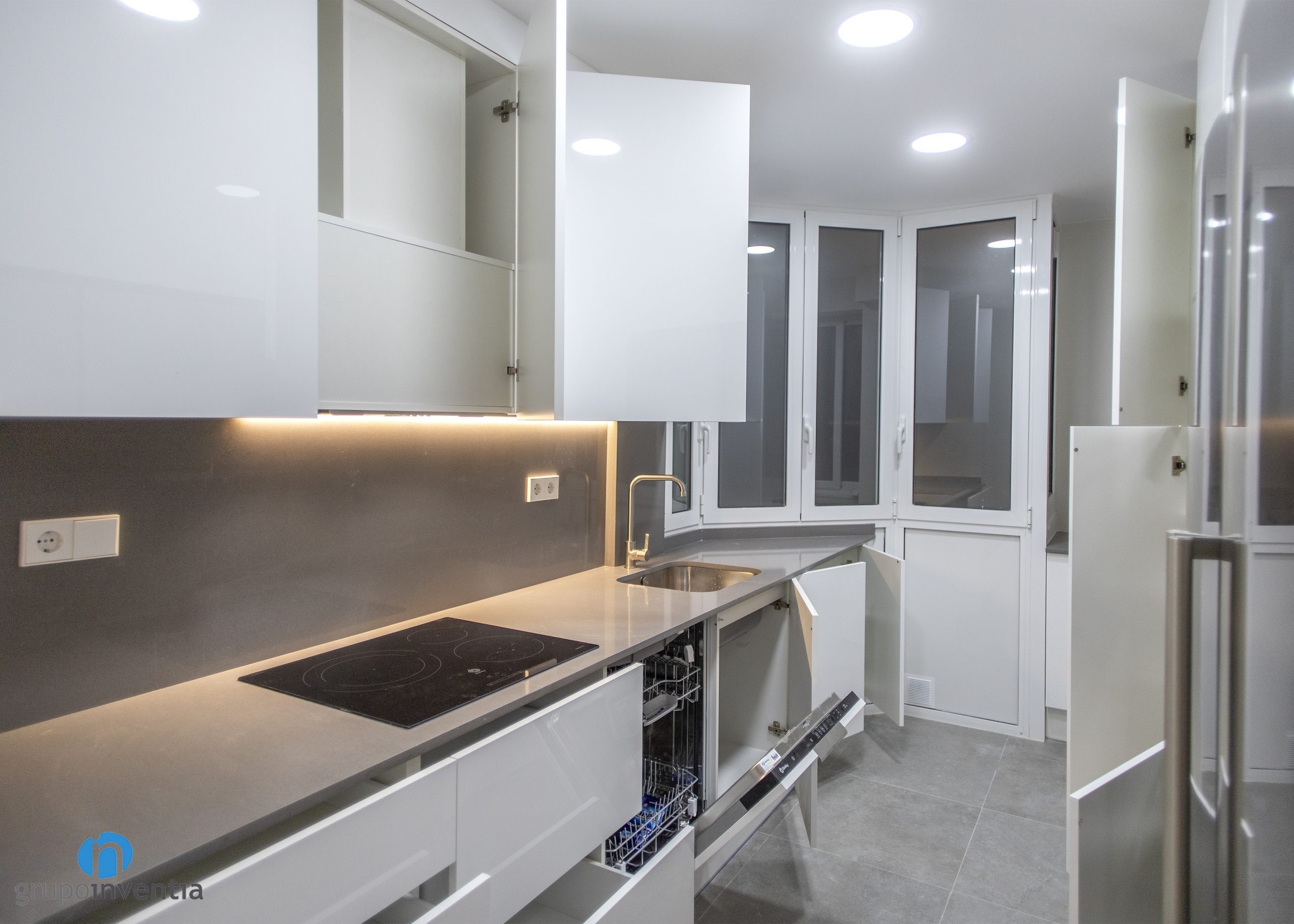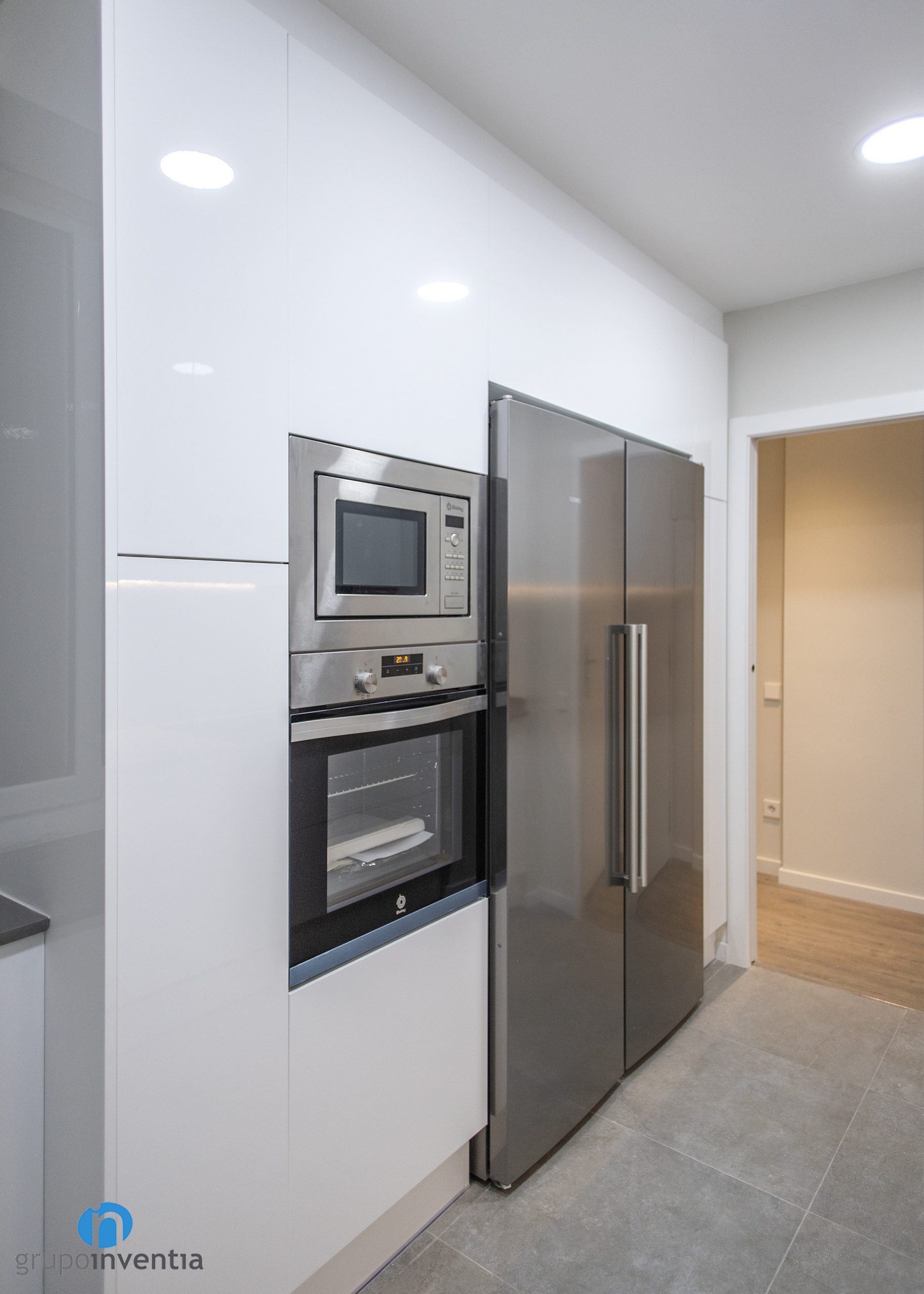 La cuina s’ubica en una estança independent i de superfície àmplia. Donades les seves característiques s’ha optat per una distribució de cuina a dos fronts, la millor disposició per aconseguir una àmplia mobilitat a l’hora de fer ús de el nou equipament. A la dreta de l’entrada es vsn encastar els electrodomèstics, compostos per nevera de doble porta, forn i microones.