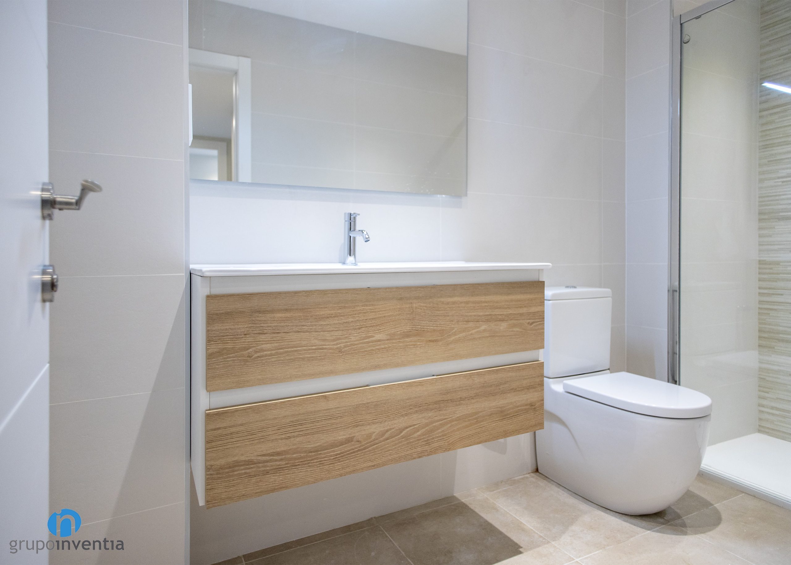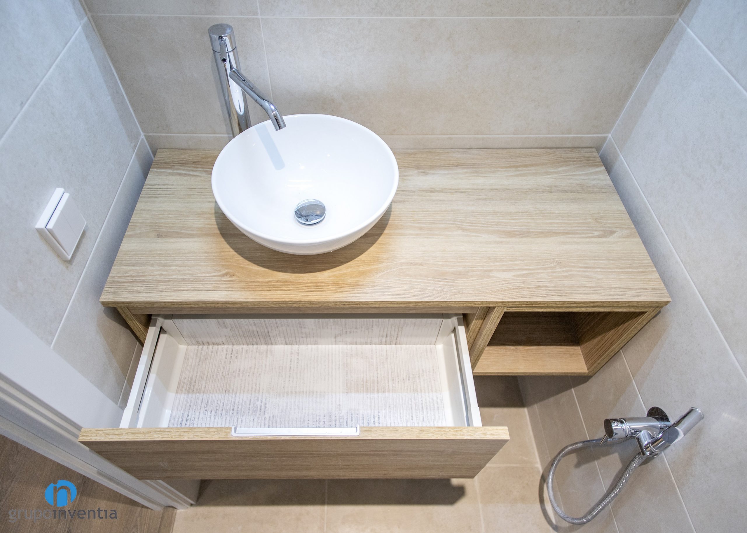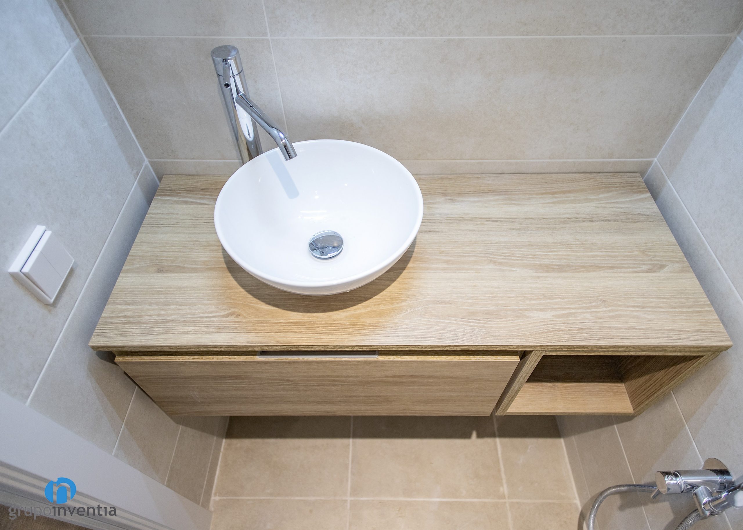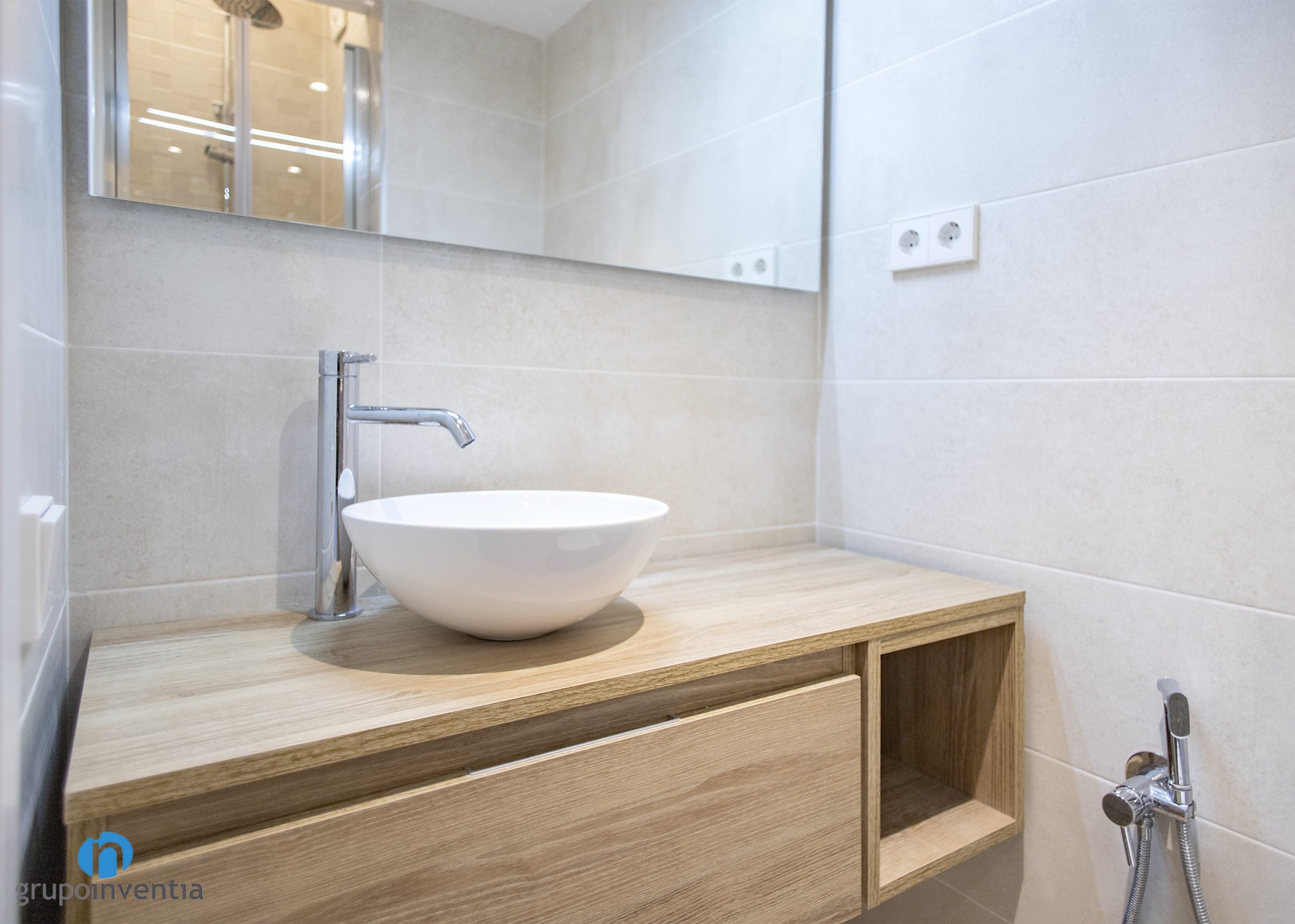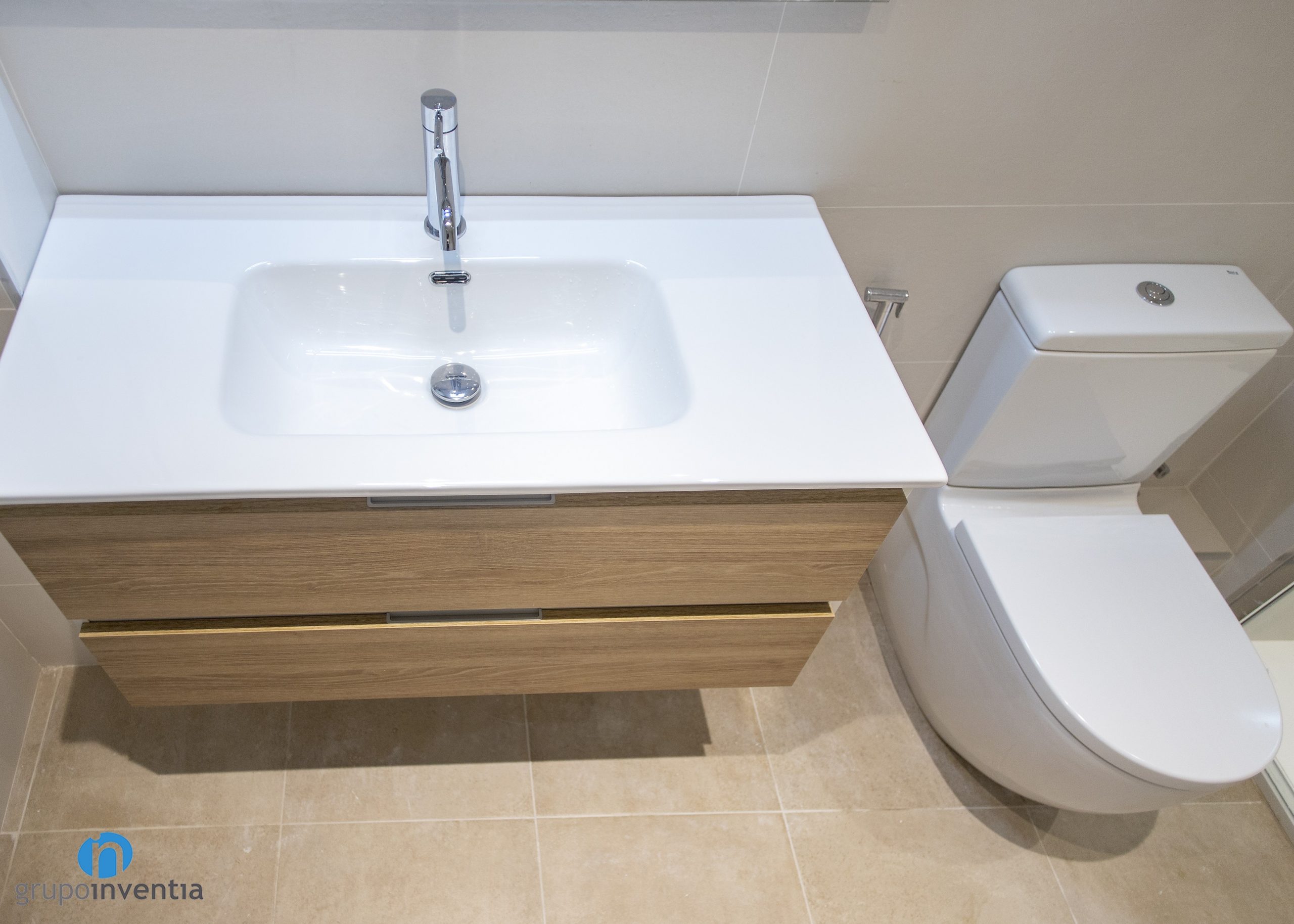 Els dos banys es van renovar tant en interiorisme com en equipament sanitari. Per a la nova imatge s’han utilitzat rajoles de color beige, els indicats per aconseguir espais amplis i lluminosos. L’estil neutre permet utilitzar altres materials, en aquests casos els mobles de bany presenten acabats en fusta.