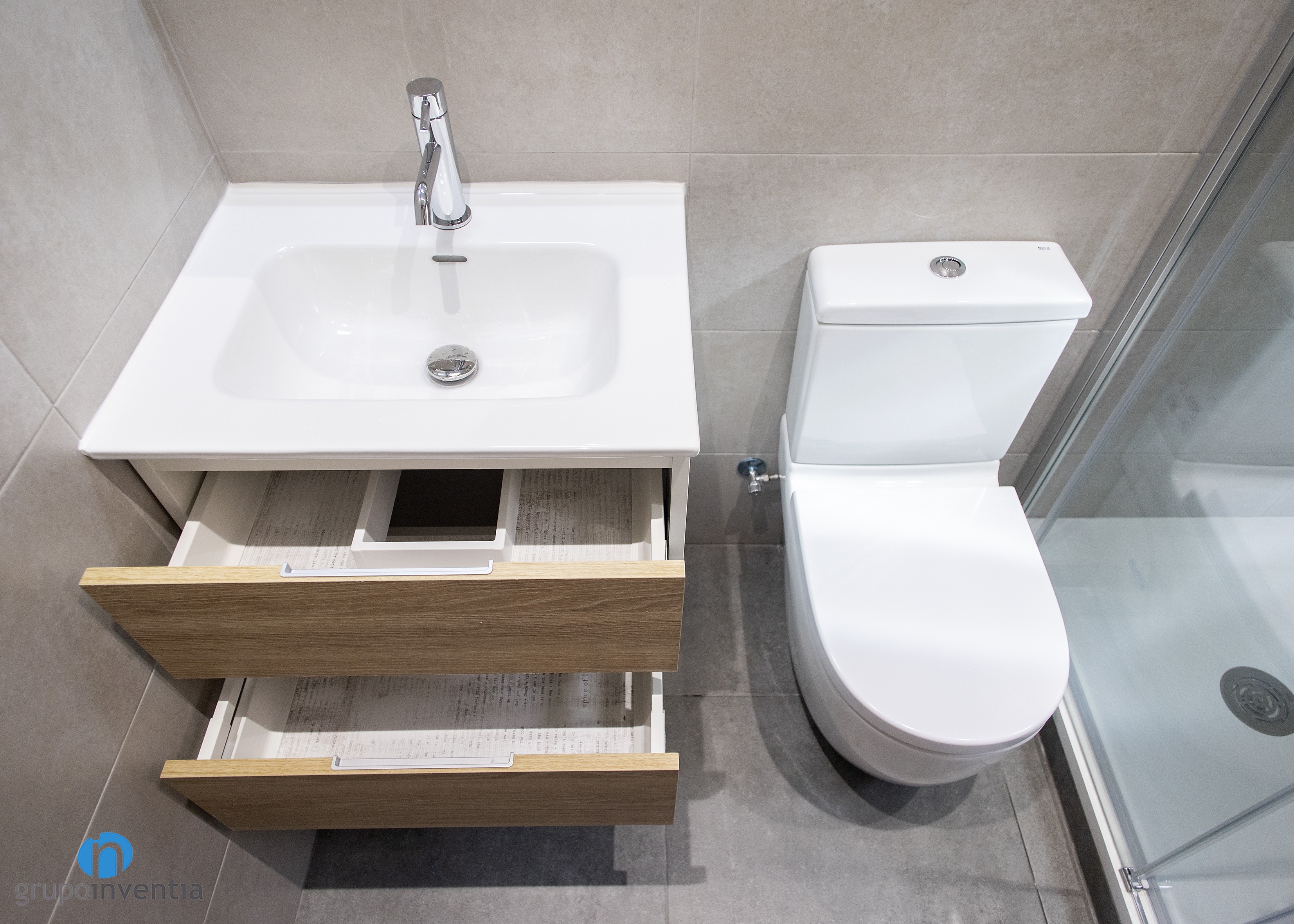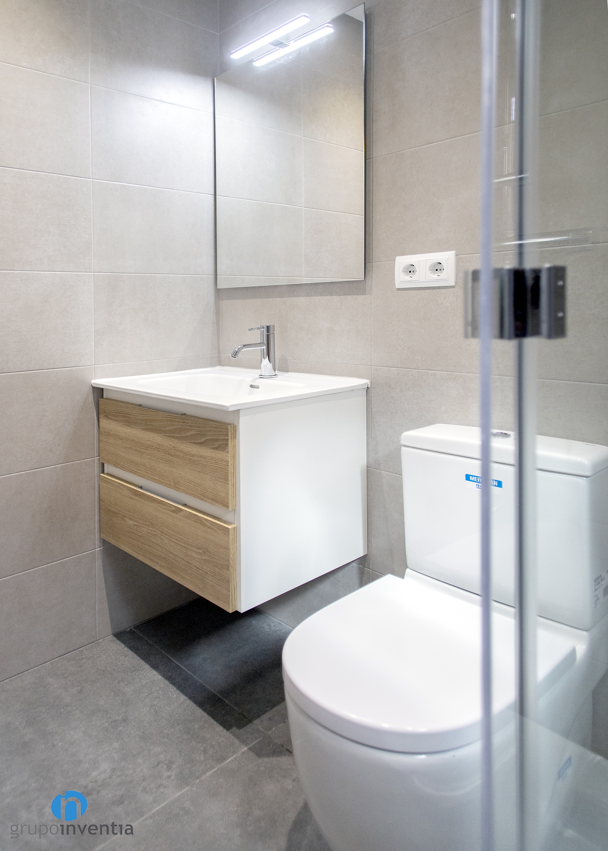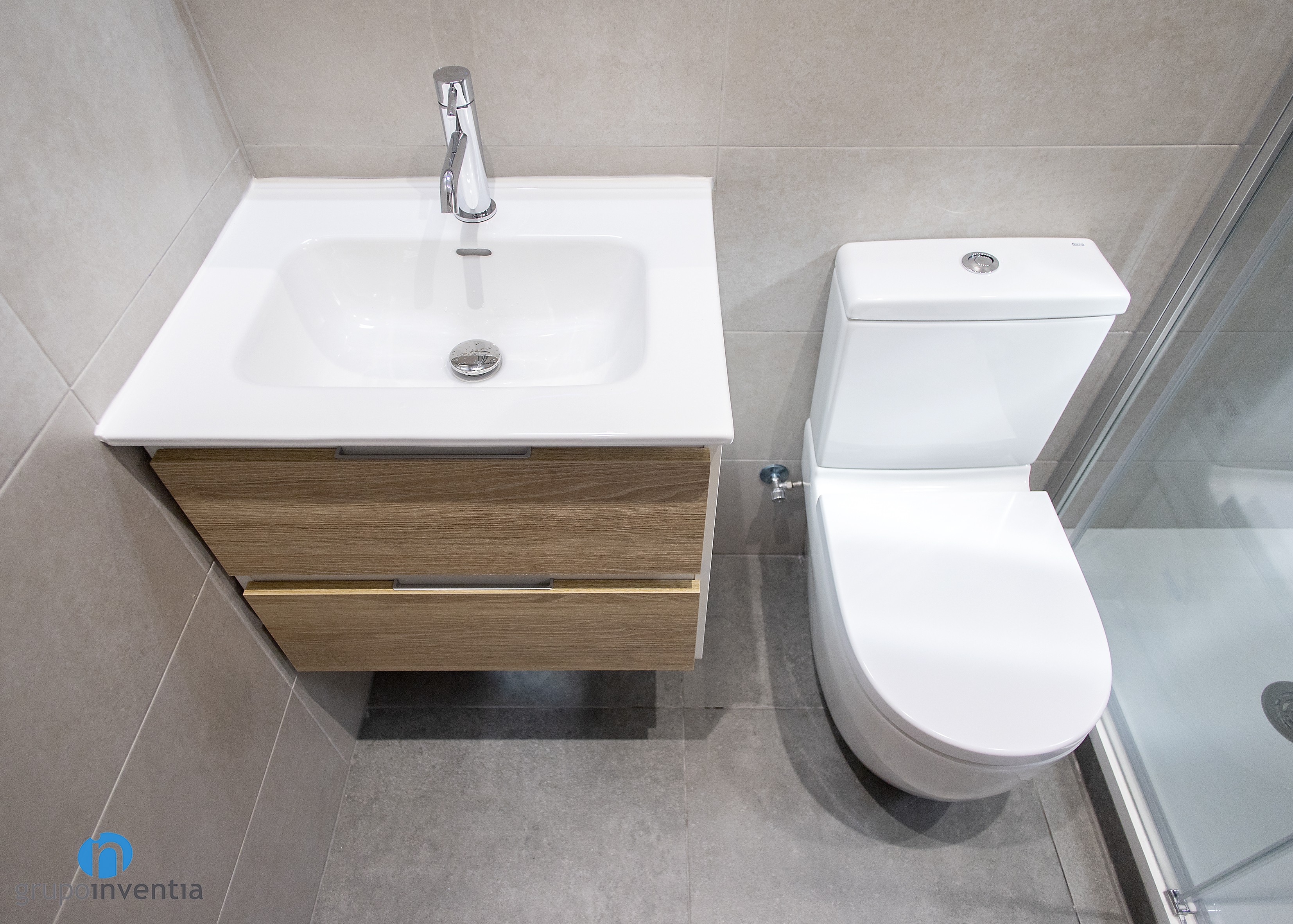 L’habitatge comptava amb una cambra de bany que es va renovar per complet tant en imatge com en equipament sanitari. Una de les peces d’aquest és un lavabo amb moble calaixera incorporat, la millor opció per poder organitzar tot tipus de productes d’higiene. A ell li segueixen un vàter d’imatge clàssica i una dutxa protegida per mampares de portes corredisses.