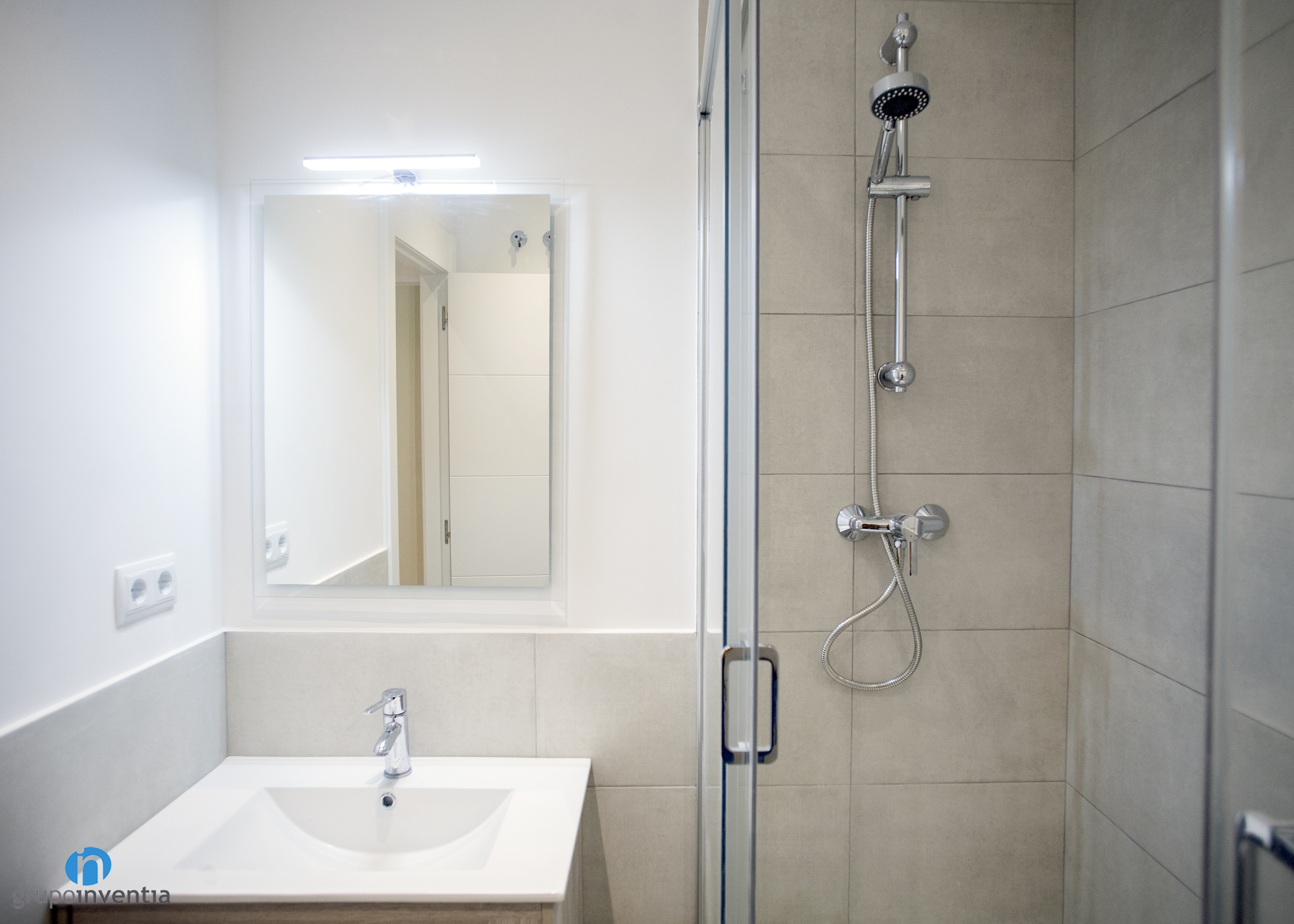La cambra de bany també es va renovar per complet tant en imatge com en equipament sanitari. Aquest últim està compost per un lavabo amb moble d’emmagatzematge incorporat, un vàter i una dutxa. Aquesta està protegida amb una mampara de portes corredisses.