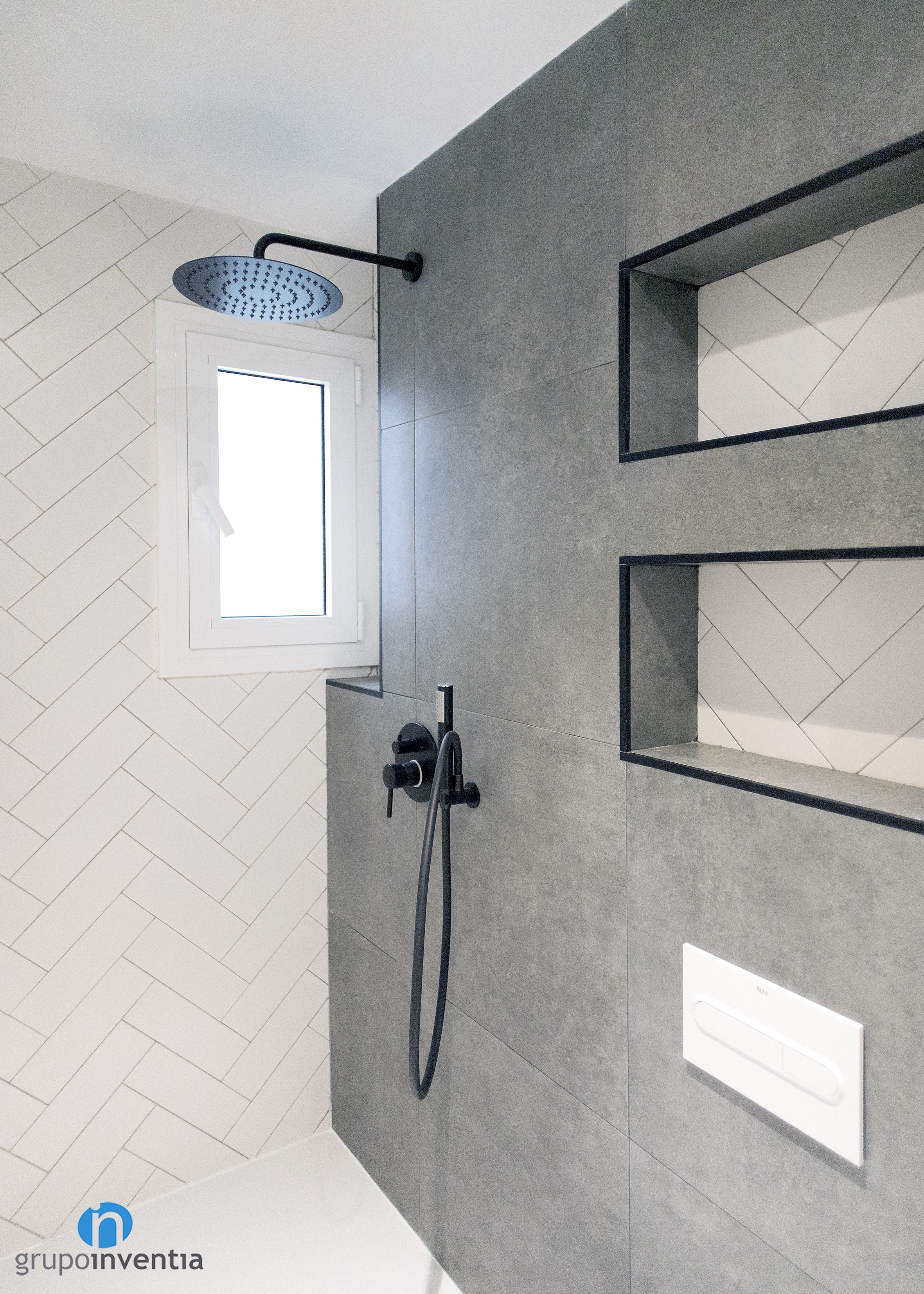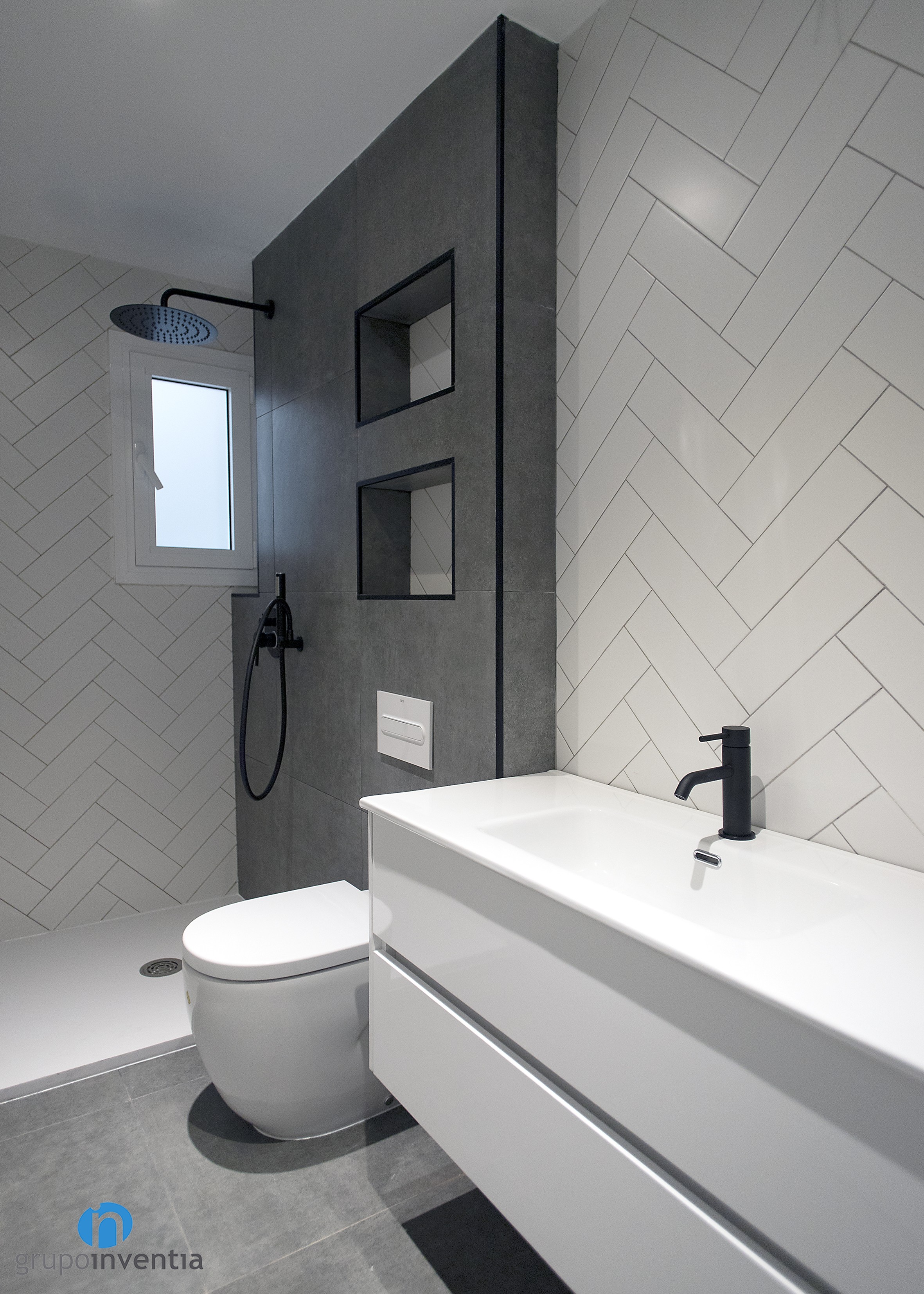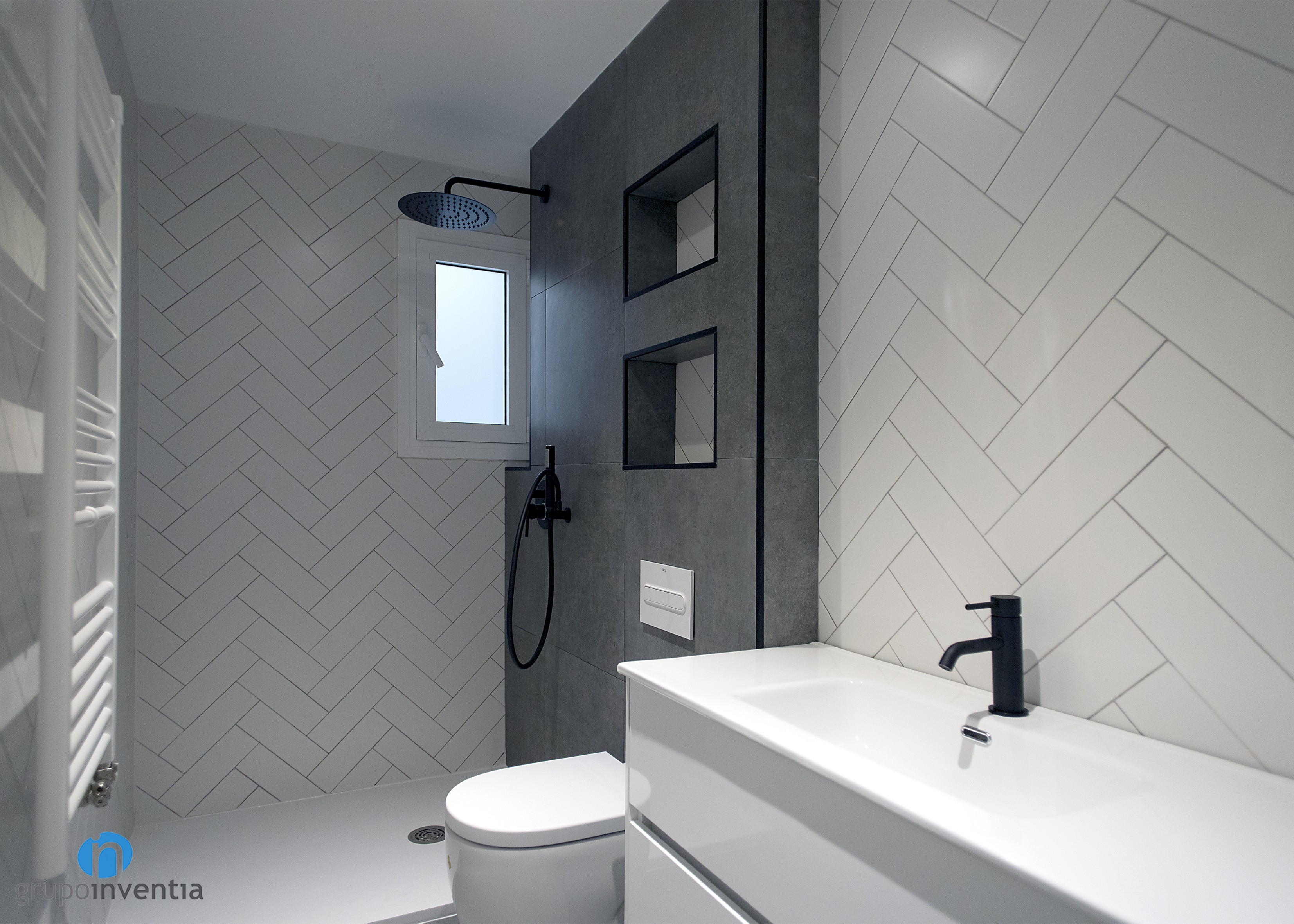 Per a l’equipament sanitari, aquesta reforma de bany es va equipar amb un lavabo amb moble d’emmagatzematge incorporat, un vàter suspès i una dutxa oberta. En aquest útlim element dstacan seus elements, de color negre mat. Sens dubte es va aconseguir un espai a punt per oferir les millors prestacions des del primer dia.