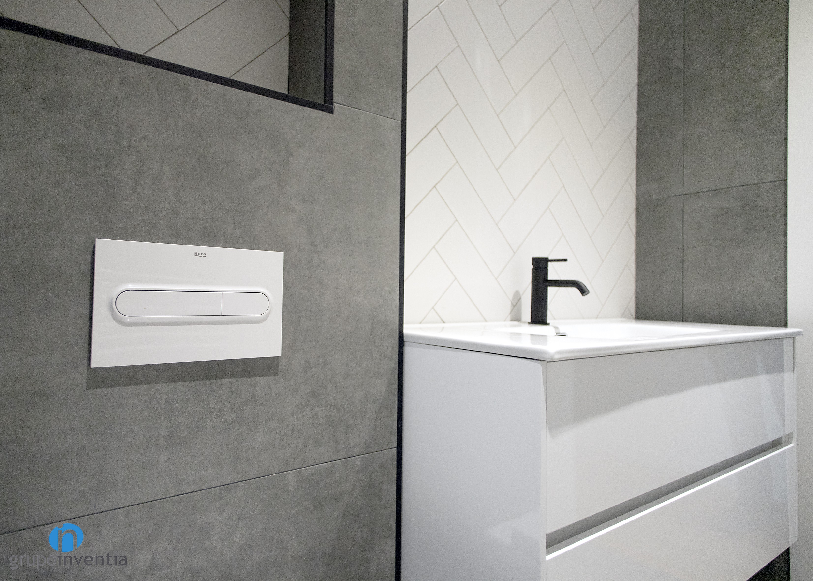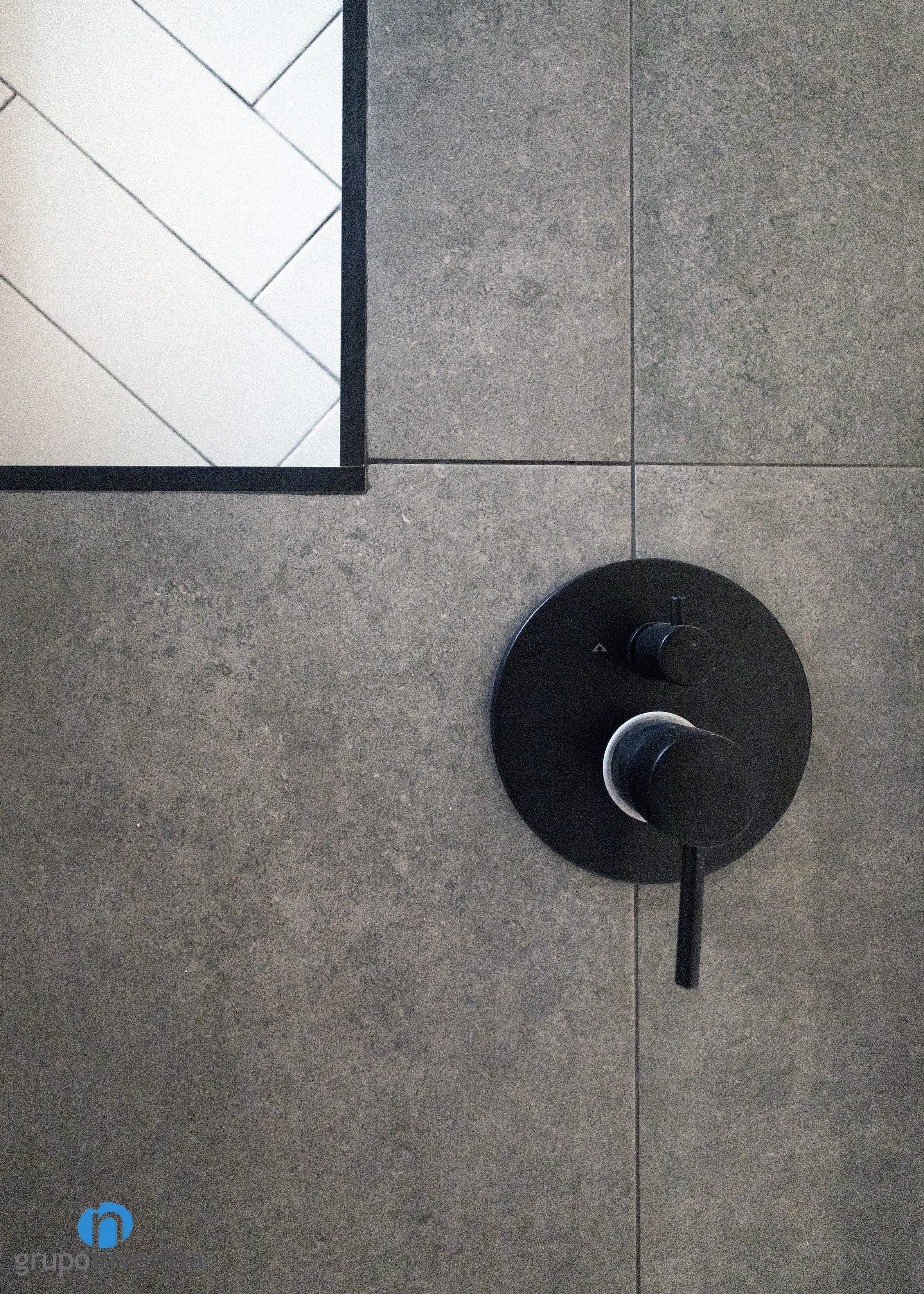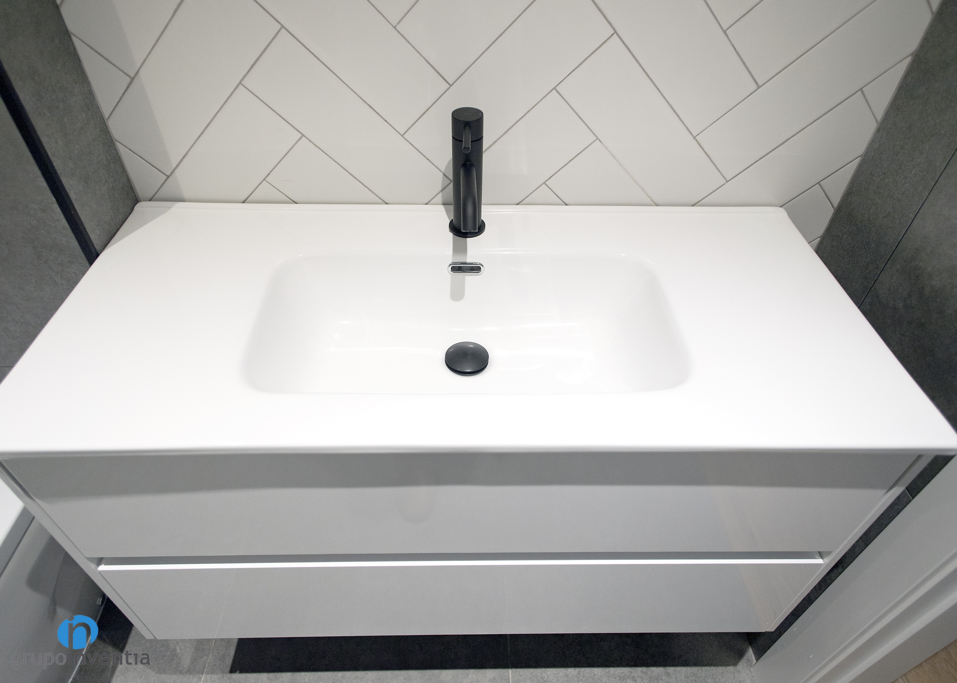Per a l’equipament sanitari, aquesta reforma de bany es va equipar amb un lavabo amb moble d’emmagatzematge incorporat, un vàter suspès i una dutxa oberta. En aquest útlim element dstacan seus elements, de color negre mat. Sens dubte es va aconseguir un espai a punt per oferir les millors prestacions des del primer dia.