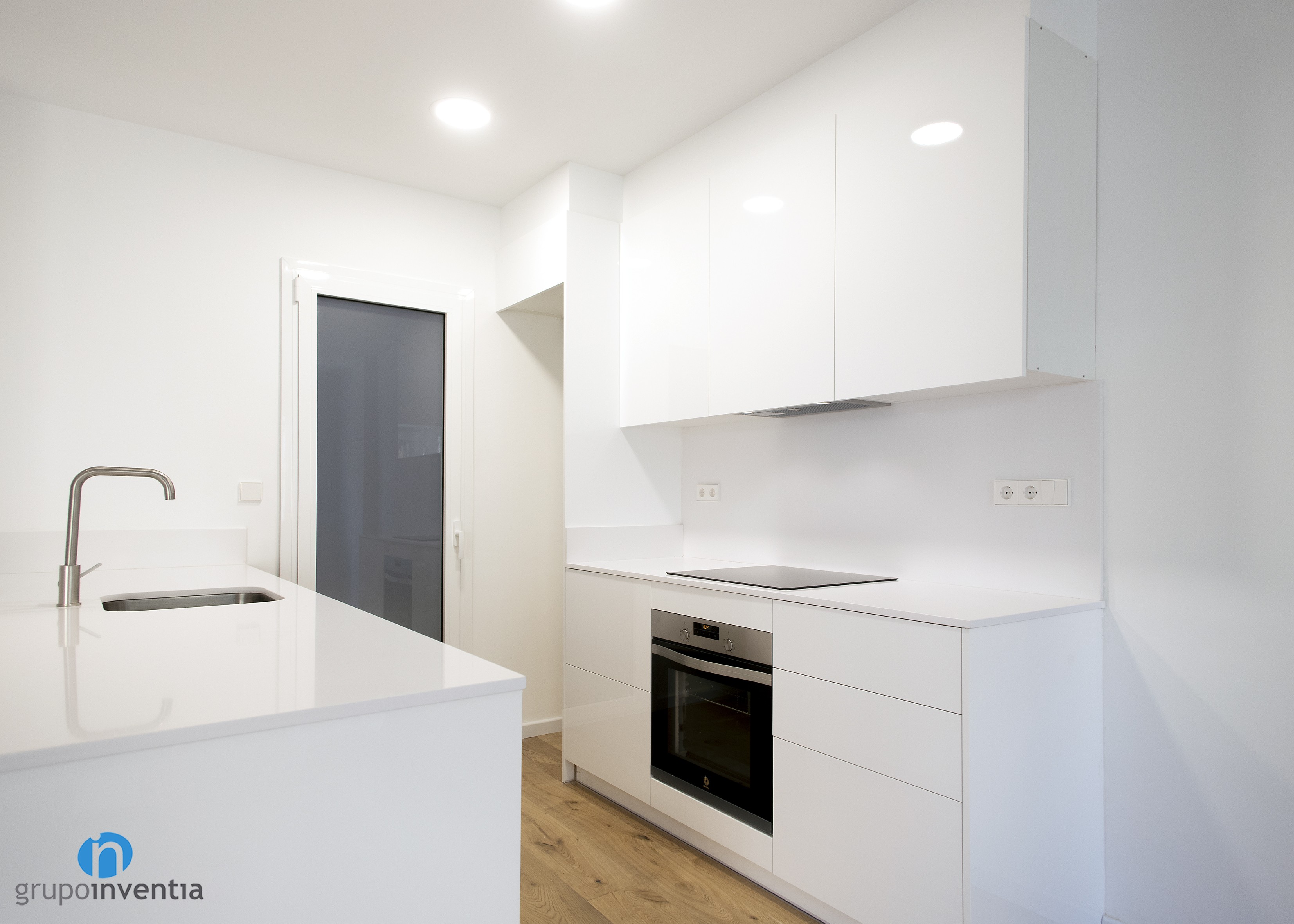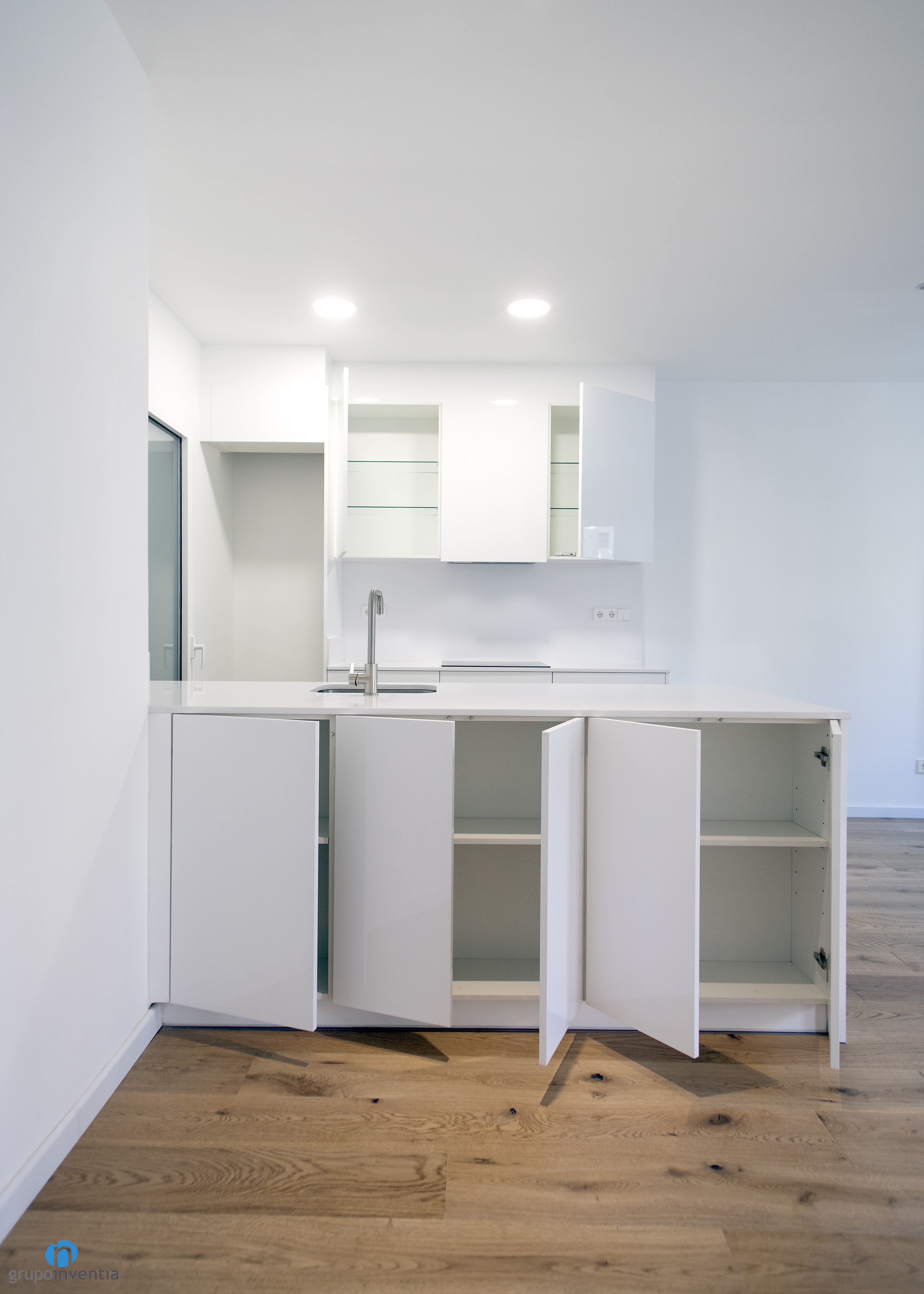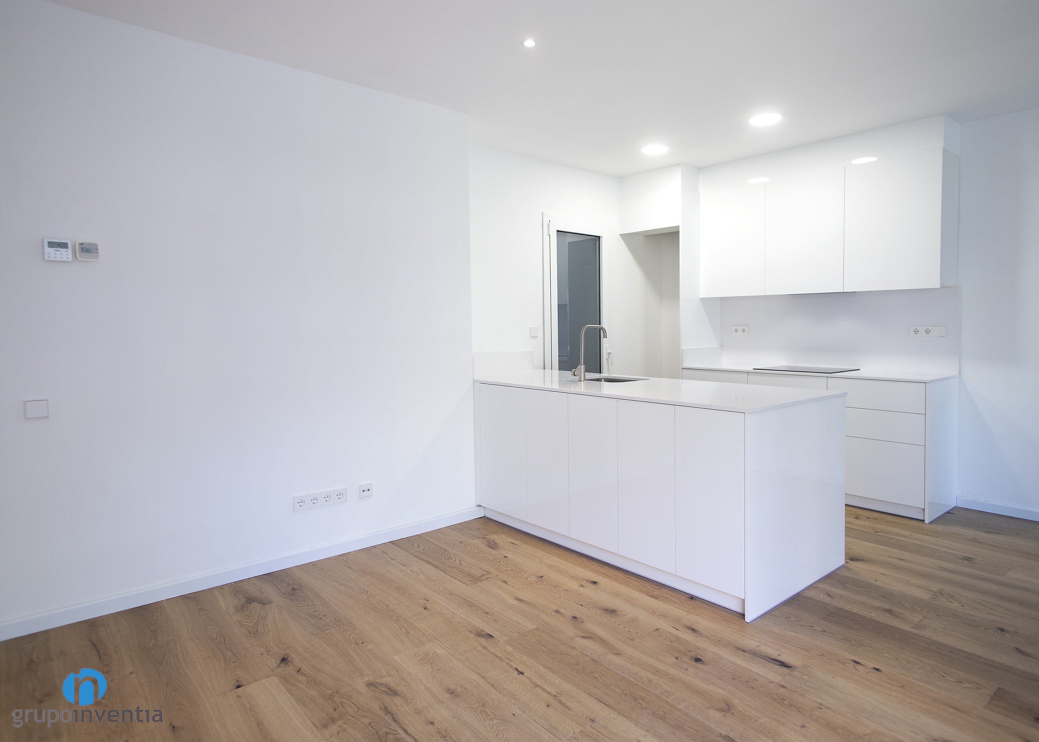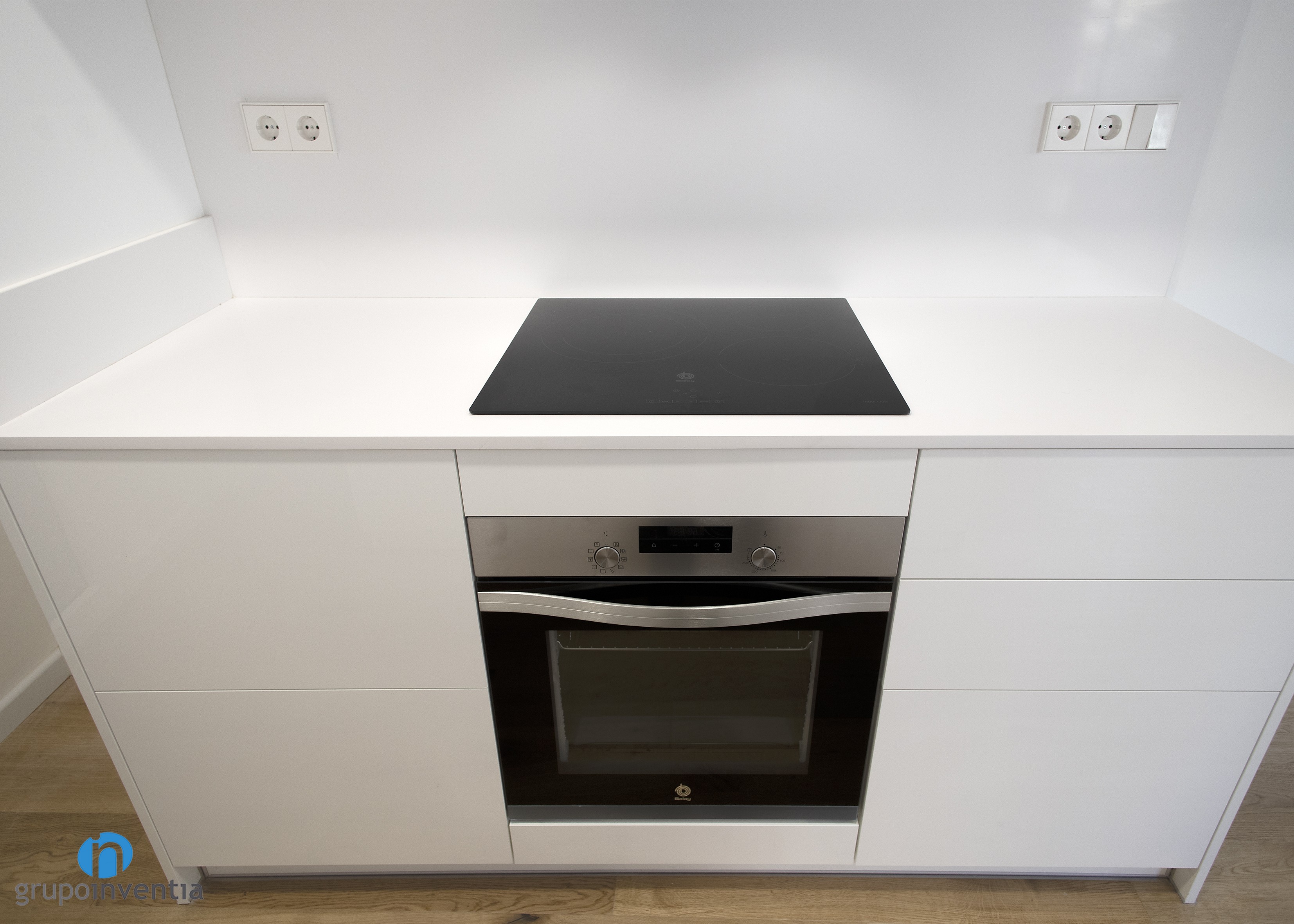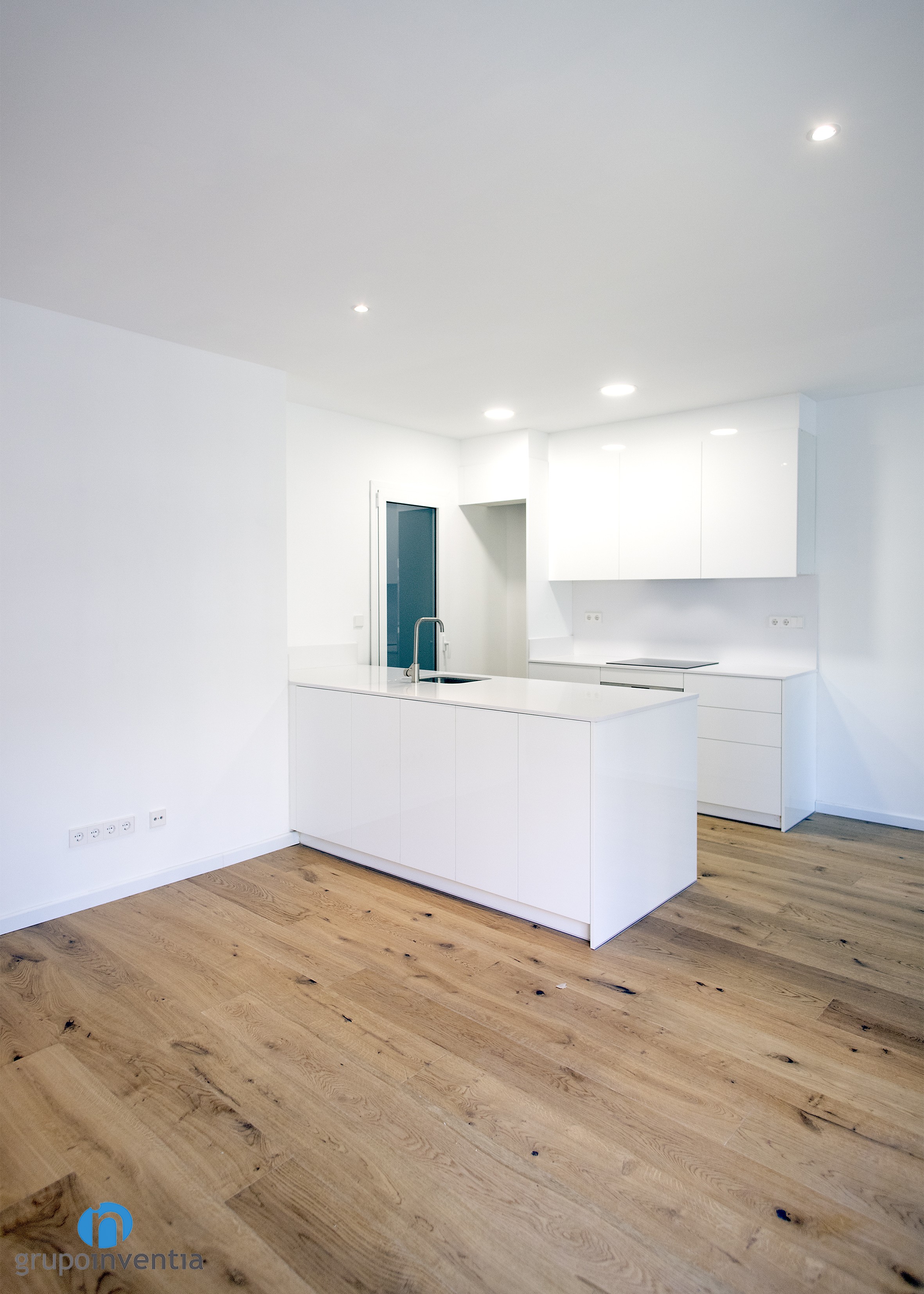 La reforma de cuina és oberta i està distribuïda a dos fronts. A la part de la paret es va col·locar un taulell equipat amb una placa vitroceràmica. Tant en la seva part inferior com superior es van col·locar armaris i calaixos per a l’emmagatzematge. A l’extrem es va disposar un buit a mida per encastar la nevera.